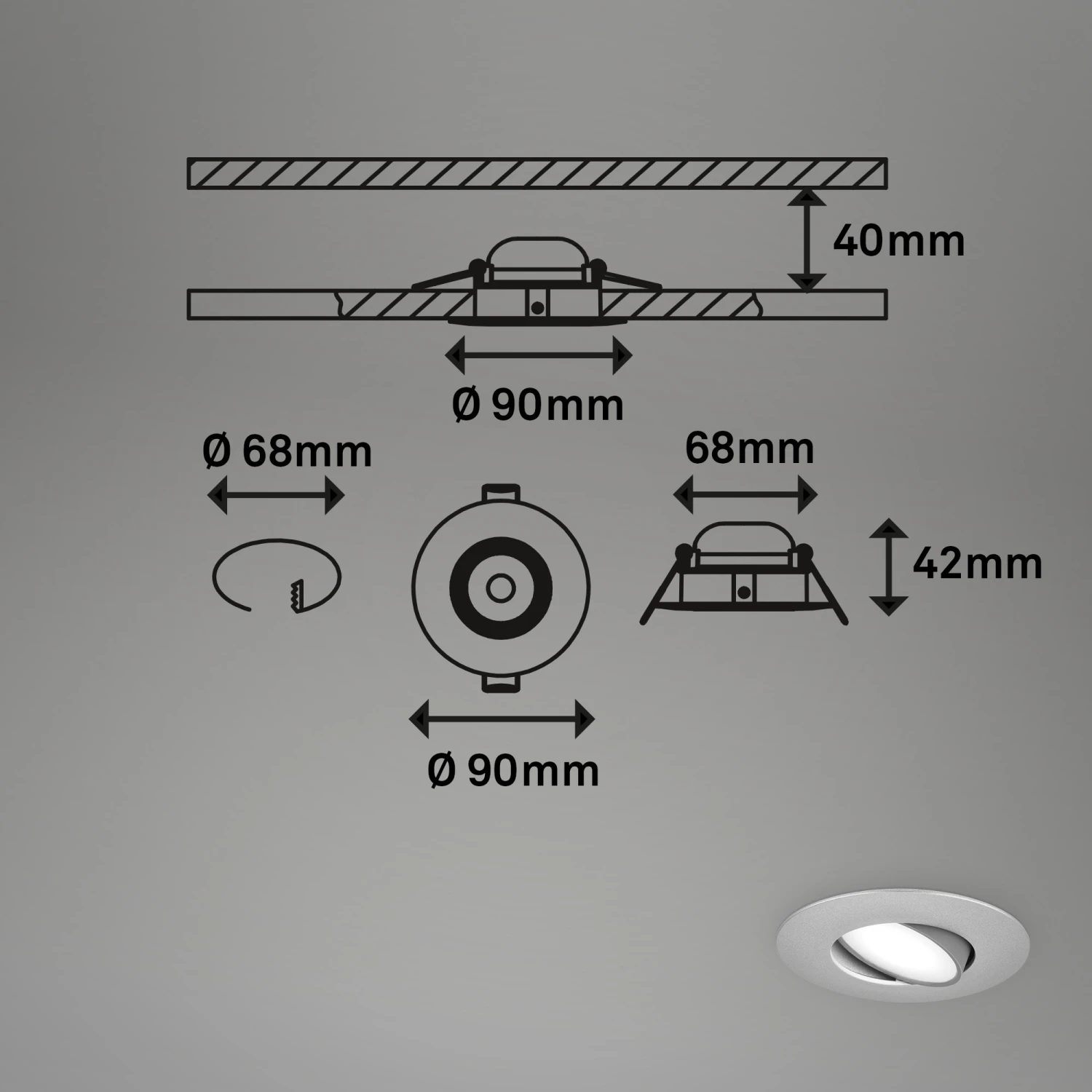 Ein besonderes Merkmal dieser LED Spots ist die stufenlose Dimmbarkeit, die es dem Benutzer ermöglicht, die Helligkeit via externen Dimmer nach Bedarf anzupassen. Dies ist besonders nützlich für verschiedene Anwendungen, wie z.B. für stimmungsvolle Beleuchtung beim Baden oder Lesen. Eine weitere Funktion dieser LED Feuchtraumleuchten ist die Schwenkbarkeit. Durch die Möglichkeit, die Leuchten in verschiedene Richtungen zu drehen, kann das Licht auf bestimmte Bereiche gelenkt werden. Das LED Einbauleuchten 3er-Set ist mit der Schutzart IP65 ausgestattet, was bedeutet, dass es gegen Eindringen von Staub und Spritzwasser geschützt ist. Dies macht die Einbauspots ideal für die Verwendung in Badezimmern, Duschen, Küchen und anderen feuchten Umgebungen. Die LED Strahler haben die Abmessungen 90x45mm (DxH) und die Einbaumaße 68x50mm (DxH). 480 Lumen bei 4,9 Watt und einer neutralweißen Farbtemperatur von 3000K bieten ein klares Licht.