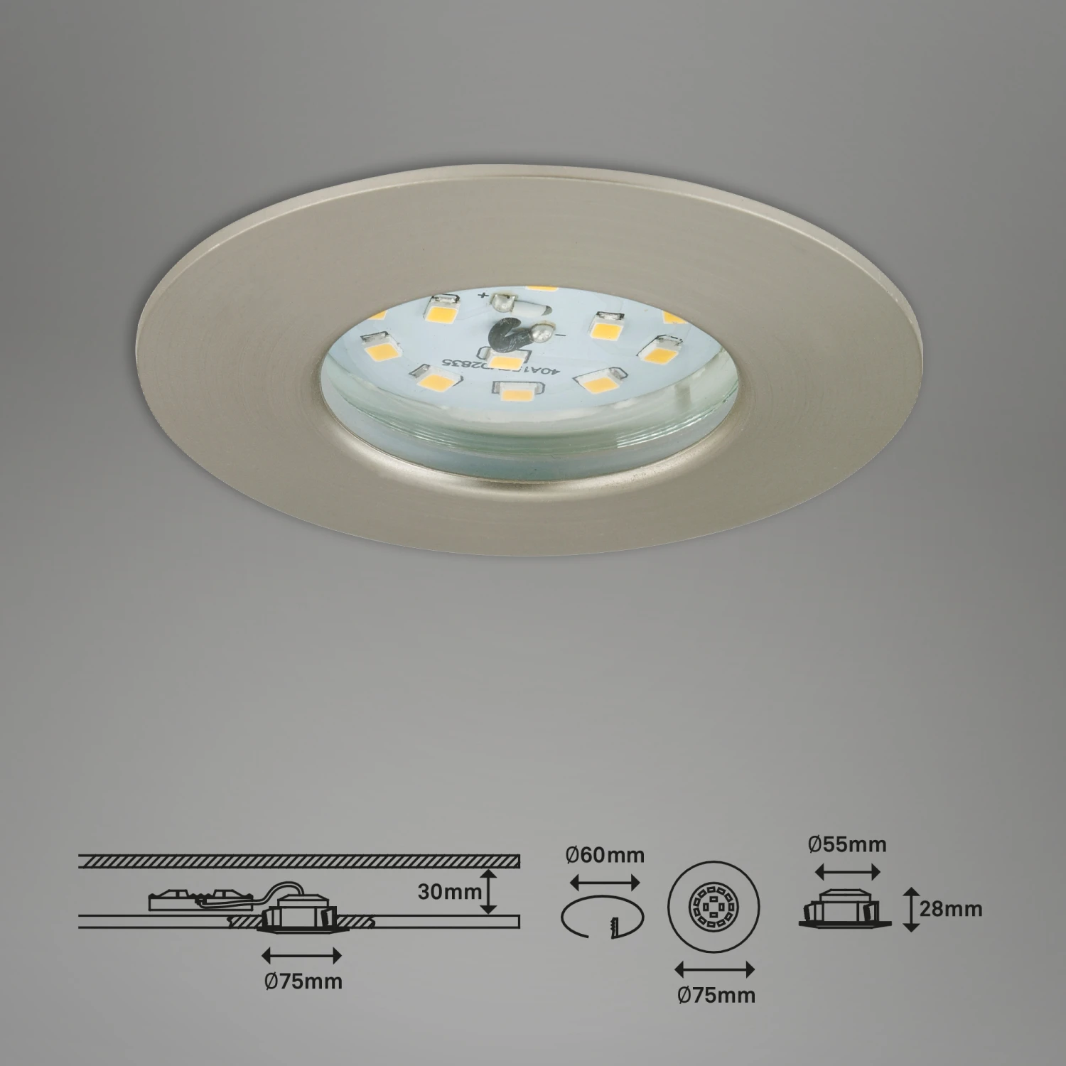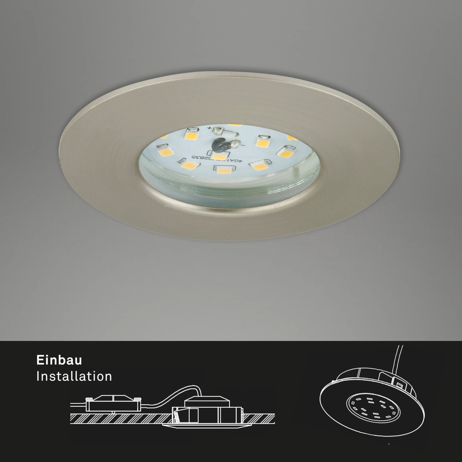 – und erweiterbar. Durch die Schutzart IP44 (spritzwasser geschützt) sind diese LED Einbauleuchten Badezimmer / Bad geeignet. Zusätzlich erhältlich: Diffusor-Aufsatz unter folgender Artikelnummer 7223-060 und Linse zur Verkleinerung oder Vergrößerung des Lichtkegels unter den Artikelnummern 7267-000 und 7268-000 Produktmaße: 75x28mm (DxH), Material: Kunststoff, Farbe: Matt Nickel