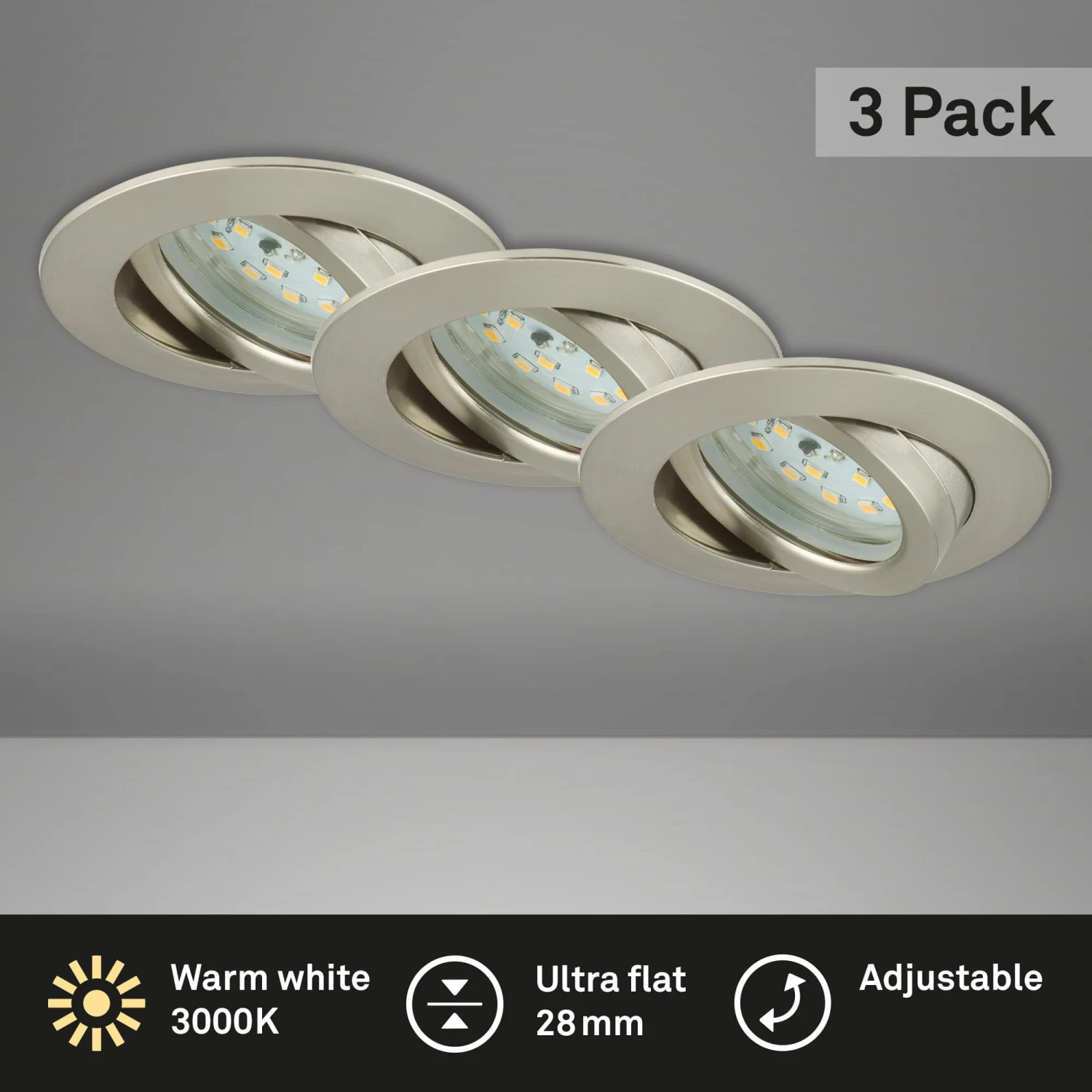 Unaufdringlich edel: Dieses LED Deckeneinbauleuchten 3er Set verleiht mit seinem klaren Design in mattem Finish jedem Einrichtungskonzept das gewisse Extra Durch eine geringe Einbautiefe von nur 30 mm, sind Die Deckenspots vielseitig einsetzbar. Durch die geringe Wärmeentwicklung, können diese LED Einbaustrahler auch in Holzdecken verbaut werden. Für diese Spots ist kein Trafo notwendig. Sie werden direkt an das 230V Stromnetz angeschlossen. Dies ist ohne Probleme möglich durch die bereits mit der Lampe verbundenen Anschlussbox (Terminalbox). Diese LED Decken-Strahler sind beliebig positionier-, kombinier