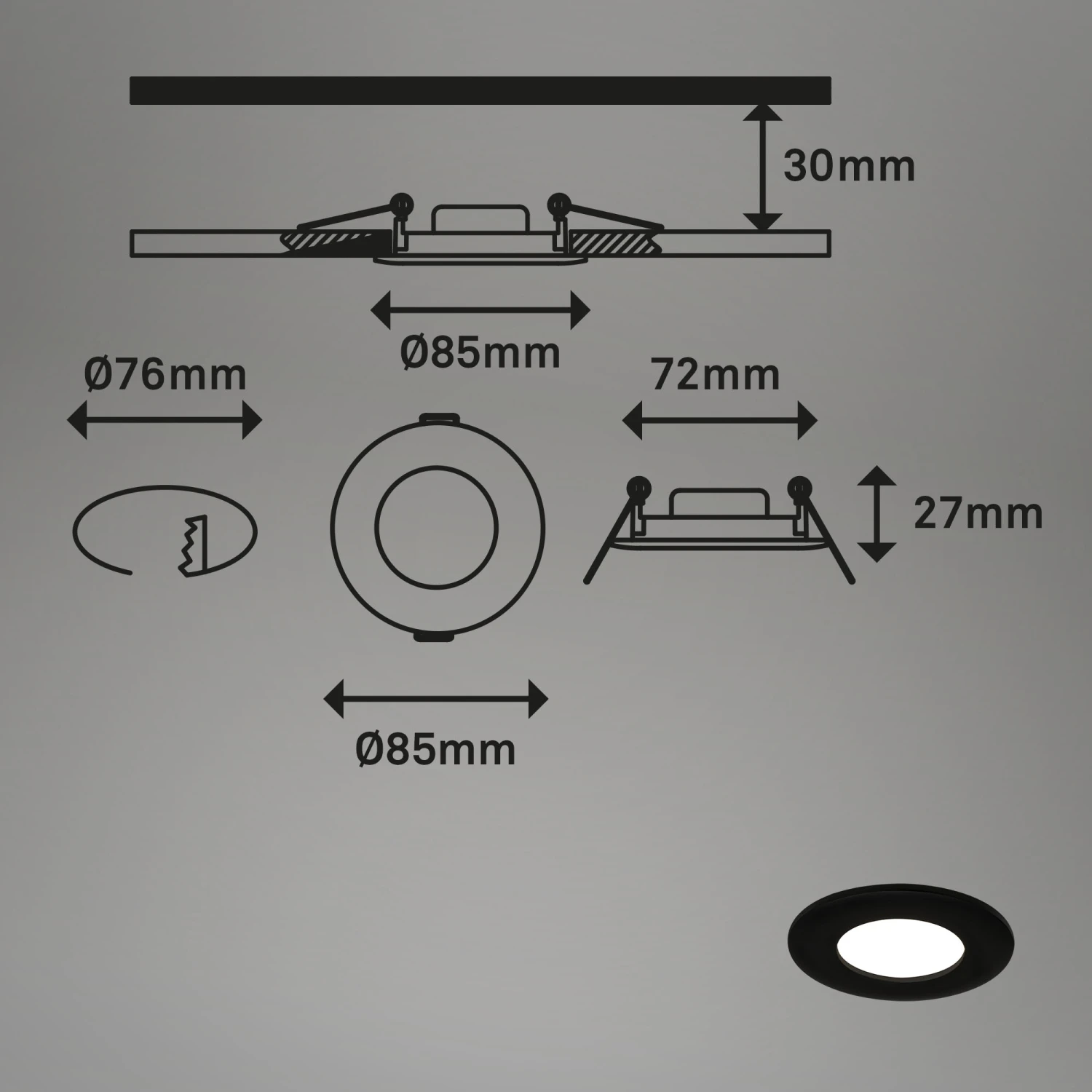 – Lichtschalter durchgeschaltet. Betätigen Sie einfach mehrmals Ihren Lichtschalter (Ein/Aus) und die Stufen werden angewählt. Eine Memoryfunktion speichert für das nächste Einschalten die zuletzt genutzte Dimmstufe, wenn die LED Leuchten länger als 5 Sekunden abgeschaltet sind. Die LED-Einbaulampen fügen sich durch ihre ultraflache Form gut in Ihr Wohnzimmer, Schlafzimmer oder Ihren Flur ein. Durch die Schutzart IP44 können sie auch als Badleuchten eingesetzt werden. Mit je 5 Watt und je 450 Lumen Lichtleistung überzeugen die LED-Module auf ganzer Linie. Mit einer Farbtemperatur von 4.000 Kelvin wird ein neutralweißer Lichtton erzeugt. Die durchschnittliche Lebensdauer beträgt etwa 25.000 Stunden. Die LED-Spots sind ultraflach, mit Produktabmessungen von 85×25 mm (DxH), und Einbaumaßen von 75×30 mm (DxH). Die Produktfarbe ist Schwarz-Matt.