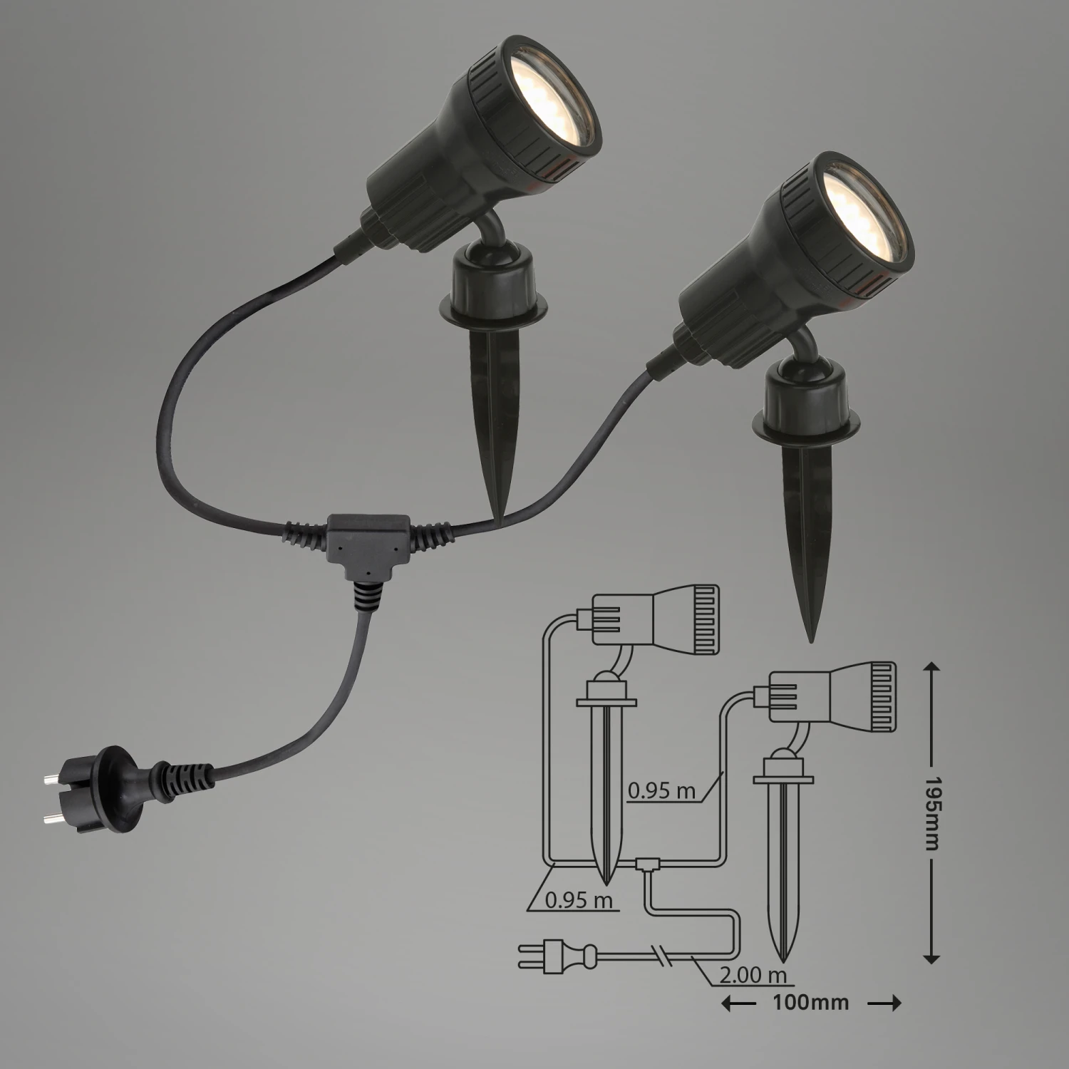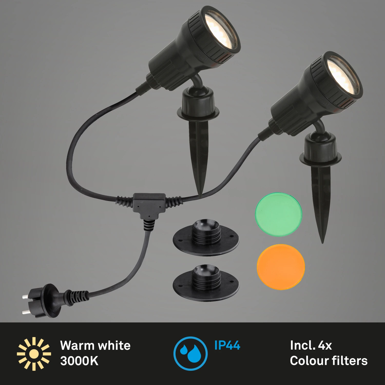 – Gartenspots inkl. Erdspieß und Wandhalterung. Des Weiteren wird je ein orangener und grüner Farbfilter je Spot mitgeliefert.