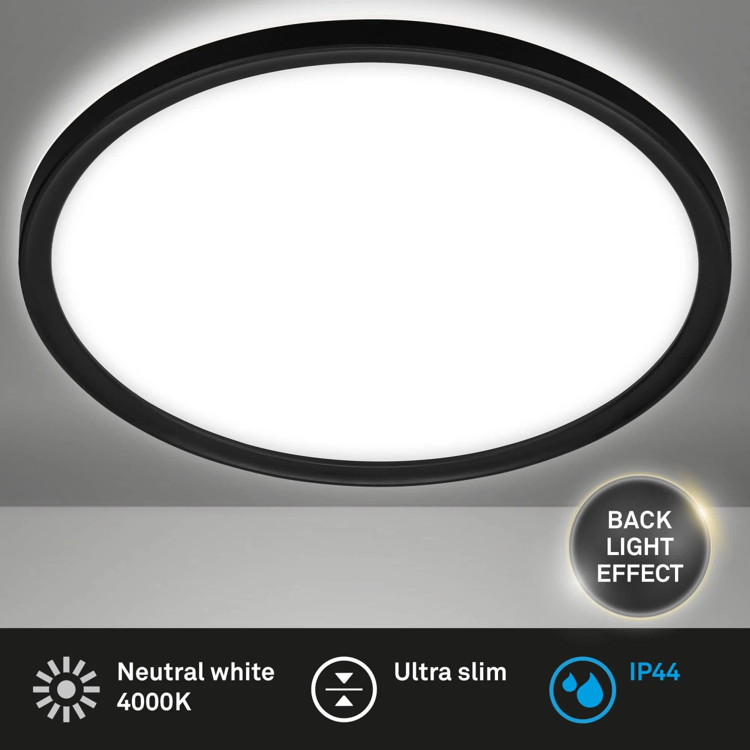 Die Hintergrundbeleuchtung dieser modernen LED Bad Deckenleuchte mit schwarzem Rahmen sorgt für einen schönen, indirekten Lichteffekt an Ihrer Decke. Die LED Bad Deckenlampe ist mit 3,5 cm Höhe extrem flach. Die IP44-Zertifizierung der LED Deckenlampe bedeutet, dass sie spritzwassergeschützt ist. Damit eignet sich die LED Badezimmerleuchte perfekt für Bad, Gästebad und Küche. Die neutralweiße Farbtemperatur von 4000 Kelvin eignet sich für Arbeitszimmer, Büro, Flur und Werkstatt. Die Helligkeit ist dank der 18 Watt und 2400 Lumen außerordentlich Die Produktabmessungen der runden Badleuchte mit Hintergrundbeleuchtung und schwarzem Rahmen betragen 290×35 mm (DxH)
