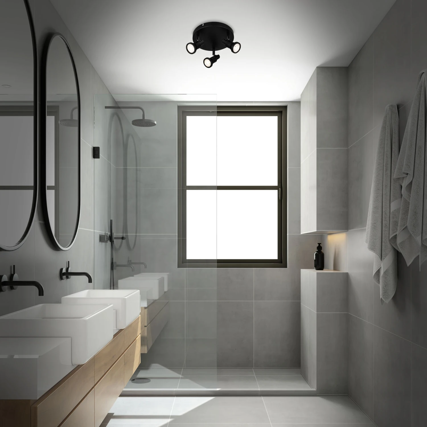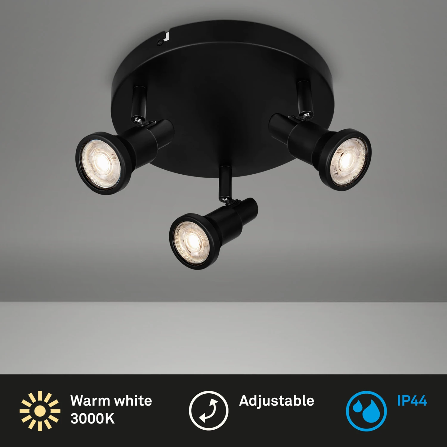 Die mattschwarze, 3-flammige Deckenlampe hat die Schutzart IP44 und ist damit perfekt für den Einsatz im Bad, Gästebad oder in der Küche geeignet. Die Strahler der Badleuchte sind verstellbar, so dass die Ausleuchtung individuell verändert werden kann. Jede der 4,8-Watt-GU10-Birnen hat eine warmweiße Farbtemperatur von 3000 Kelvin und eine Helligkeit von 400 Lumen. Die LED Spotleuchte eignet sich auch für den Einsatz in Wohnräumen wie Wohnzimmer, Flur und Schlafzimmer. Die Abmessungen der 3-flammigen LED-Badleuchte betragen 210×106 mm (DxH).