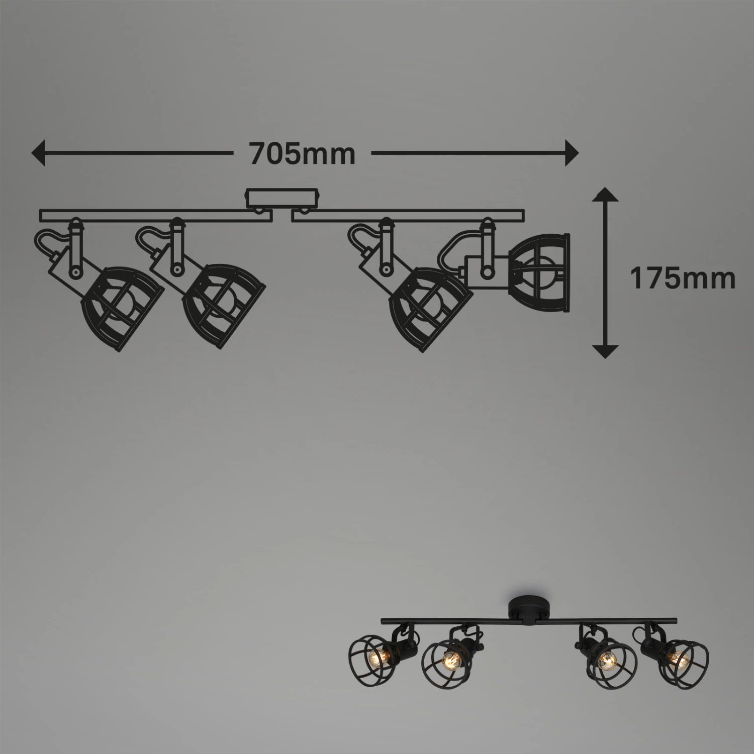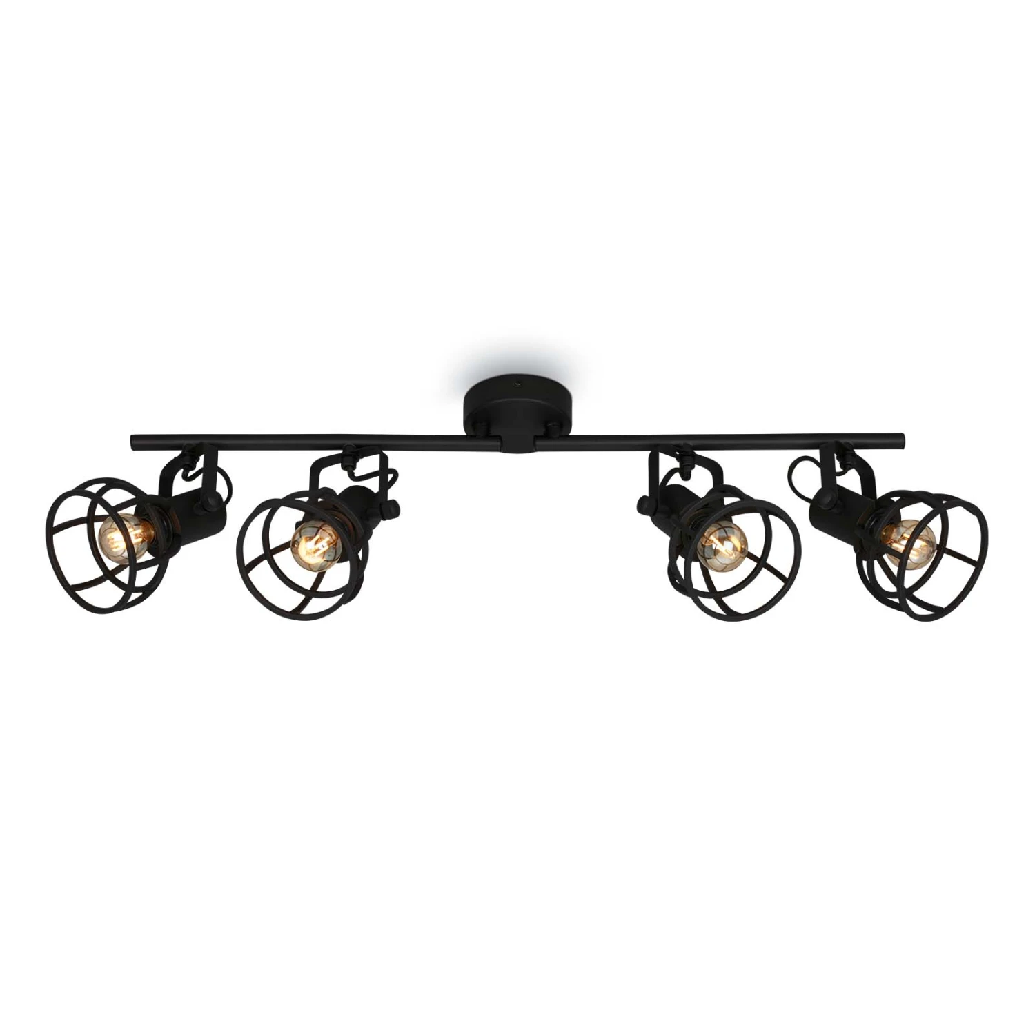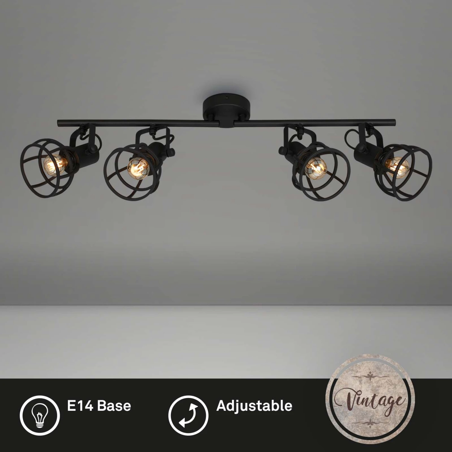Diese schwarze Spotleuchte bringt ein edles und gleichzeitig rustikales Ambiente in Ihren Wohnbereich Â? das edle, schwarze Design mit den rustikalen Lampenschirmen aus Stahl sorgt schnell für einen Hingucker. Die Deckenlampe setzt mit ihrem Retrolook stilvolle Akzente in Ihren Wohnraum. Die Wohnzimmerleuchte verfügt über eine E14 Fassung