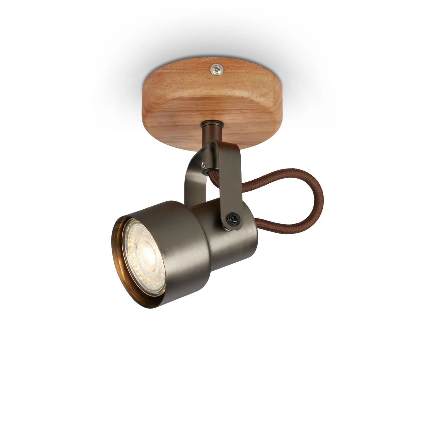 Diese graue Spotleuchte mit hellem Holzbaldachin bringt ein edles und gleichzeitig rustikales Ambiente in Ihren Wohnbereich Â? das edle Design mit dem rustikalen Lampenschirm in mattem Grau, sorgt schnell für einen Hingucker. Die Flurleuchte setzt mit ihrem Retrolook stilvolle Akzente in Ihren Wohnraum. Die Leseleuchte verfügt über ein 5 Watt LED Leuchtmittel mit GU10 Fassung. Mit 3000 Kelvin leuchtet der LED Spot in einer warmweißen Lichtfarbe bei einer Helligkeit von 460 Lumen. Des Weiteren besitzt die Retroleuchte die Schutzart IP20 und ist ausschließlich für den Einsatz im Innenraum vorgesehen. Produktabmessungen: Durchmesser: 90 mm, Höhe: 127 mm