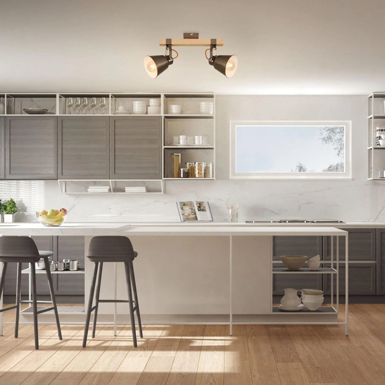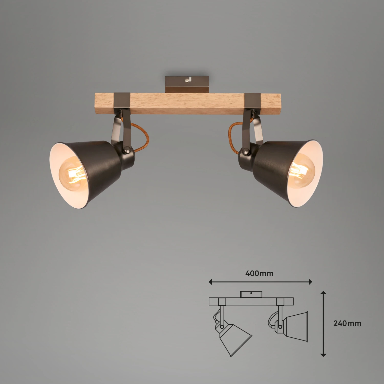 Diese graue Spotleuchte mit dunklem Holzbalken bringt ein edles und gleichzeitig rustikales Ambiente in Ihren Wohnbereich Â? das edle Design mit den rustikalen Lampenschirmen in mattem Grau, sorgt schnell für einen Hingucker. Die Deckenlampe setzt mit seinem Retrolook stilvolle Akzente in Ihrem Wohnraum. Die Wohnzimmerleuchte verfügt über eine E27 Fassung. Die maximale Wattage für die Lampe beträgt 40 Watt. Lichtfarbe und Helligkeit können Sie hierbei selbst bestimmen
