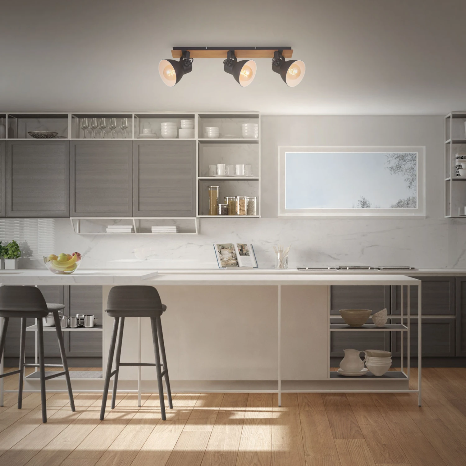 Diese schwarz-weiße Spotleuchte mit dunklem Holzbalken bringt ein edles und gleichzeitig rustikales Ambiente in Ihren Wohnbereich Â? das edle Design mit den rustikalen Lampenschirmen in mattem Schwarz, sorgt schnell für einen Hingucker. Die Deckenlampe setzt mit ihrem Retrolook stilvolle Akzente in Ihren Wohnraum. Die Wohnzimmerleuchte verfügt über eine E27 Fassung. Die maximale Wattage für die Lampe beträgt 40 Watt. Lichtfarbe und Helligkeit können Sie hierbei selbst bestimmen