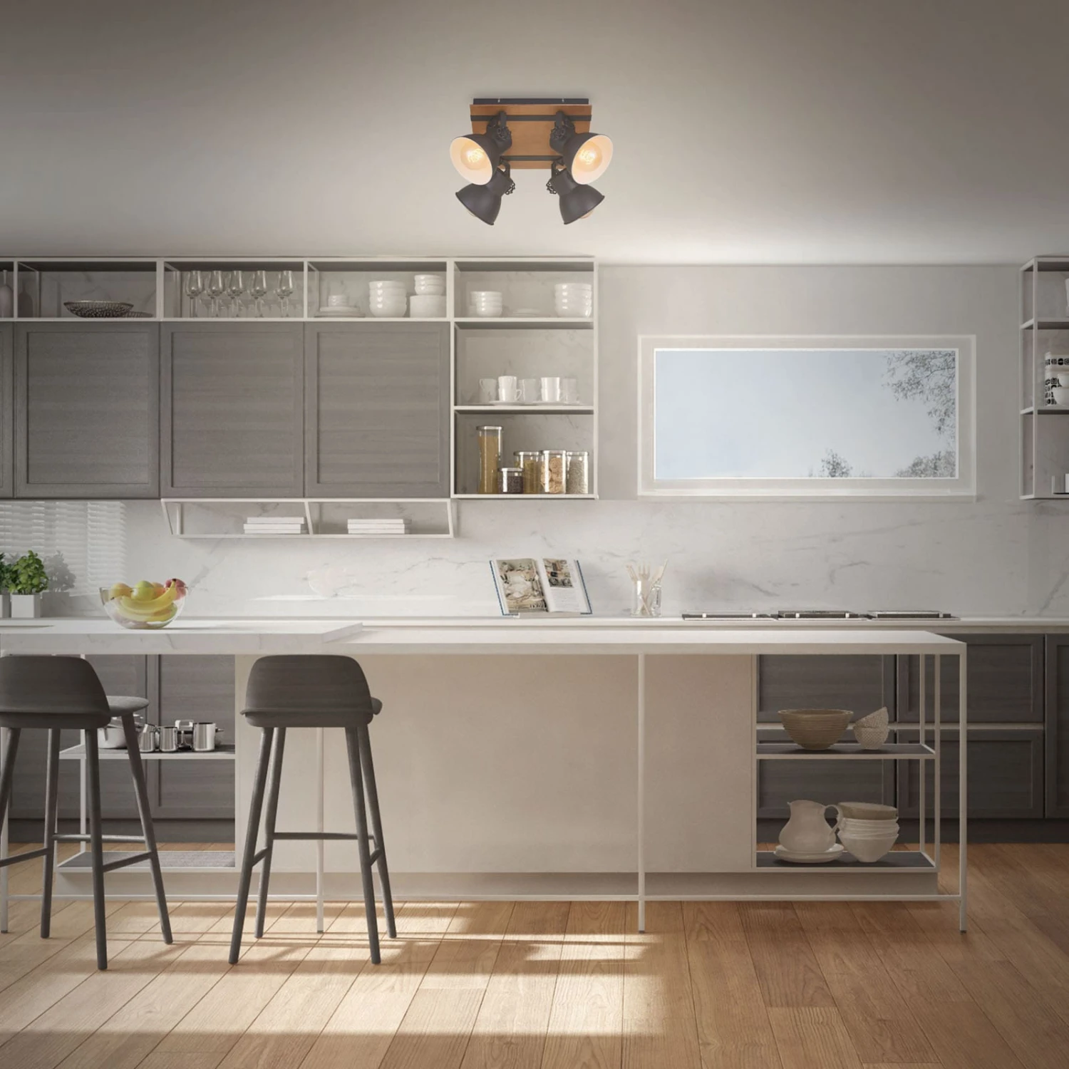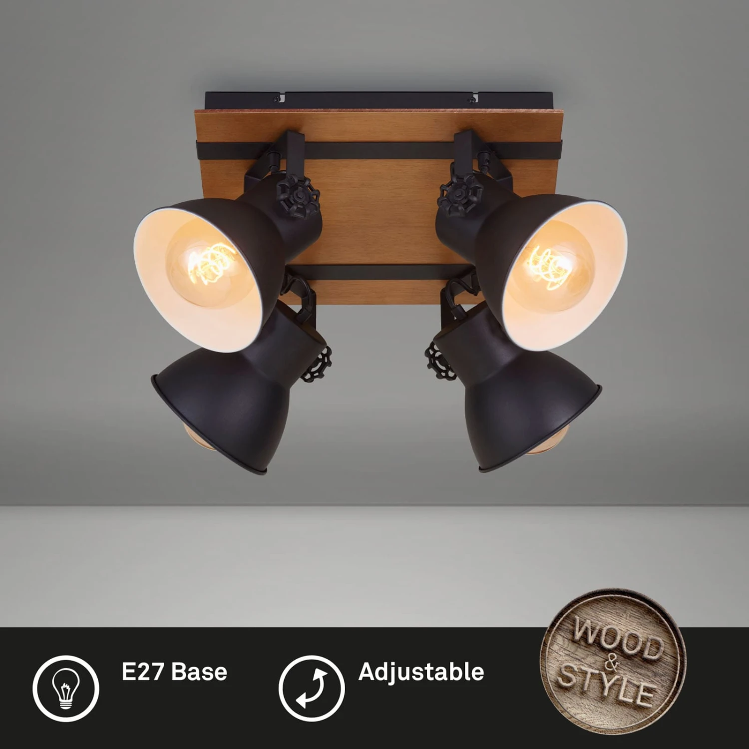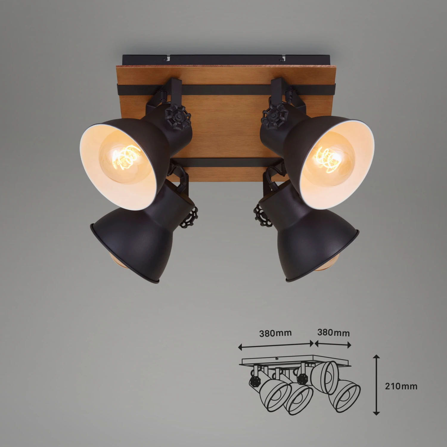 Diese quadratische, schwarz-weiße Spotleuchte mit dunklem Holzbalken bringt ein edles und gleichzeitig rustikales Ambiente in Ihren Wohnbereich Â? das edle Design mit den rustikalen Lampenschirmen in mattem Schwarz, sorgt schnell für einen Hingucker. Die Deckenlampe setzt mit ihrem Retrolook stilvolle Akzente in Ihren Wohnraum. Die Wohnzimmerleuchte verfügt über eine E27 Fassung. Die maximale Wattage für die Lampe beträgt 40 Watt. Lichtfarbe und Helligkeit können Sie hierbei selbst bestimmen