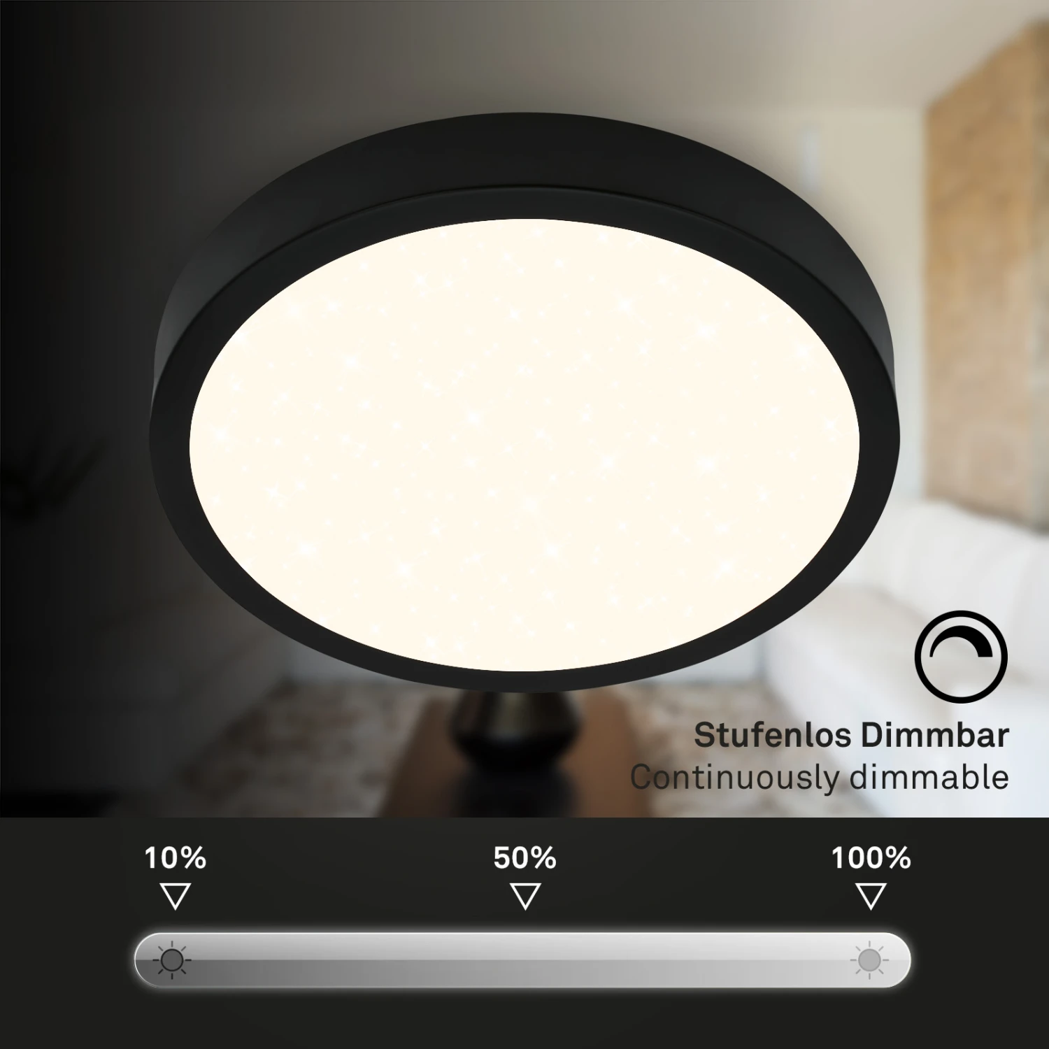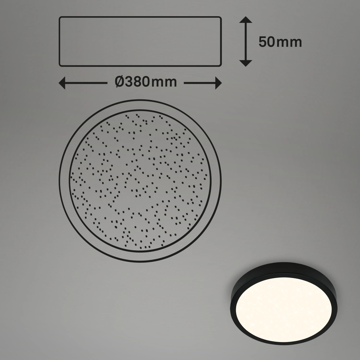 – und Schlafzimmer, da sie über eine Nachtlichtfunktion (niedrigste Dimmstufe, warmweißes Licht), einen Timer und einen Sterneffekt verfügt. Eine integrierte Memoryfunktion, speichert die per Fernbedienung gewählten Einstellungen für das nächste Einschalten via Wandschalter ab. Dadurch werden Ihre Parameter nach dem Ausschalten der LED Leuchte per Lichtschalter nicht zurückgesetzt. Mit einem Durchmesser von 380 mm und einer Höhe von 50 mm hat die LED-Deckenleuchte eine ansprechende Größe.