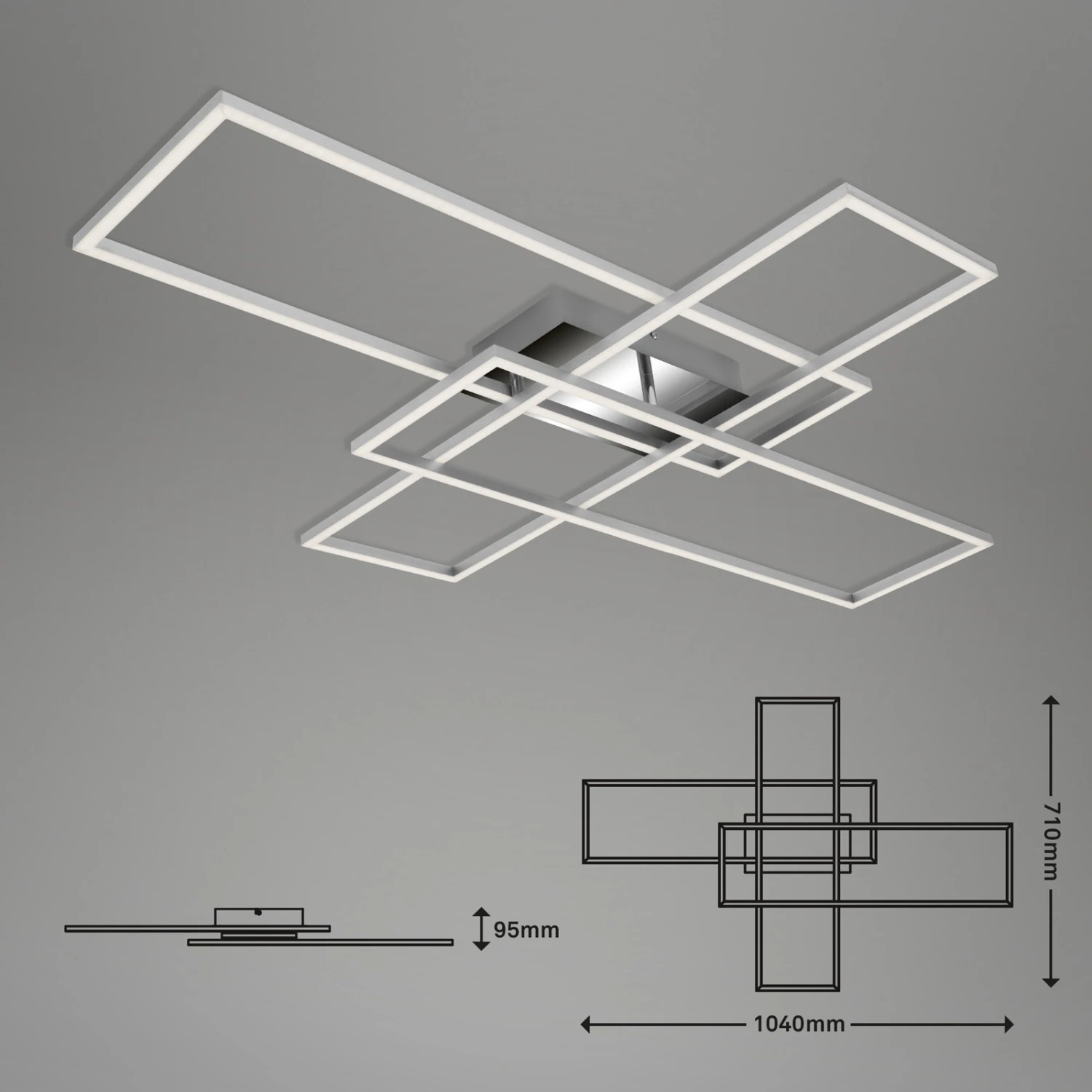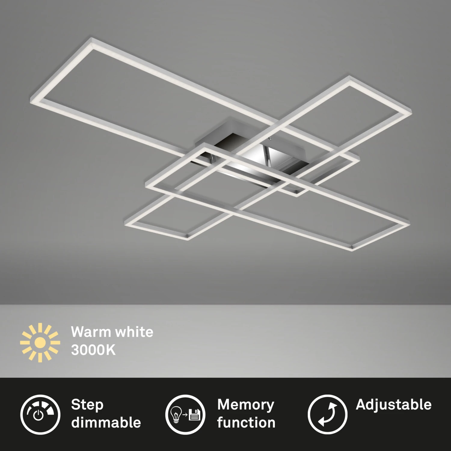 Mit ihrer optischen Gestaltung wird diese Deckenleuchte garantiert zu einem echten Hingucker in Ihrem Eigenheim. Bei einer Farbtemperatur von 3.000 Kelvin wirkt das Licht angenehm warmweiß und ist daher perfekt als Wohnzimmerlampe oder Esszimmerlampe geeignet. Durch ihre schwenkbaren Arme (2 Stück) ist es möglich, die Leuchte individuell nach den räumlichen Gegebenheiten auszurichten. Noch dazu lässt sich die Deckenlampe in Stufen dimmen, sodass Sie die Helligkeit auf Ihre Bedürfnisse anpassen können. Dank Memoryfunktion wird die von Ihnen zuletzt gewählte Einstellung gespeichert. Bei energiesparenden 50 Watt erbringt die Deckenleuchte eine Lichtleistung von 6600 Lumen. Die LED Platine überzeugt mit einer durchschnittlich hohen Lebensdauer von ca. 25000 Stunden. Die Schutzart der Bürolampe ist IP20. Produktmaße: 1040x710x95mm (LxBxH)