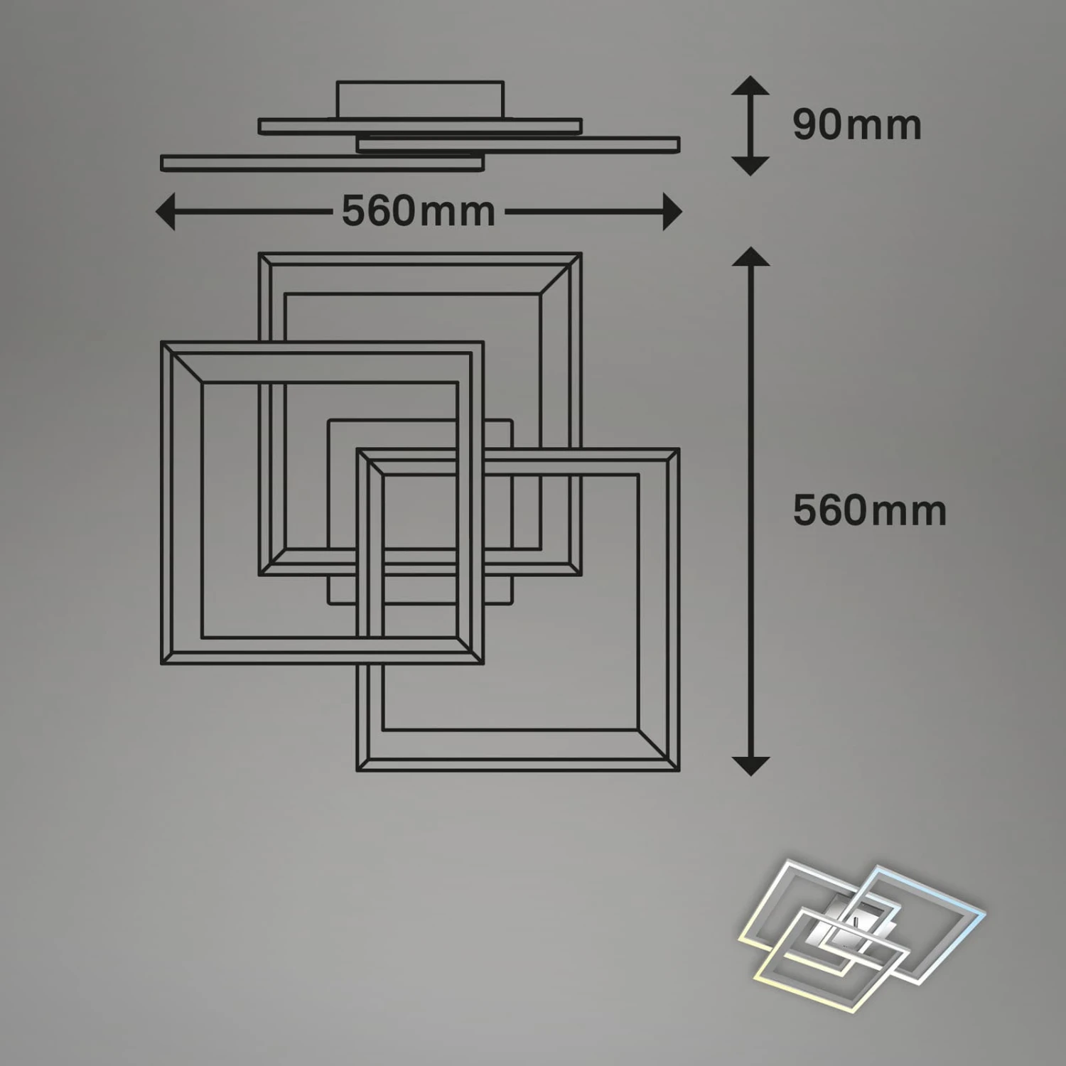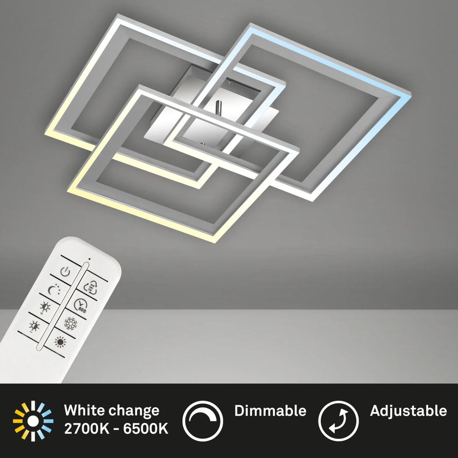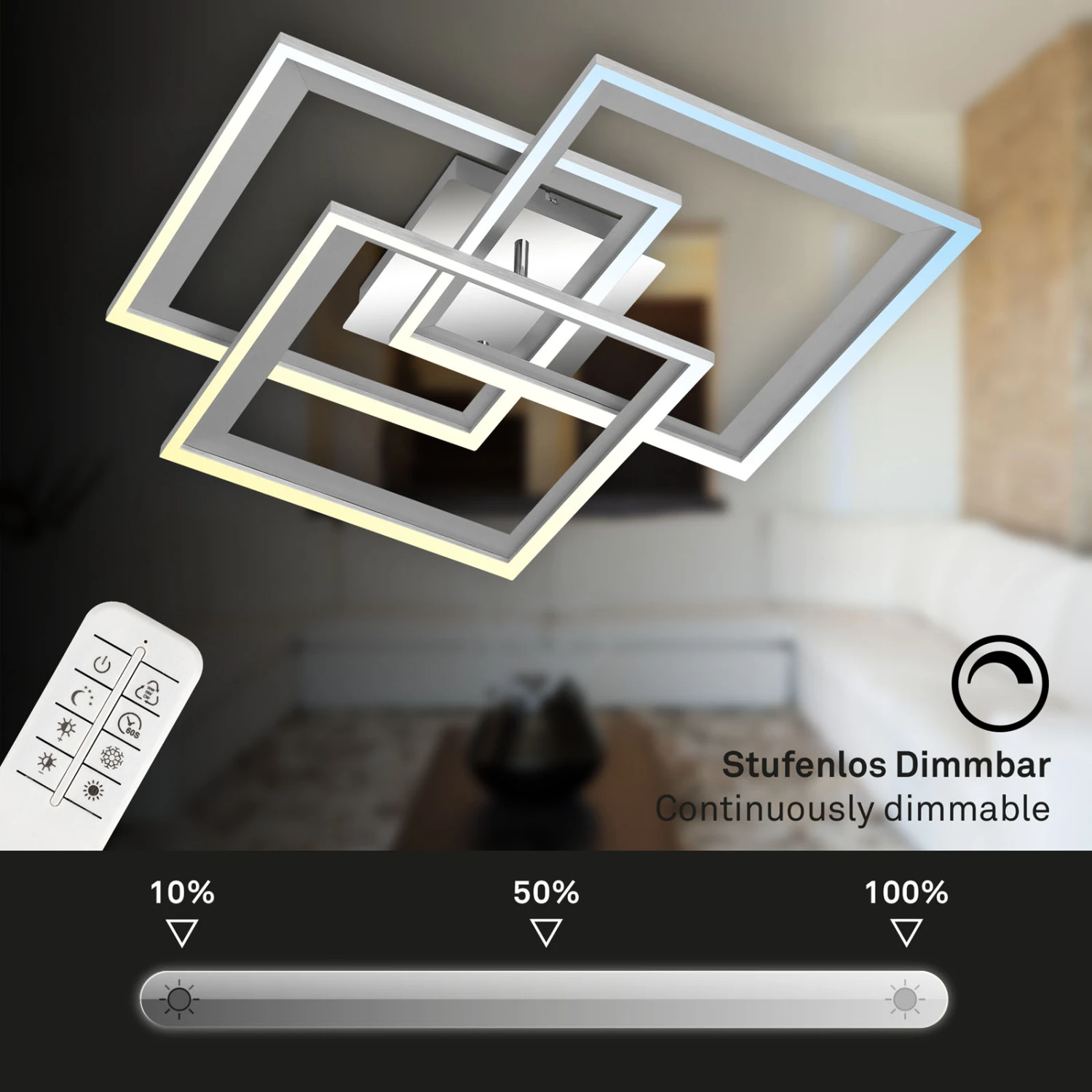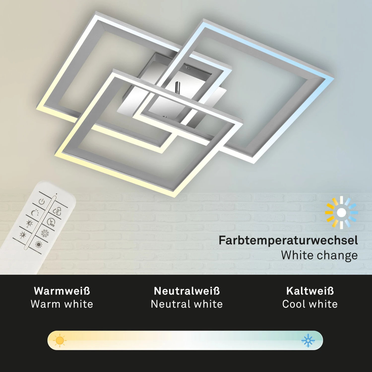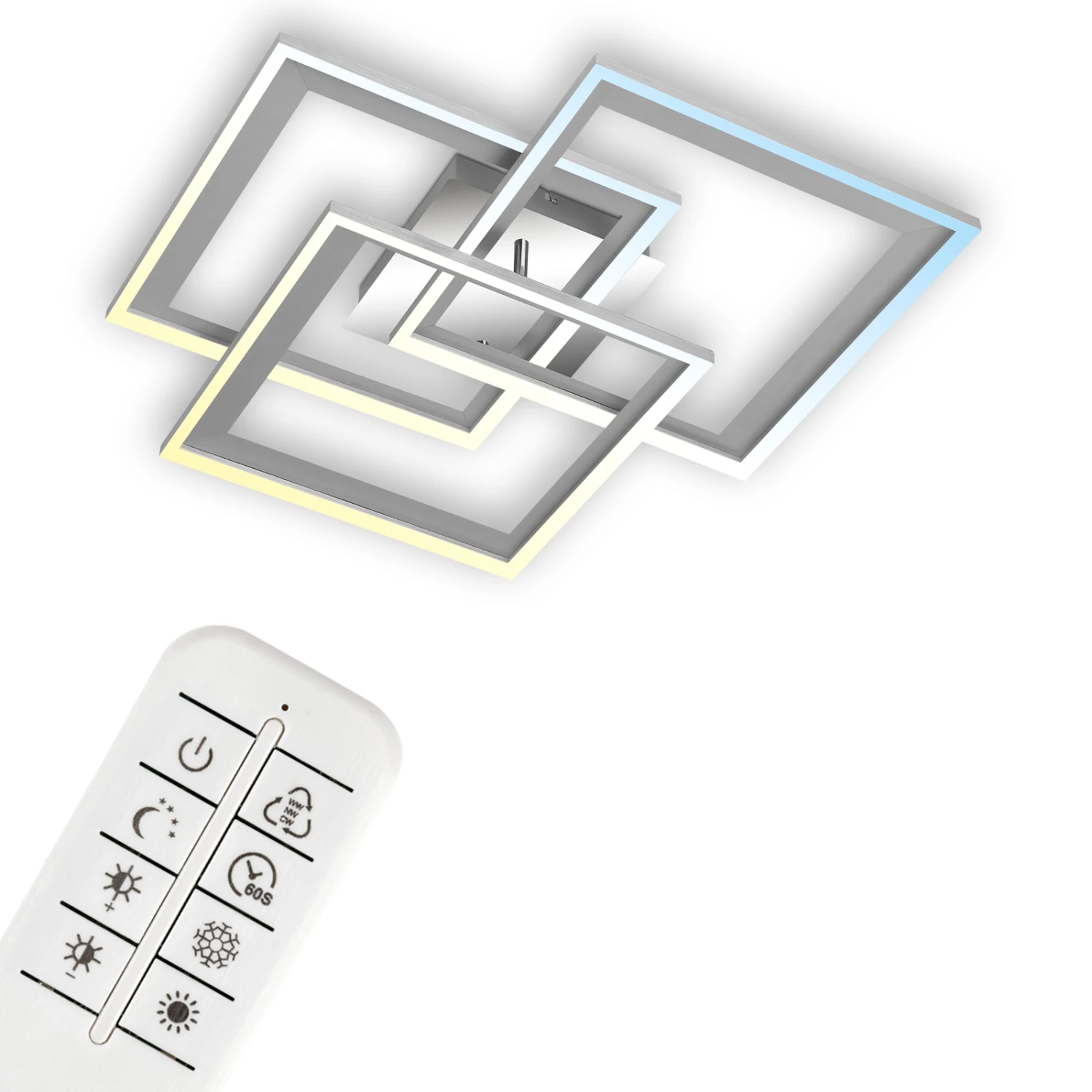 Diese 3-flammige LED-Deckenlampe ist die ideale Wohnzimmerlampe, Schlafzimmerlampe oder Wohnraumleuchte. Dank der LED-Technik verbraucht die Lampe 45 Watt Strom und erzeugt dabei 4950 Lumen Lichtintensität. Die Farbtemperatursteuerung (CCT) ermöglicht es Ihnen, die Farbtemperatur des Lichts von warmweißen 2700K bis kaltweißen 6500K stufenlos und in Stufen einzustellen. Diese Farbstufen können auch per Wandschalter reguliert werden. Durch mehrfachem Betätigen Ihres Lichtschalters schalten Sie die Stufen 2700K-4000K-6500K durch. Die Lampe ist zudem stufenlos dimmbar und mit einer Fernbedienung ausgestattet. Eine Nachtlichtfunktion dimmt das Licht auf eine niedrige Helligkeit bei warmweißen 2700 Kelvin. Für das nächste Einschalten speichert eine eingebaute Memory-Funktion die zuletzt gewählte Einstellung ab. Mit einem 60 Sekunden Timer können Sie ein automatisches Abschalten der Leuchte bewirken. Mit den Maßen 560x560x90 mm(LxBxH) passt die Lampe perfekt in jedes Zuhause. Die Produktfarbe ist aluminiumfarbig mit einer Dekorfläche in Chrom