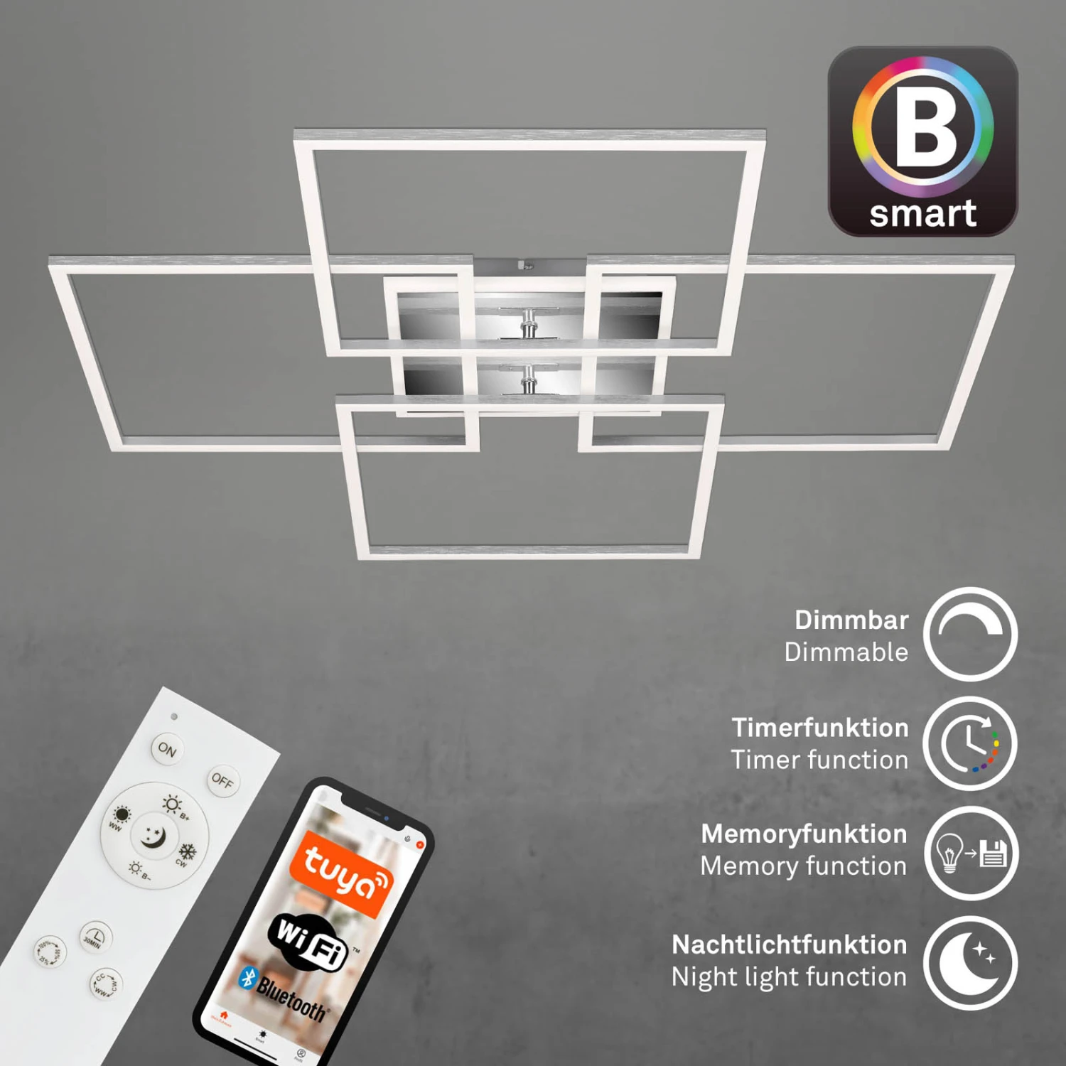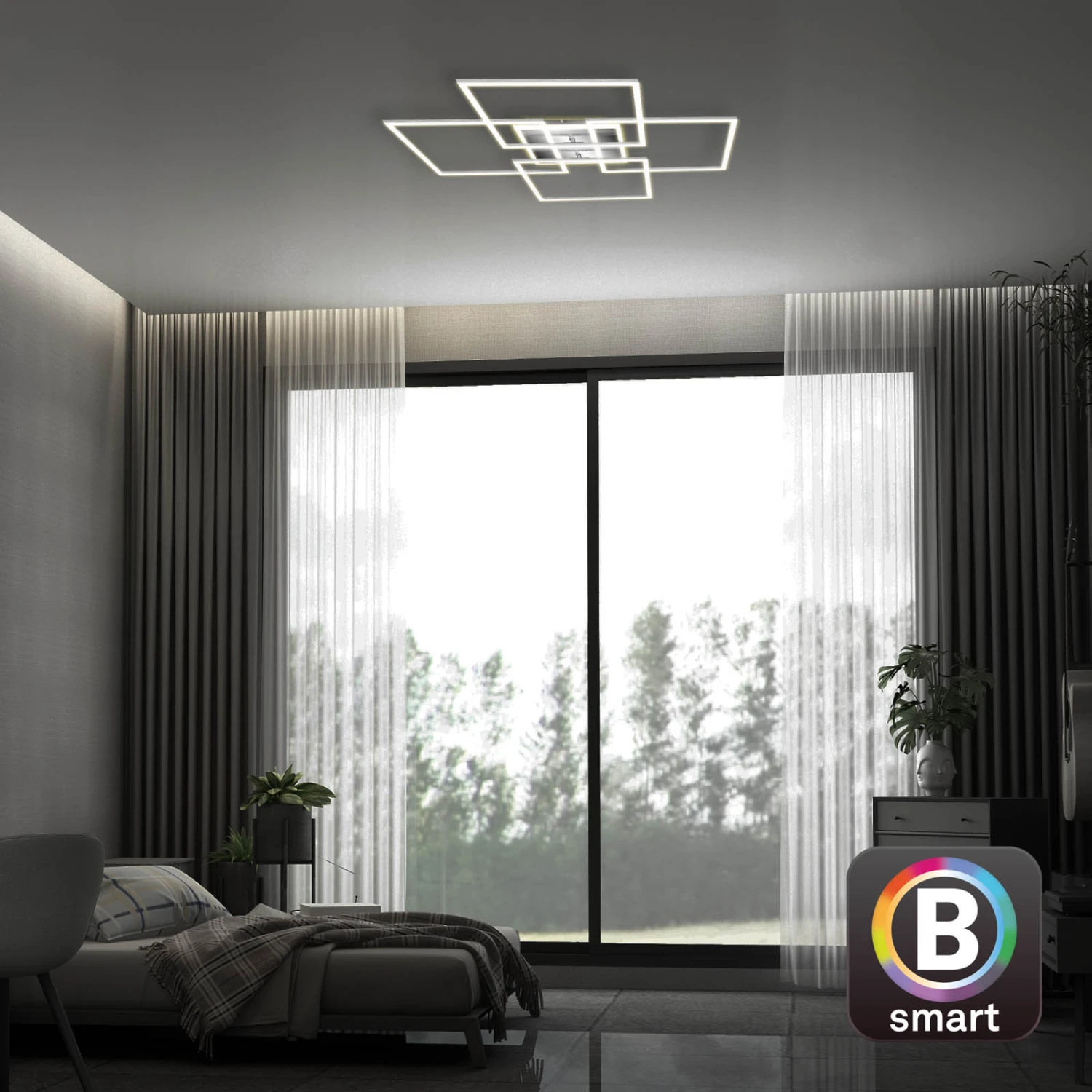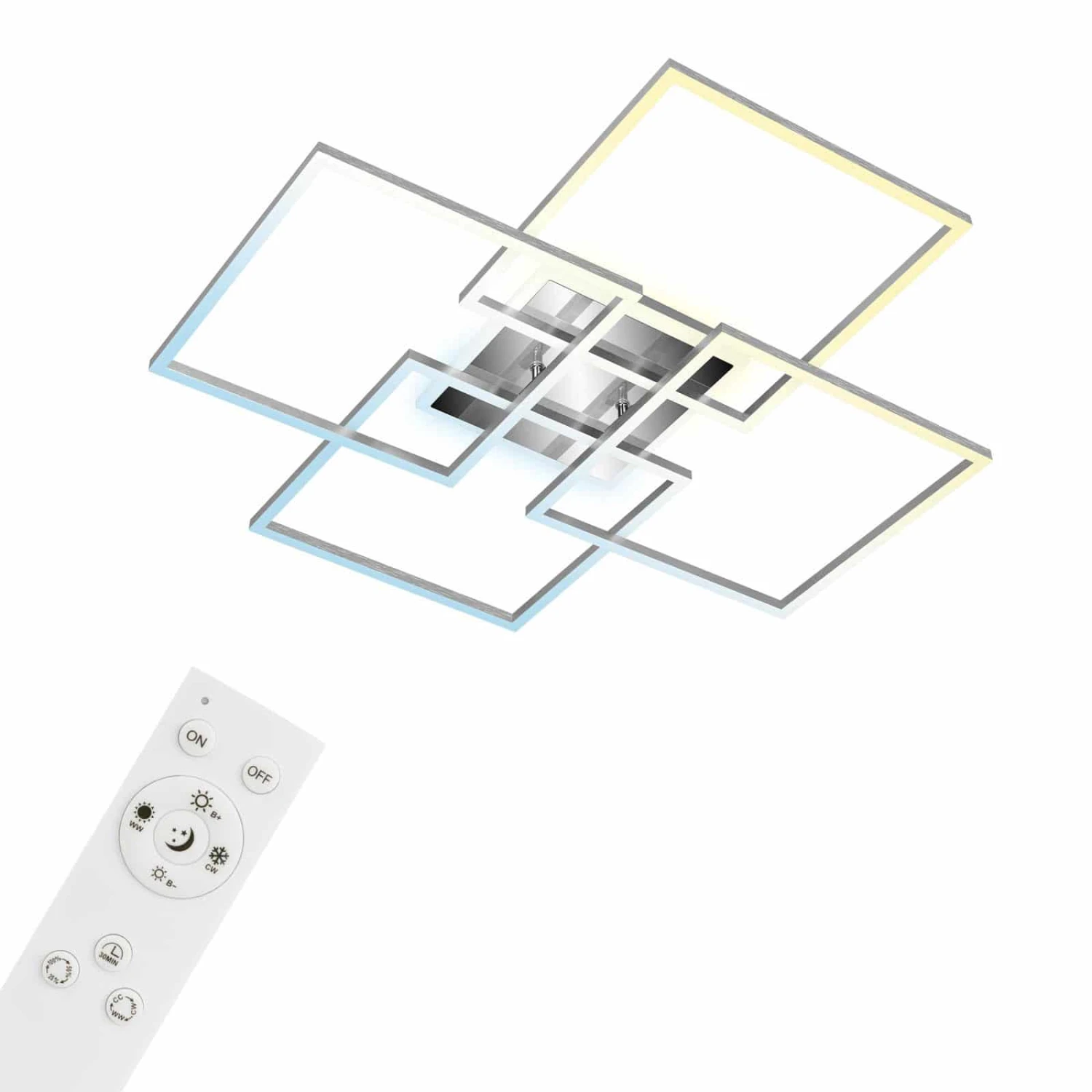 Bei dieser modernen LED Deckenlampe sind von vier LED Modulen, zwei drehbar. Sie ist vielseitig einsetzbar z.B. als Wohnzimmerlampe oder Schlafzimmerleuchte. Per mitgelieferter Fernbedienung ist die Leuchte bequem vom Sofa aus anzusteuern. Besonders die Sprachsteuerung über Ihren Sprachassistenten, sowie die smarte Steuerung per App über Ihr Smartphone macht diese Leuchte besonders. Wählen Sie beispielweise Ihre liebste Farbtemperatur aus und passen Sie so die Lichtverhältnisse individuell an Ihre Bedürfnisse an (2700K Â? 6500K). Die ausgewählte Farbtemperatur wird durch die sogenannte Memoryfunktion automatisch abgespeichert. Die Wohnzimmerlampe hat die Schutzart IP20. Produktabmessungen: 724x724x84mm (LxBxH).