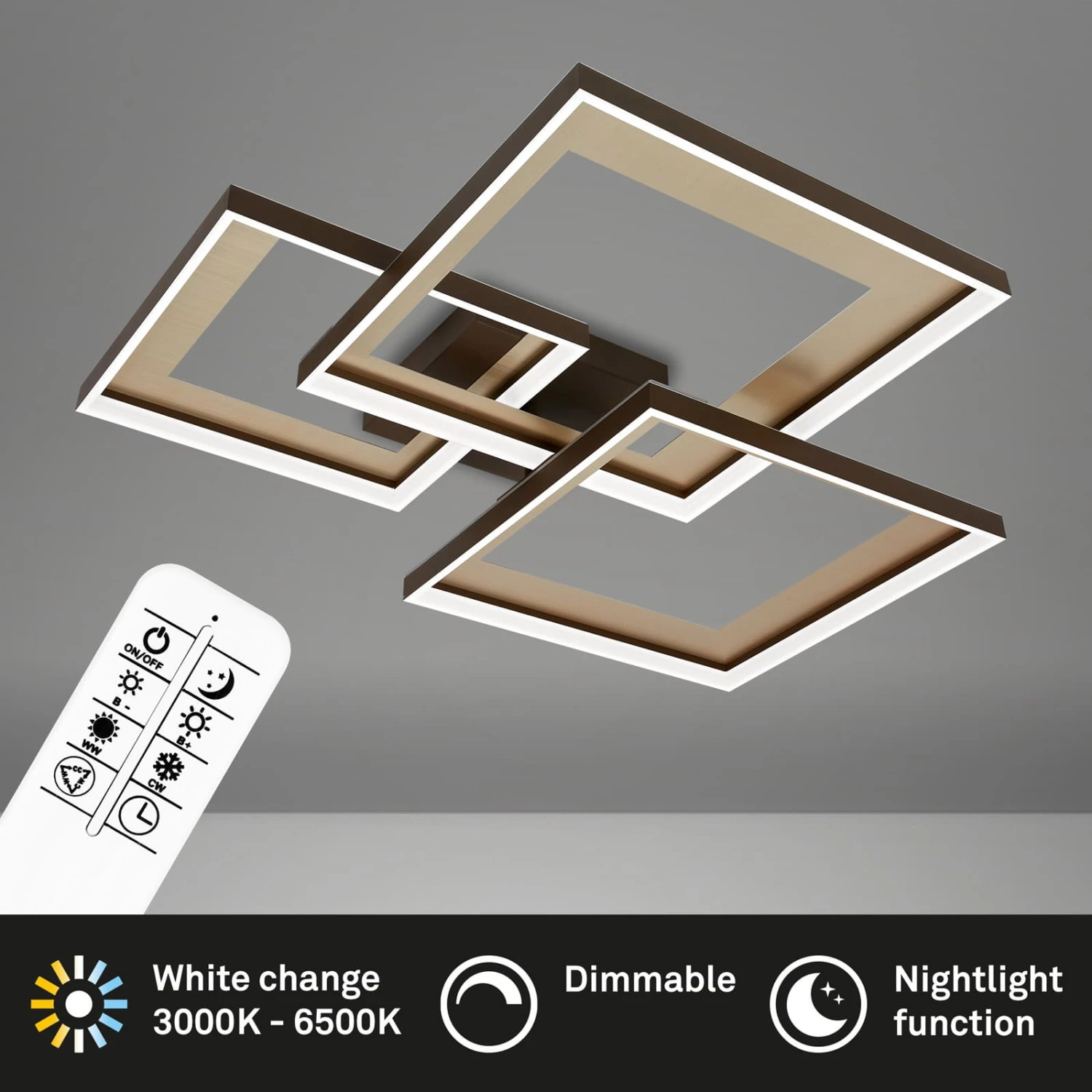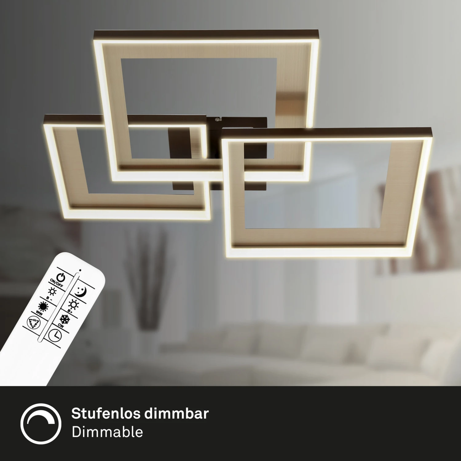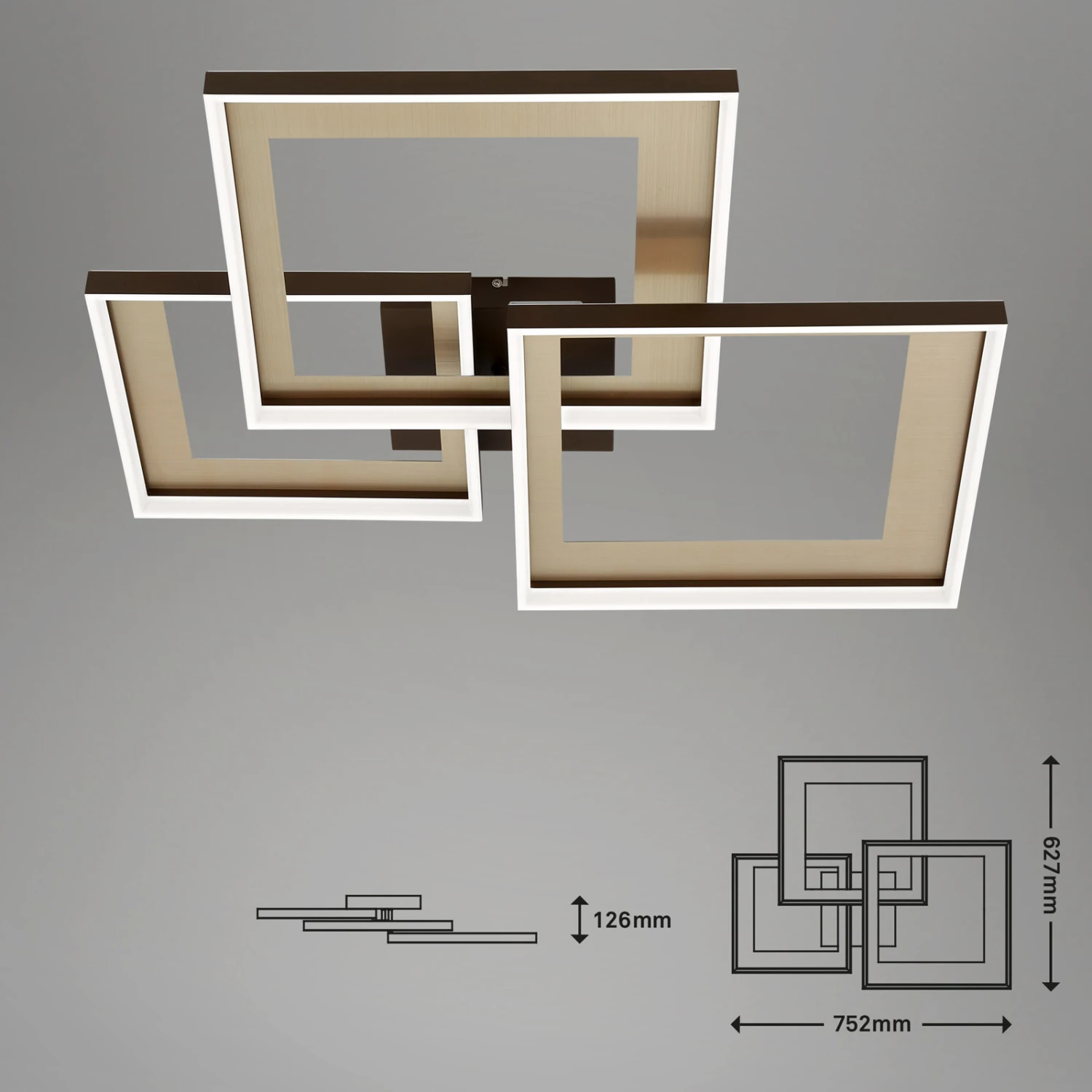 Diese moderne LED Deckenlampe mit 3 LED Modulen (2 davon drehbar), wird durch die Gold-braune Farbe ein Hingucker in Ihren Räumlichkeiten. Vielseitig einsetzbar z.B. als Wohnzimmerlampe oder Schlafzimmerleuchte. Per mitgelieferter Fernbedienung ist die Leuchte bequem vom Sofa aus anzusteuern. Wählen Sie beispielweise Ihre liebste Farbtemperatur aus und passen Sie so die Lichtverhältnisse individuell an Ihre Bedürfnisse an (3000K Â? 6500K). Die ausgewählte Farbtemperatur wird durch die sogenannte Memoryfunktion automatisch abgespeichert. Die Wohnzimmerlampe hat die Schutzart IP20. Produktabmessungen: 752x627x126mm (LxBxH).
