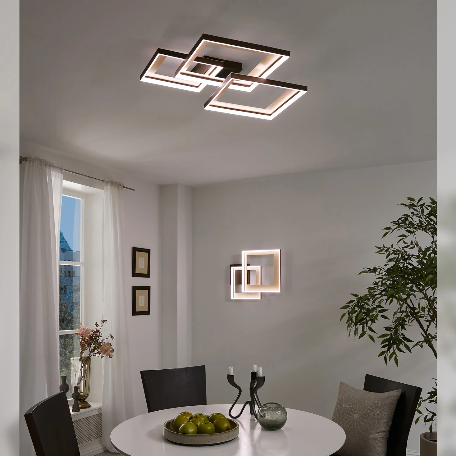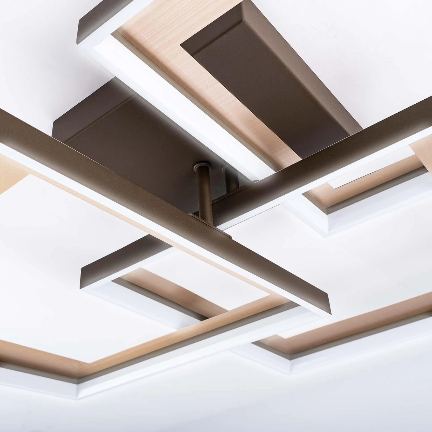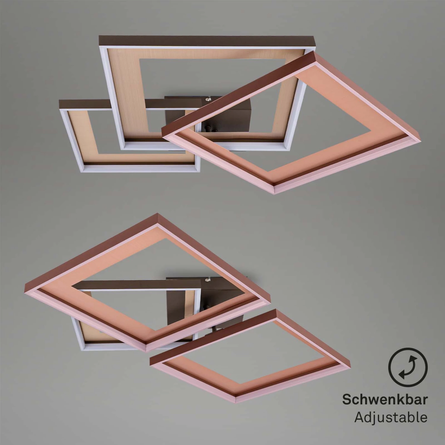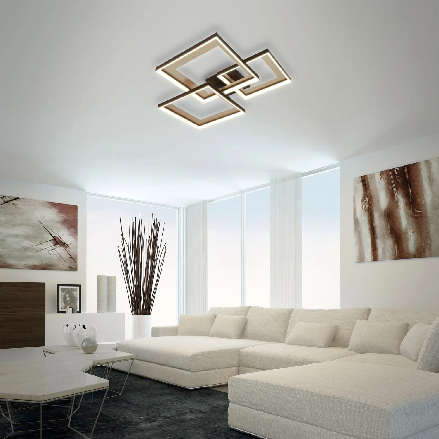 Diese moderne LED Deckenlampe mit 3 LED Modulen (2 davon drehbar), wird durch die Gold-braune Farbe ein Hingucker in Ihren Räumlichkeiten. Vielseitig einsetzbar z.B. als Wohnzimmerlampe oder Schlafzimmerleuchte. Per mitgelieferter Fernbedienung ist die Leuchte bequem vom Sofa aus anzusteuern. Wählen Sie beispielweise Ihre liebste Farbtemperatur aus und passen Sie so die Lichtverhältnisse individuell an Ihre Bedürfnisse an (3000K Â? 6500K). Die ausgewählte Farbtemperatur wird durch die sogenannte Memoryfunktion automatisch abgespeichert. Die Wohnzimmerlampe hat die Schutzart IP20. Produktabmessungen: 752x627x126mm (LxBxH).