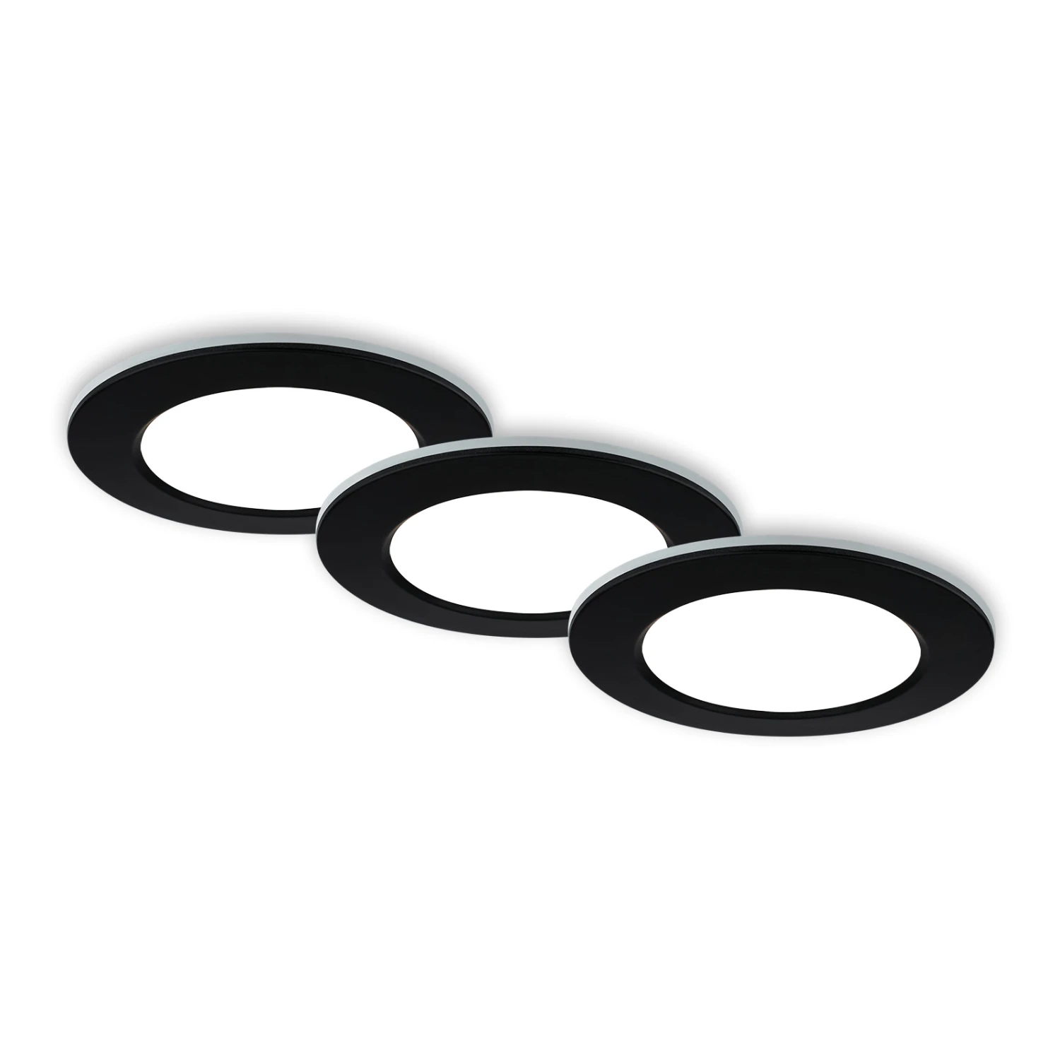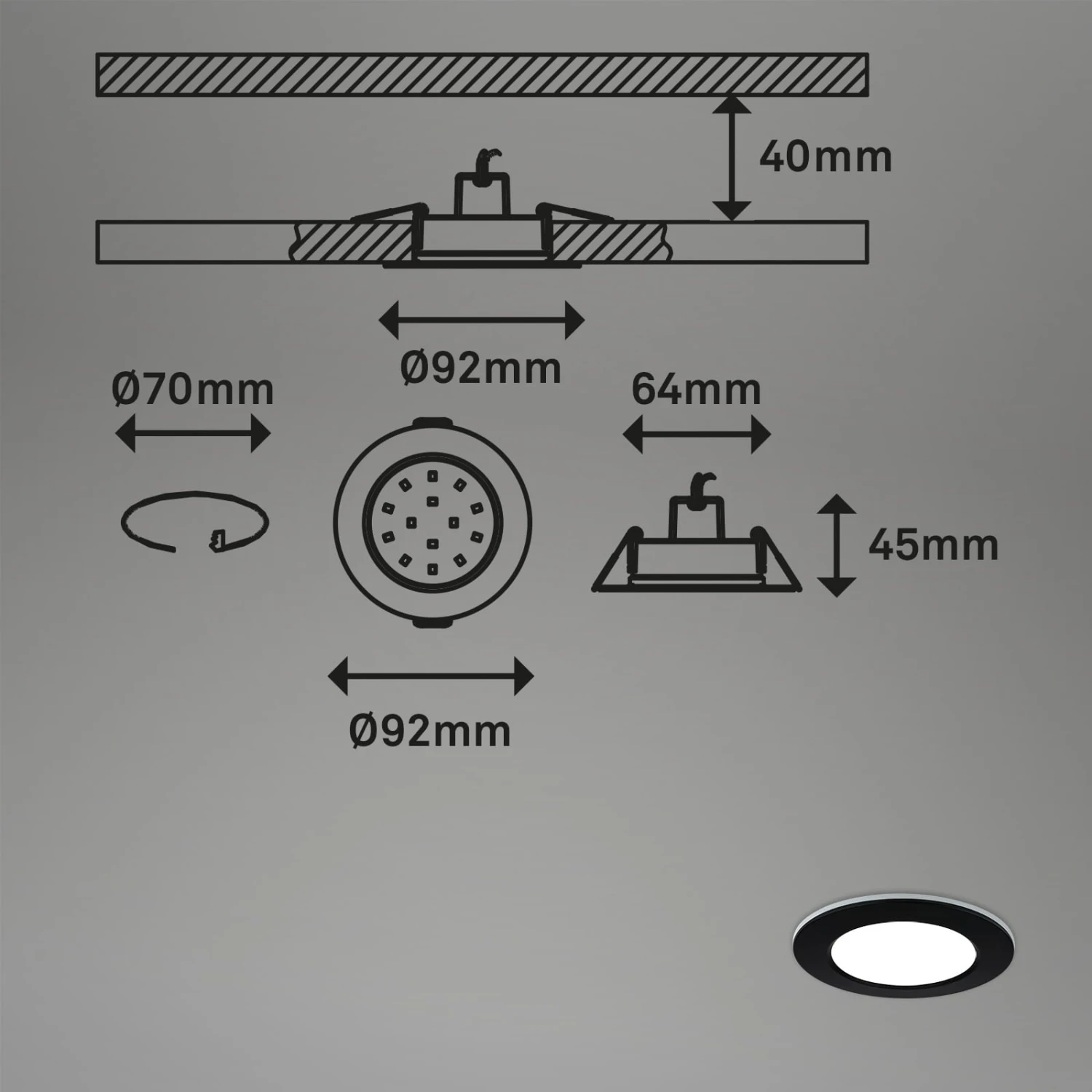 – und nach 23 Stunden wieder einschalten. Die Nachtlichtfunktion dimmt das Licht auf eine niedrige Dimmstufe und stellt eine warmweiße Farbtemperatur ein. So wird eine angenehme Atmosphäre in Schlafzimmer, Wohnzimmer oder Kinderzimmer geschaffen. Praktisch ist auch die Memoryfunktion, welche alle Einstellungen für das nächste Einschalten abspeichert. Die LED-Spots sind durch die Schutzart IP44 vor Spritzwasser geschützt. Die Deckeneinbauleuchten für das Badezimmer haben eine Größe von 92×45 mm, mit einem Einbaumaß von 68×40 mm. Mit je 4,8 Watt bei je 450 Lumen bieten die LED Einbaulampen viel Helligkeit. Die Produktfarbe ist Schwarz.