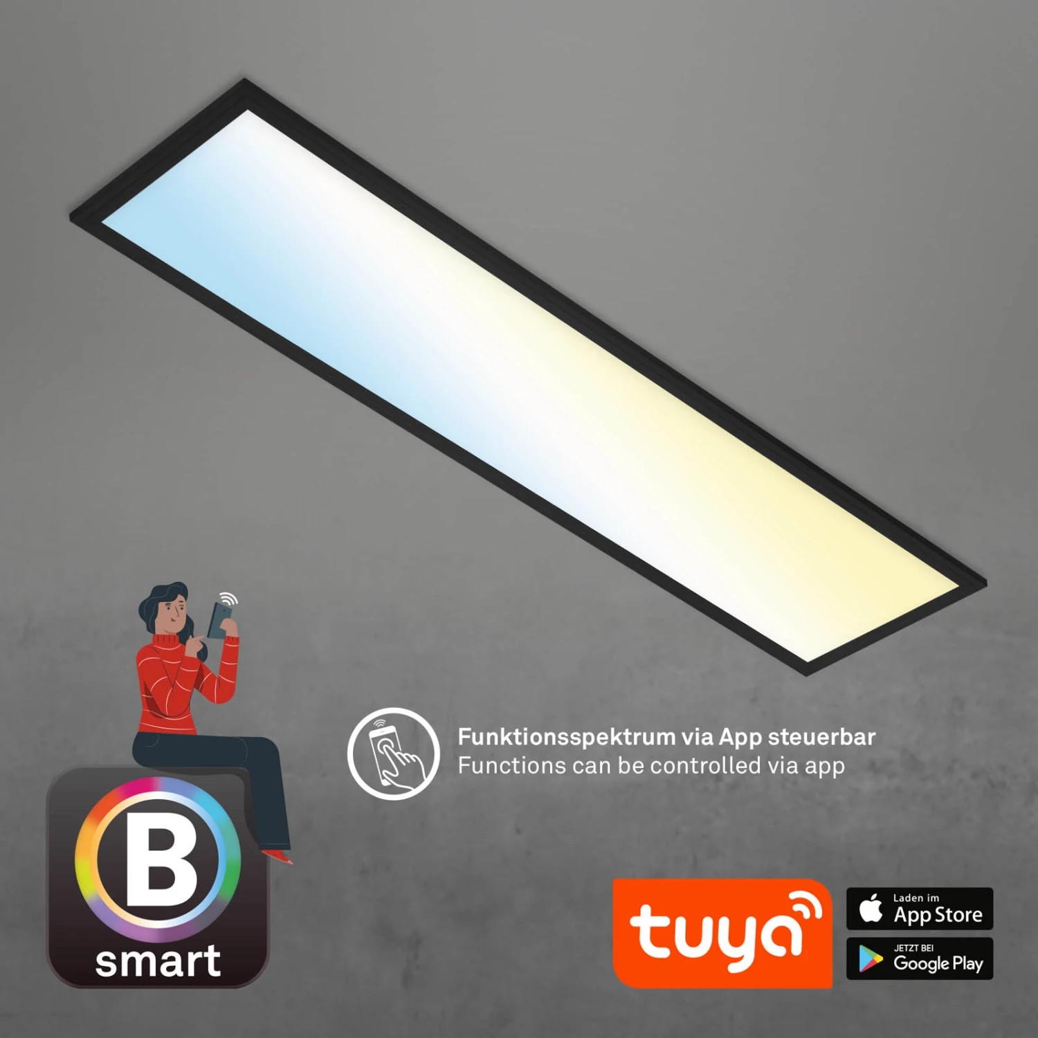 Diese smarte Deckenleuchte mit schwarzem Rahmen ist vielseitig einsetzbar z.B. als Wohnzimmerlampe oder Schlafzimmerleuchte. Per mitgelieferter Fernbedienung ist die Leuchte bequem vom Sofa aus anzusteuern. Besonders die Sprachsteuerung über Ihren Sprachassistenten, sowie die smarte Steuerung per App über Ihr Smartphone macht diese Leuchte besonders. Wählen Sie beispielweise Ihre liebste Farbtemperatur aus und passen Sie so die Lichtverhältnisse individuell an Ihre Bedürfnisse an (3000K Â? 6500K). Die ausgewählten Farbtemperaturen werden durch die Memoryfunktion automatisch abgespeichert. Die Wohnzimmerlampe hat die Schutzart IP20. Produktabmessungen: 1000x250x66mm (LxBxH).