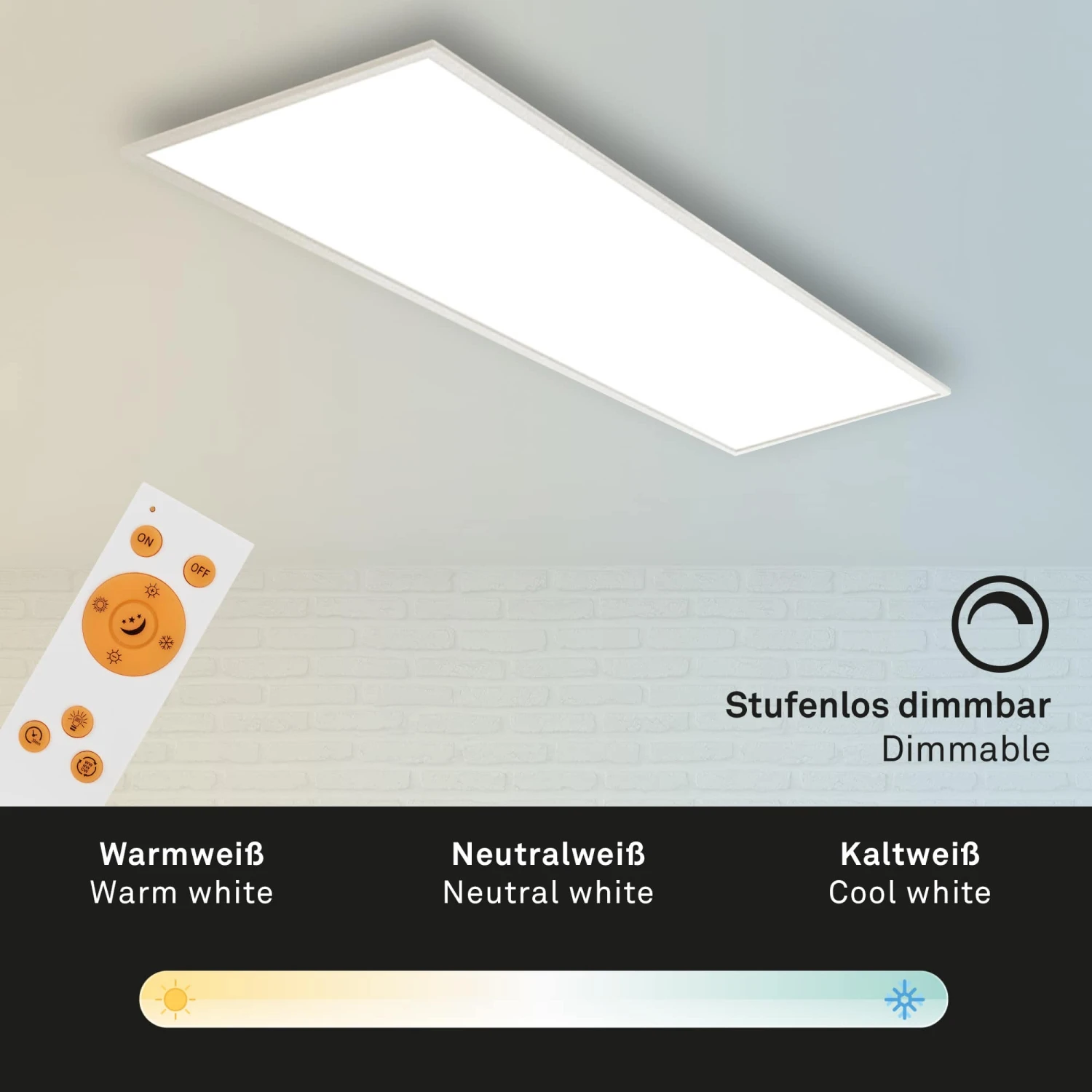 – Besonderheiten: mit der mitgelieferten Fernbedienung, kann die Wohnzimmerleuchte gedimmt und die Farbtemperatur (warm weiß bis kalt weiß, 3.000