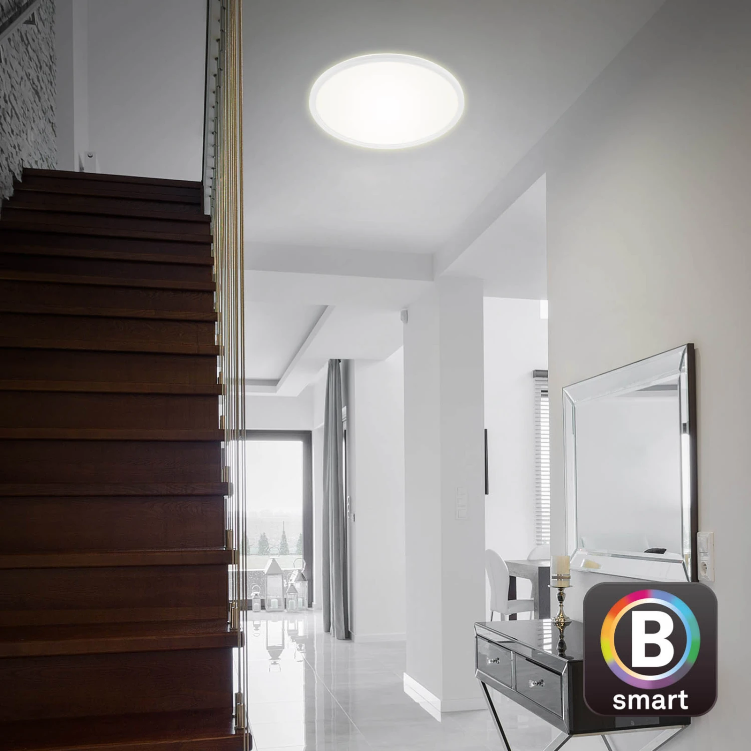 Diese moderne LED Lampe ist vielseitig einsetzbar z.B. als Wohnzimmerlampe oder Schlafzimmerleuchte. Per mitgelieferter Fernbedienung ist die Leuchte bequem vom Sofa aus anzusteuern. Besonders die Sprachsteuerung über Ihren Sprachassistenten, sowie die smarte Steuerung per App über Ihr Smartphone macht diese Leuchte besonders. Wählen Sie beispielweise Ihre liebste Farbtemperatur aus und passen Sie so die Lichtverhältnisse individuell an Ihre Bedürfnisse an (2700K Â? 6500K). Die ausgewählte Farbtemperatur wird durch die sogenannte Memoryfunktion automatisch abgespeichert. Die Wohnzimmerlampe hat die Schutzart IP20. Produktabmessungen: 420×25 mm (DxH).
