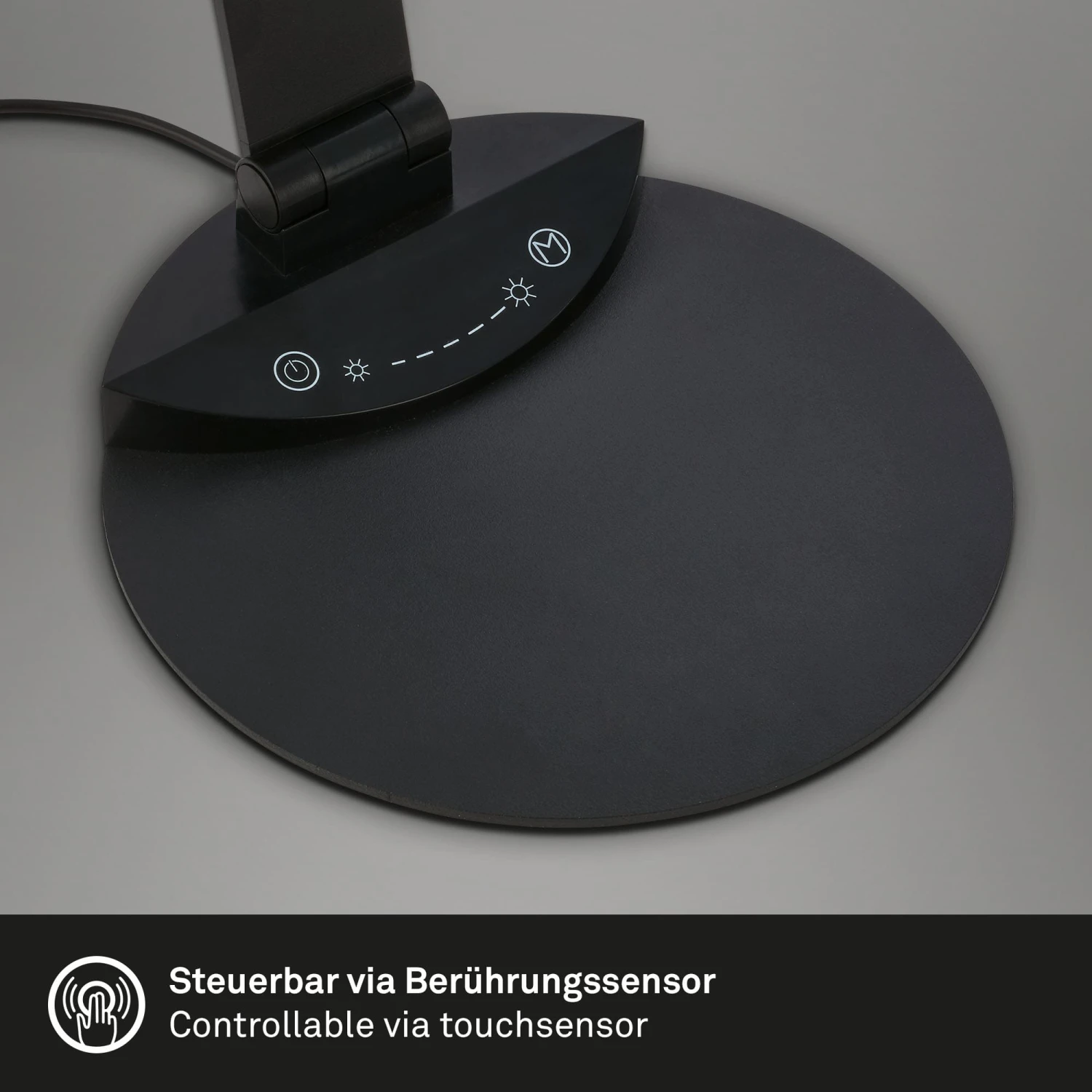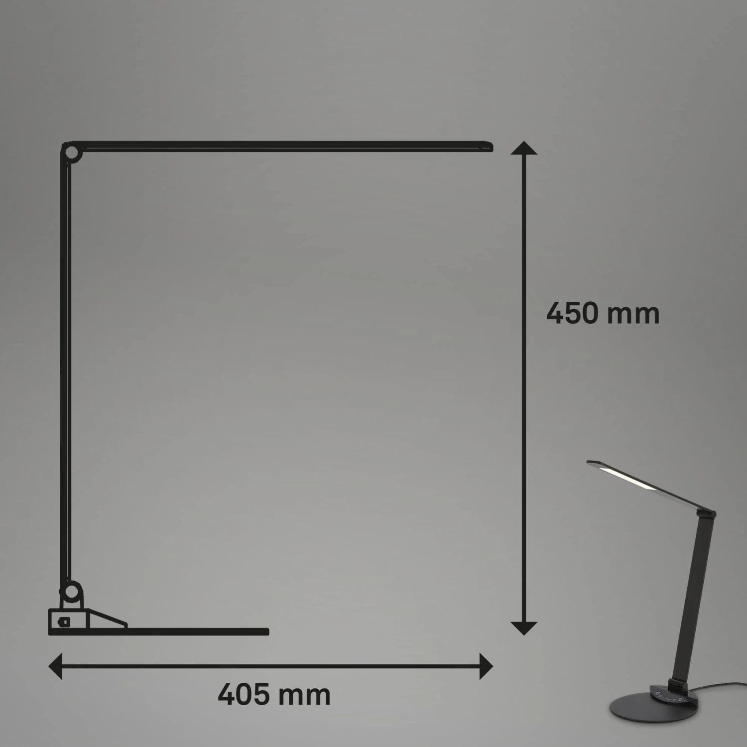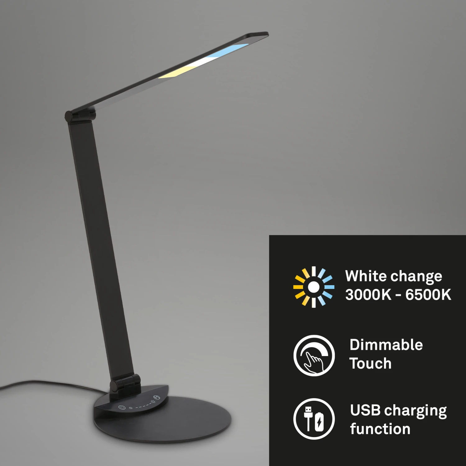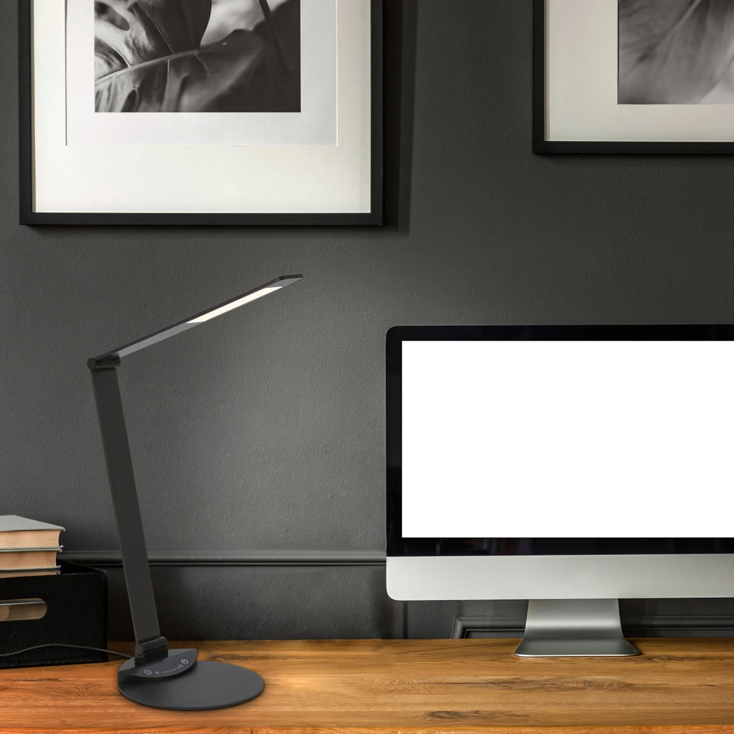 Die Farbtemperatur dieser Leselampe kann eingestellt werden. In den Stufen Warmweiß, Neutralweiß und Kaltweiß können Sie die beste Lichtfarbe für Ihre Bedürfnisse wählen (3000K, 4800K, 6500K). Auch die Helligkeit können Sie bei dieser LED-Schreibtischleuchte in 7 verschiedenen Stufen einstellen. Alle Funktionen lassen sich durch Berührung auswählen. Diese schwarze, schwenkbare Büroleuchte wird mit einem Kabel betrieben. Der stabile und flache Sockel garantiert einen sicheren Stand. Durch eine Speicherfunktion wird die zuletzt gewählte Einstellung gespeichert und beim nächsten Einschalten automatisch wieder eingestellt. Ein integrierter 5V 1A USB-Anschluss ermöglicht das Aufladen Ihres Telefons in Ihrem Büro, am Schreibtisch, im Home-Office. Die Bürolampe leuchtet mit 6 Watt bei 700 Lumen. Die Produktabmessungen sind: Komplettlänge 830mm, Ø 200mm (Standfuß), Armlänge: 380mm (unten) / 374mm (oben), Höhe bei waagerechtem Arm: 450mm