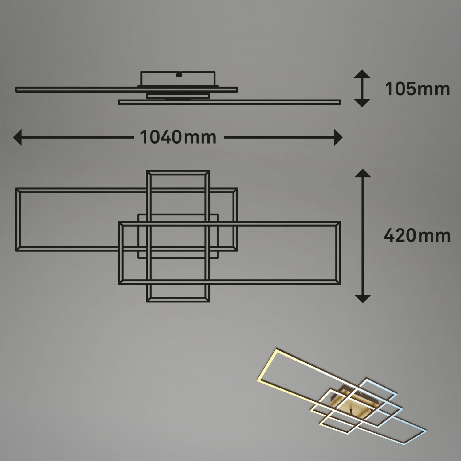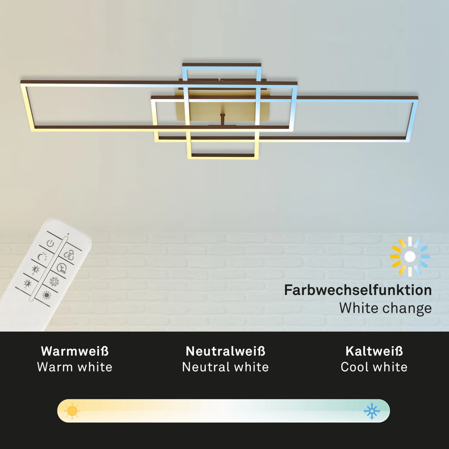 Diese, schwenkbare, 3-flammige LED-Deckenlampe ist die ideale Wohnzimmerlampe, Schlafzimmerlampe oder Wohnraumleuchte. Dank der LED-Technik verbraucht die Lampe 51 Watt Strom und erzeugt dabei 6600 Lumen Lichtintensität. Die Farbtemperatursteuerung (CCT) ermöglicht es Ihnen, die Farbtemperatur des Lichts von warmweißen 2700K bis neutralweiße 5000K stufenlos und in Stufen einzustellen. Diese Farbstufen können auch per Wandschalter reguliert werden. Durch mehrfachem Betätigen Ihres Lichtschalters schalten Sie die Stufen 2700K-4000K-5000K durch. Die Lampe ist zudem stufenlos dimmbar und mit einer Fernbedienung ausgestattet. Eine Nachtlichtfunktion dimmt das Licht auf eine niedrige Helligkeit von 10% bei warmweißen 2700 Kelvin. Für das nächste Einschalten speichert eine eingebaute Memory-Funktion die zuletzt gewählte Einstellung ab. Mit einem 60 Sekunden Timer können Sie ein automatisches Abschalten der Leuchte bewirken. Mit den Maßen 1040x420x100 mm (LxBxH) passt die Lampe perfekt in jedes Zuhause. Die Produktfarbe ist Gold-Braun