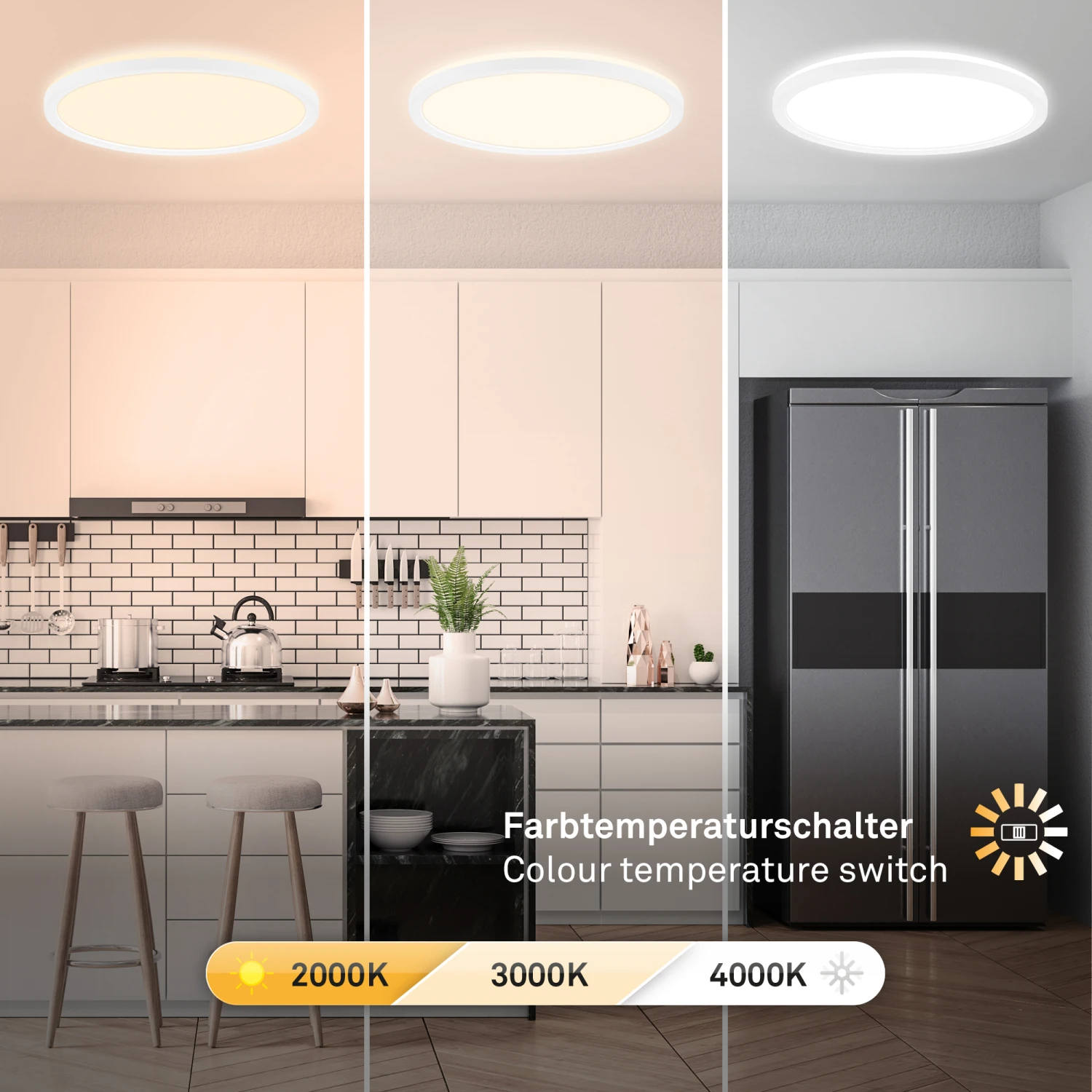 Einstellbare Farbtemperatur: Mit dem integrierten CTS Schalter können Sie die Farbtemperatur der Küchenlampe nach Ihren Wünschen anpassen. Wählen Sie zwischen 2000K, 3000K und 4000K (super warmweiß, warmweiß, neutralweiß). Technische Daten: Mit einer Leistung von 18 Watt und einer Helligkeit von 2400 Lumen bietet dieser Deckenstrahler eine leistungsstarke Beleuchtung. Backlight: Das LED Panel hat einen Lichtaustritt auf der Rückseite, wodurch ein indirektes Licht an die Wohnraumdecke erzeugt wird. Abmessung: Mit 293 x 28 mm (DxH) ist die Deckenbeleuchtung für Schlafzimmer, Küche, Kinderzimmer oder Flur gut geeignet und dabei extrem flach