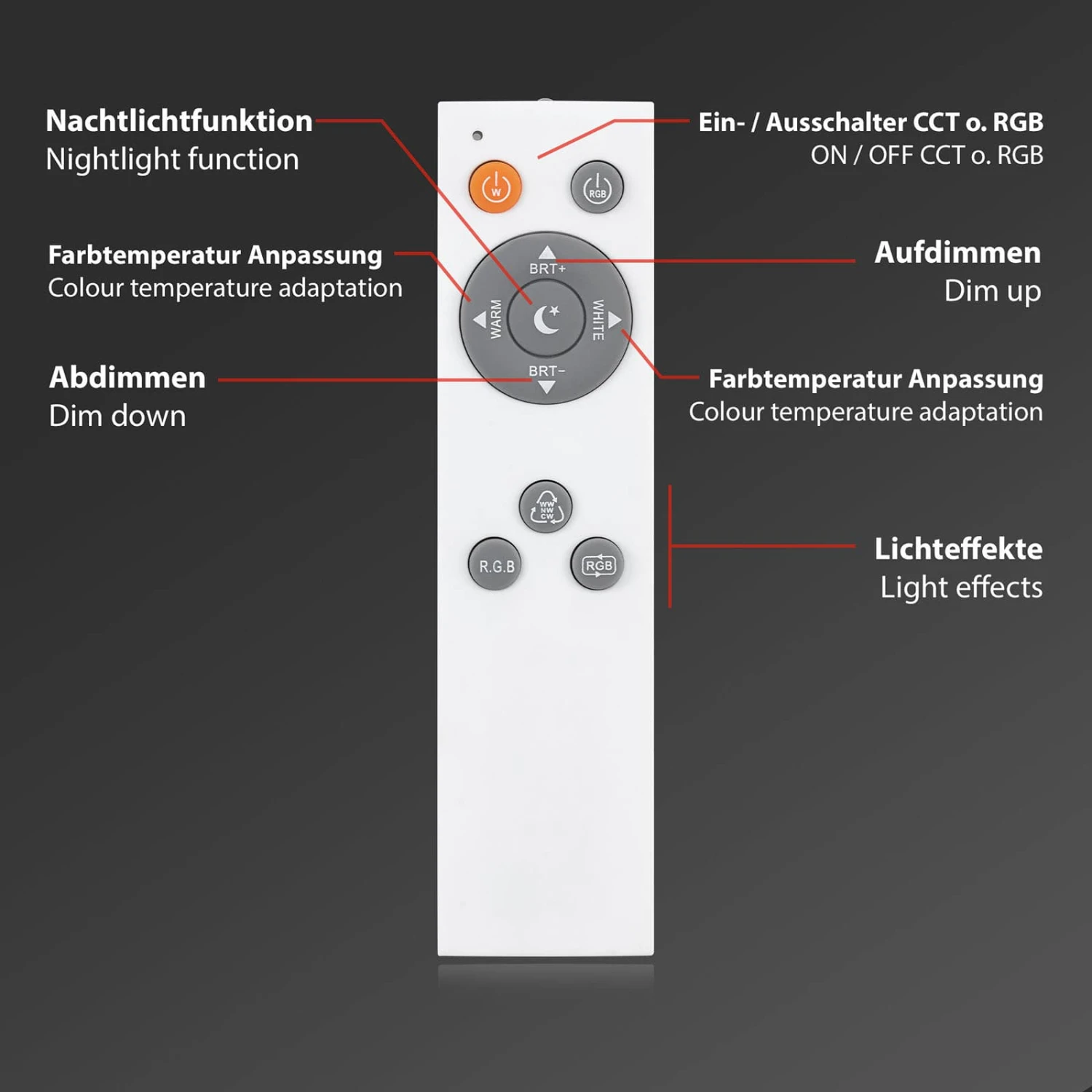 | Funktionen | CCT, Fernbedienung, Memory Funktion, Nachtlicht |