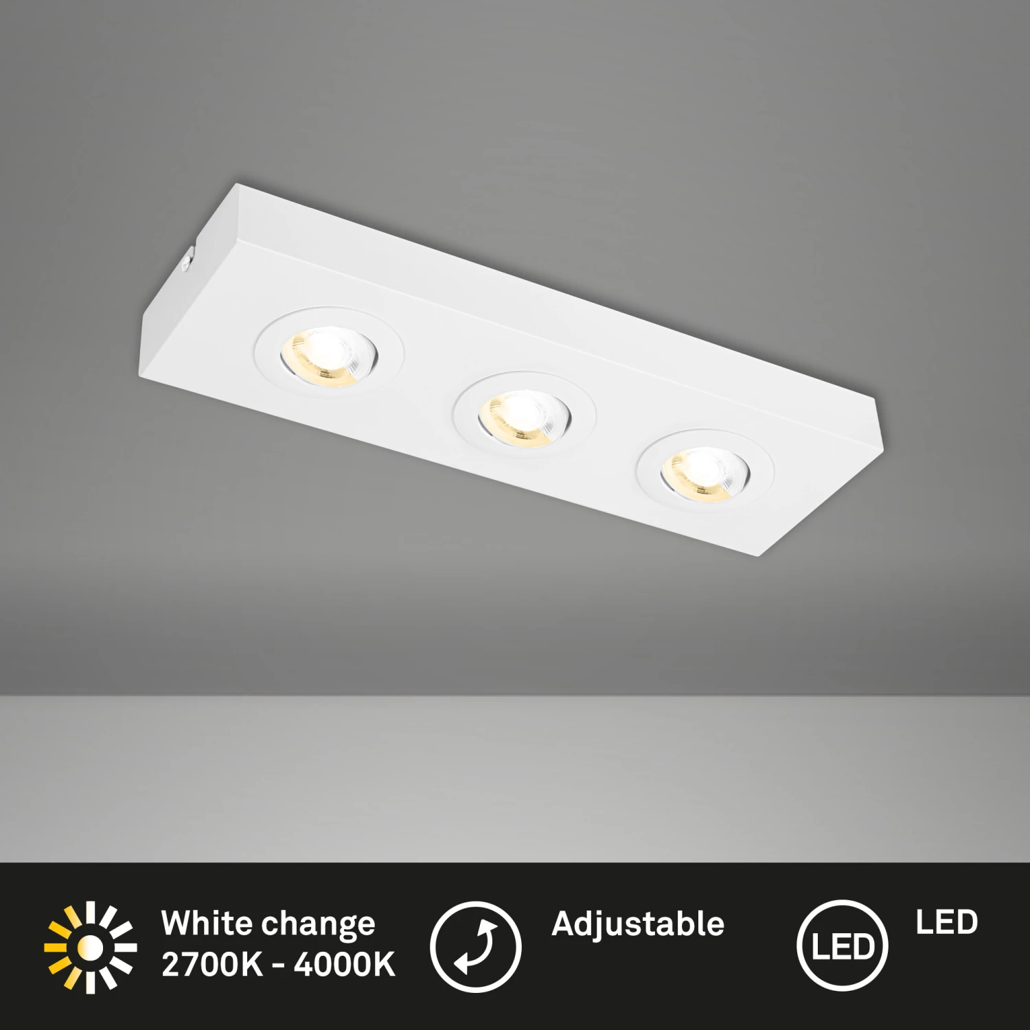 Entdecken Sie unsere innovative, weiß LED Deckenleuchte mit einstellbarer Farbtemperatur, die eine optimale Beleuchtung für jeden Raum bietet. Mit dem integrierten CTS Schalter im Gehäuse haben Sie die volle Kontrolle über die Farbtemperatur, bevor Sie die LED Aufbauleuchte montieren. Wählen Sie zwischen 2700K für ein gemütliches super warmweißes Licht oder 4000K für ein helles und erfrischendes neutralweißes Licht. Mit einer Leistung von 3×4 Watt und einer Helligkeit von 3×460 Lumen sorgt die LED Deckenlampe für eine effiziente Beleuchtung, die Ihren Raum optimal ausleuchtet. Die Schwenkbarkeit dieses LED Aufbauspots ermöglicht es Ihnen, das Licht gezielt auszurichten und bestimmte Bereiche in Ihrem Wohnzimmer, Ihrer Küche, Ihrem Esszimmer, Ihrem Schlafzimmer oder Flur gezielt zu beleuchten. Sie haben die volle Flexibilität, um die Beleuchtung nach Ihren Wünschen anzupassen. Mit kompakten Abmessungen von 385x120x40 mm (Länge x Breite x Höhe) passt diese Unterbauleuchte perfekt in Räume wie das Treppenhaus, den Eingangsbereich, in das Kinderzimmer oder alternativ auch als Arbeitsflächenbeleuchtung unter Ihren hängenden Küchenschrank. Erleben Sie die Zukunft der Beleuchtung mit unserer Deckenleuchte mit einstellbarer Farbtemperatur. Bringen Sie Licht und Stil in Ihr Zuhause und gestalten Sie Ihre Beleuchtung nach Ihren Vorstellungen!