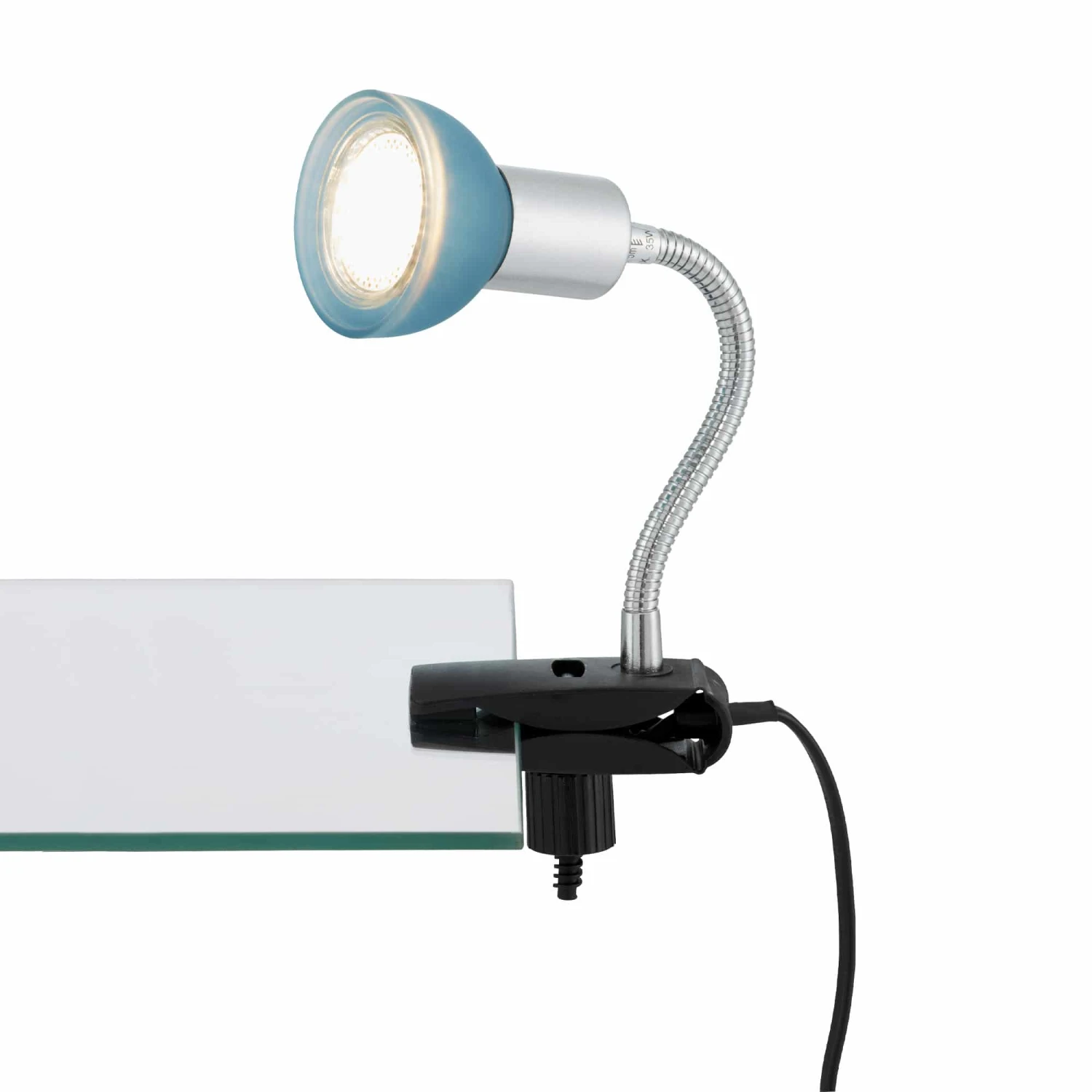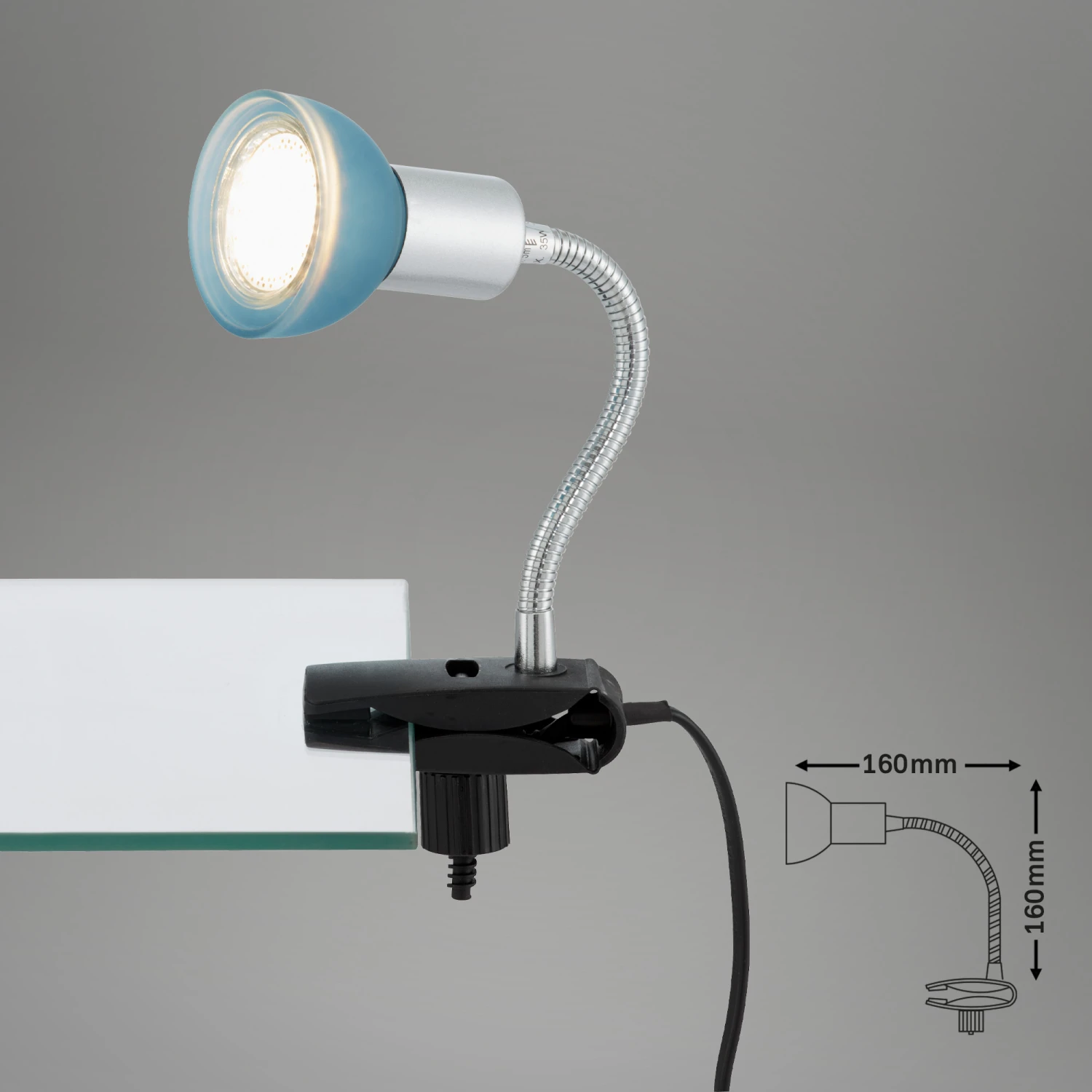 LED Klemmleuchte, 1-flammig „LEDO“ Metall-Glas / titanfarbig-blau inkl. 1 x LED/GU10 3W 250lm 3.000K Lebensdauer 25.000 h, Ra>= 80 flexibler Arm, inkl. Kabelschalter IP20 / Schutzklasse II 90x61x340x220mm (LxBxHxA)