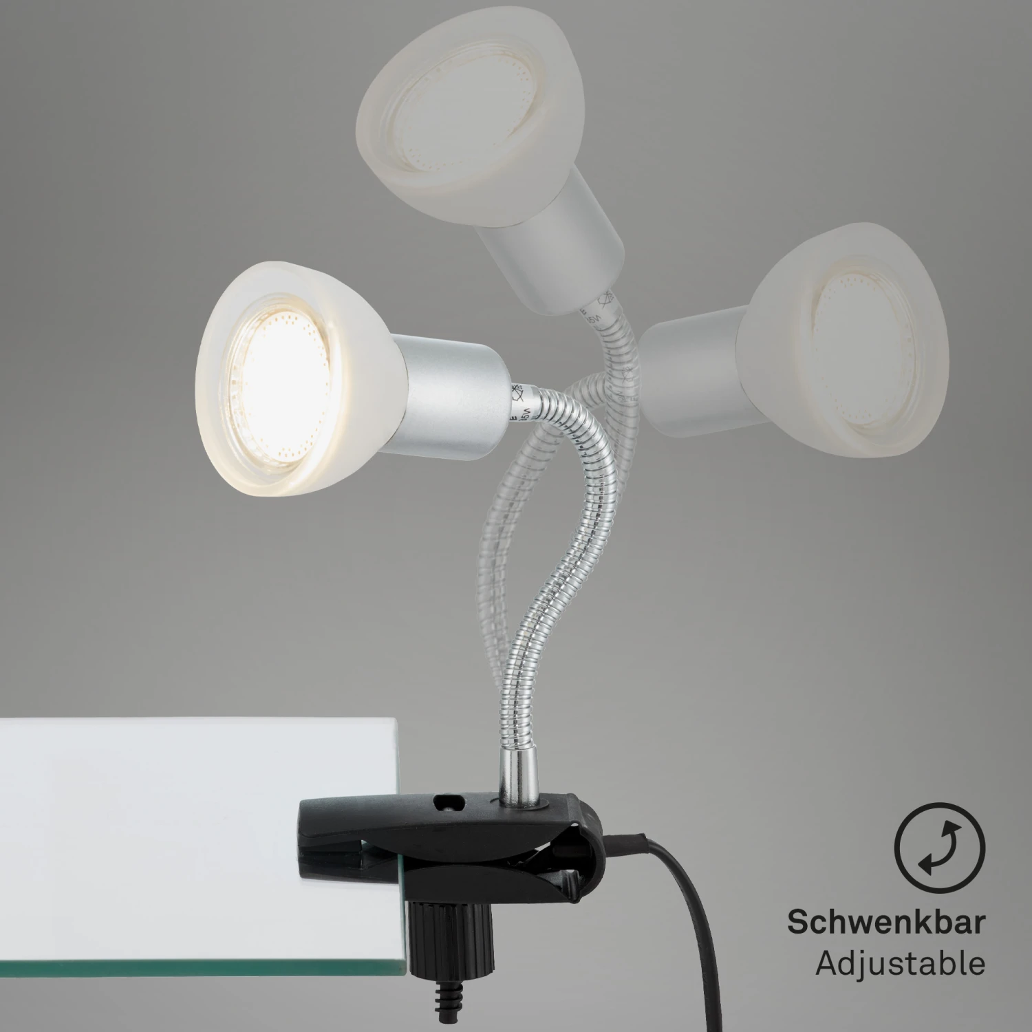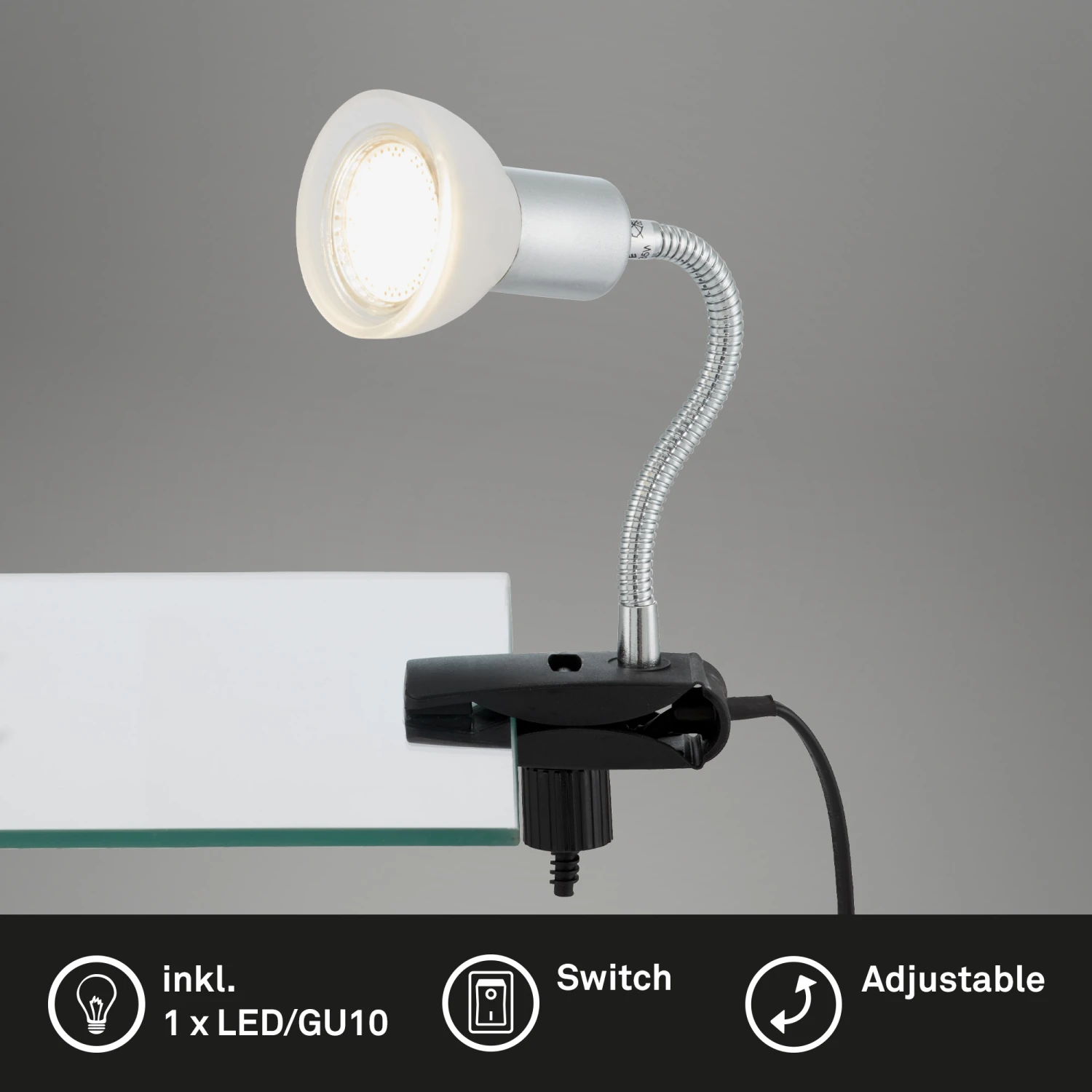 LED Klemmleuchte, 1-flammig „LEDO“ Metall-Glas / titanfarbig-weiß inkl. 1 x LED/GU10 3W 250lm 3.000K Lebensdauer 25.000 h, Ra>= 80 flexibler Arm, inkl. Kabelschalter IP20 / Schutzklasse II 90x61x340x220mm (LxBxHxA)