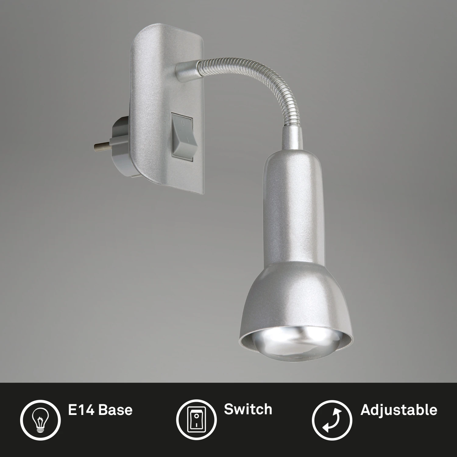 – Titanfarbiger Steckerspot mit einer E14 Fassung, der mit maximal 25 Watt bestückt werden kann.