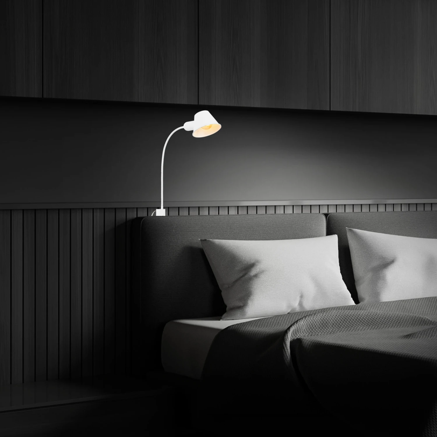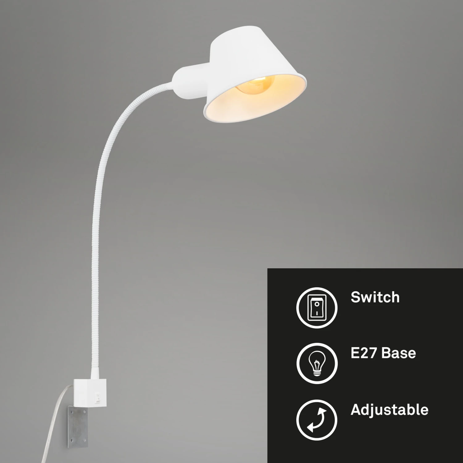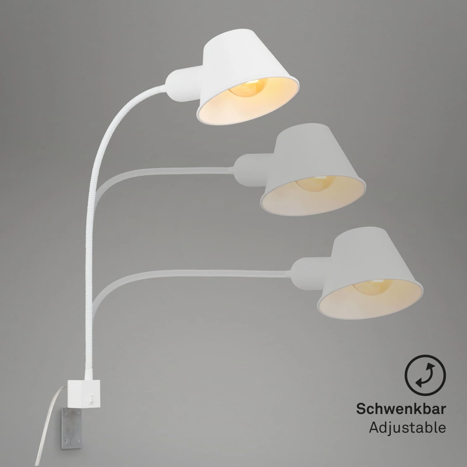 Diese flexible, schwenkbare Leseleuchte in Weiß wird über ein 180 cm langes Steckerkabel mit Strom versorgt. Der 50 cm lange flexible Schlauch der Wandleseleuchte bietet maximale Anpassungsfähigkeit und kann separat gebogen und gedreht werden, so dass Sie direktes Licht im Schlafzimmer haben, wenn Sie im Bett lesen, oder indirektes Licht, wenn Sie fernsehen. Mit dem Kippschalter am eckigen Sockel der Wandleuchte lässt sie sich leicht ein
