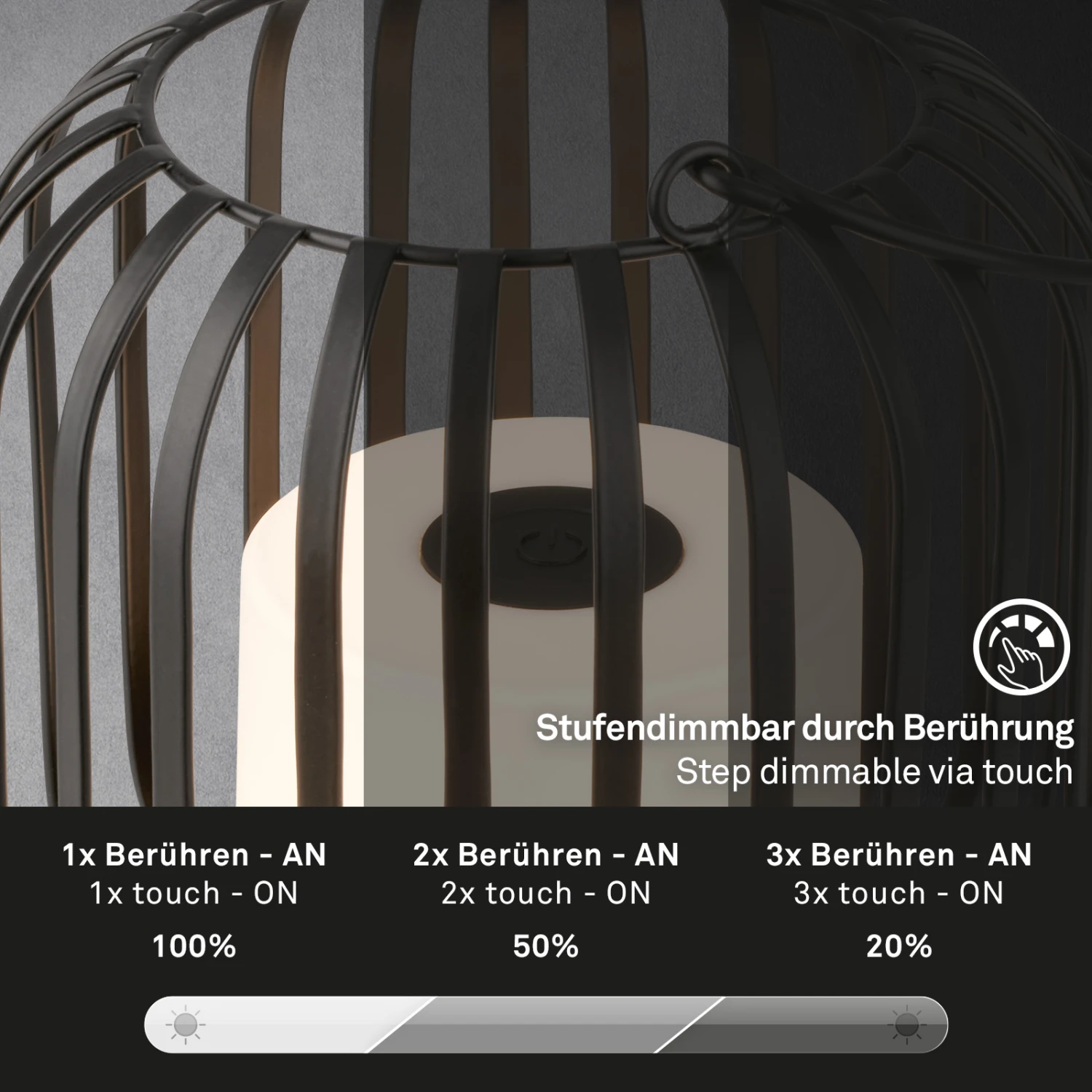 Diese elegante schwarze Mini Tischleuchte mit Metallkorb bietet Ihnen eine mobile Lichtlösung für Ihr Zuhause. Mit einem integrierten Akku, der eine Laufzeit von bis zu 15 Stunden ermöglicht, können Sie diese Leuchte flexibel überall dort platzieren, wo Sie sie benötigen. Die Ladedauer beträgt nur 2,5 Stunden, sodass Sie schnell wieder von ihrem warmen Licht profitieren können. Der mitgelieferte Metallkorb macht diese Akkulampe zu einem dekorativen Blickfang in Ihrem Wohnraum. Diese Mini Akku Lampe lässt sich in 3 verschiedenen Helligkeitsstufen (20%, 50%, 100%) per einfacher Berührung dimmen. Dadurch eignet sie sich ideal als mobiles Tischlicht, Dekolampe, Dekolicht, Nachtlicht für Kinder oder Mini Nachttischlampe ? ganz nach Ihren Bedürfnissen Mit einer Lichtfarbe von 2700 Kelvin strahlt diese Leuchte ein angenehmes warmweißes Licht aus. Perfekt geeignet für gemütliche Grillabende am Gartentisch auf dem Balkon oder der Terrasse, aber auch als stimmungsvolles Licht in Wohnzimmer, Flur und Schlafzimmer. Die Schutzart IP44 bietet Schutz vor Spritzwasser und macht diese LED Tischlampe mit Batterie zu einem zuverlässigen Begleiter beim Camping, im Freien oder auf Terrasse und Balkon ? selbst wenn das Wetter mal nicht mitspielt. Das Aufladen erfolgt bequem per mitgeliefertem USB-C Kabel. Diese kabellose Lampe hat eine kompakte Größe von 130×135 mm (Durchmesser x Höhe) und passt problemlos in jeden Raum. Lassen Sie Ihr Zuhause mit dieser vielseitigen Mini Tischleuchte in neuem Licht erstrahlen.