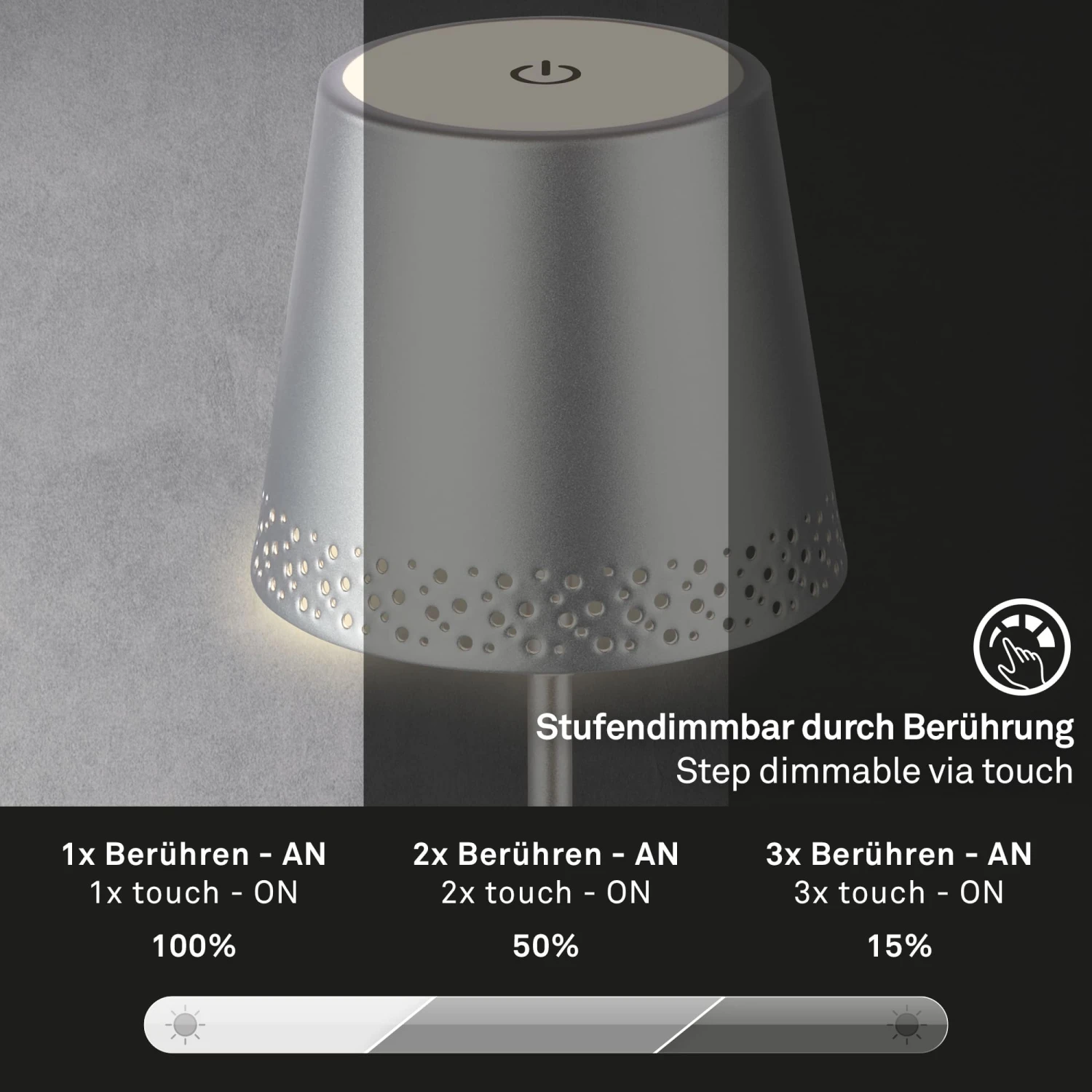 Da die Tischleuchte mit Akku betrieben wird, können Sie sie als tragbare Leuchte überall im Haus einsetzen. Im Flur, Schlafzimmer, Büro, Arbeitszimmer, Esstisch, Wohnzimmer, Kinderzimmer und als Deko auf dem Küchentisch, Esstisch, Schrank und Regal. Die Stange der LED Tischlampe ist zweiteilig und kann durch eine einfache Drehbewegung getrennt werden. Legen Sie die untere Stange beiseite und drehen Sie die obere Stange mit Lampenschirm einfach auf den Sockel. Schon haben Sie eine kompakte Akkulampe und die Höhe von 38 cm auf 22 cm reduziert. Die LED Akku Tischleuchte kann als Schlafzimmerlampe, Schreibtischlampe, Leselampe oder dekorative Lampe verwendet werden. Sie kann durch Berührung in drei Stufen gedimmt werden. Das warmweiße Licht, mit einer Temperatur von 3000 Kelvin, ist ein schöner Akzent bei romantischen und gemütlichen Abenden beim Grillen mit Freunden oder einem Dinner zu zweit. Die kabellose Tischlampe mit Batterie ist durch die Schutzart IP44 vor Spritzwasser geschützt, falls es beim Camping, im Freien, auf der Terrasse oder auf dem Balkon nass wird. Das mitgelieferte USB-C Kabel dient zum Aufladen der LED Lampe. Bei vollständig geladenem Akku kann die LED Akkulampe bei sanftem Licht bis zu 24 Stunden leuchten. Die kabellose Lampe hat einen perforierten Metallschirm und ist 380×120 mm (HxD) groß. Die Farbe ist Chrom-Matt. Lieferumfang: Verlängerungsstück, USB-C-Kabel, Bedienungsanleitung