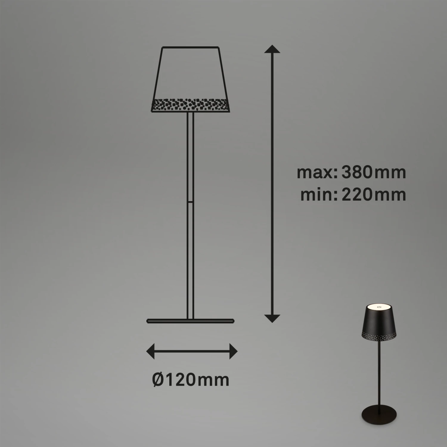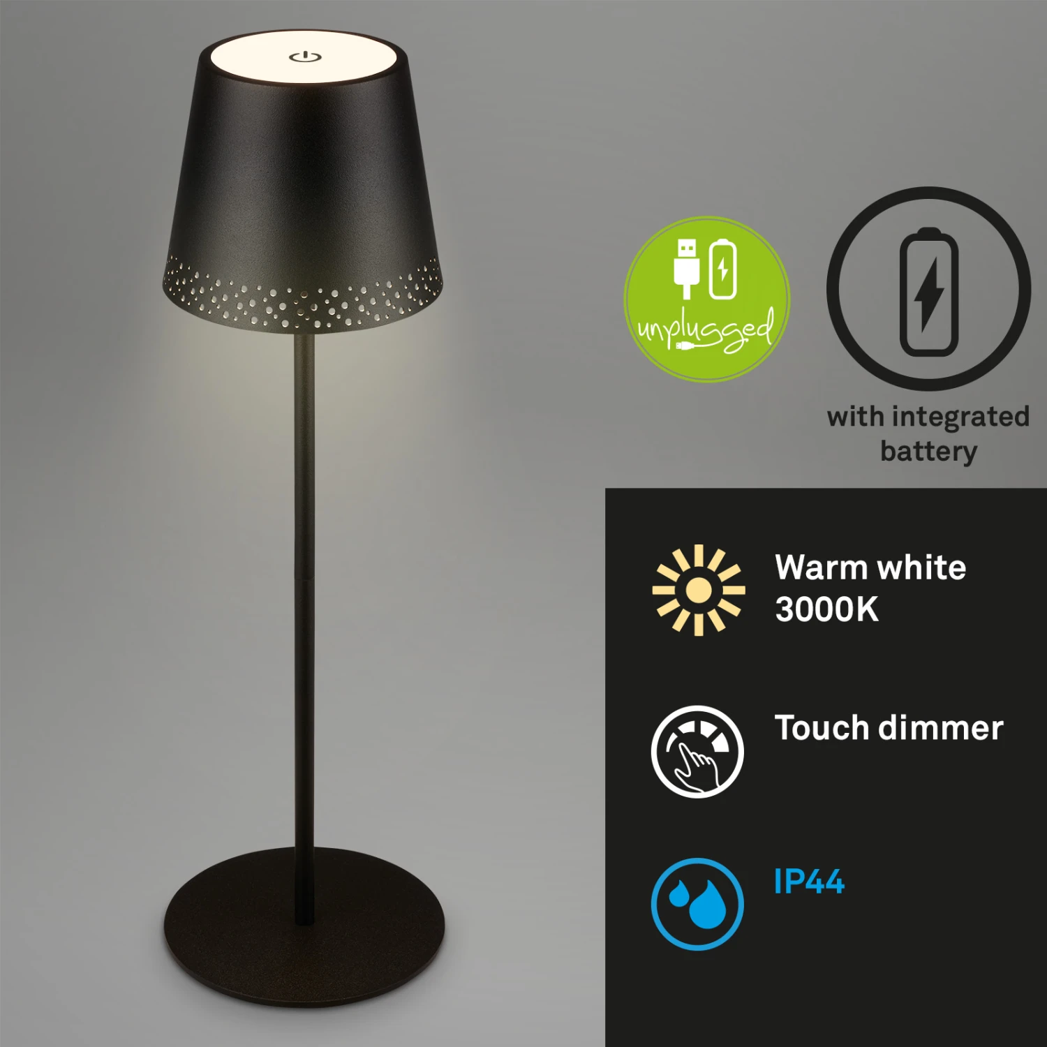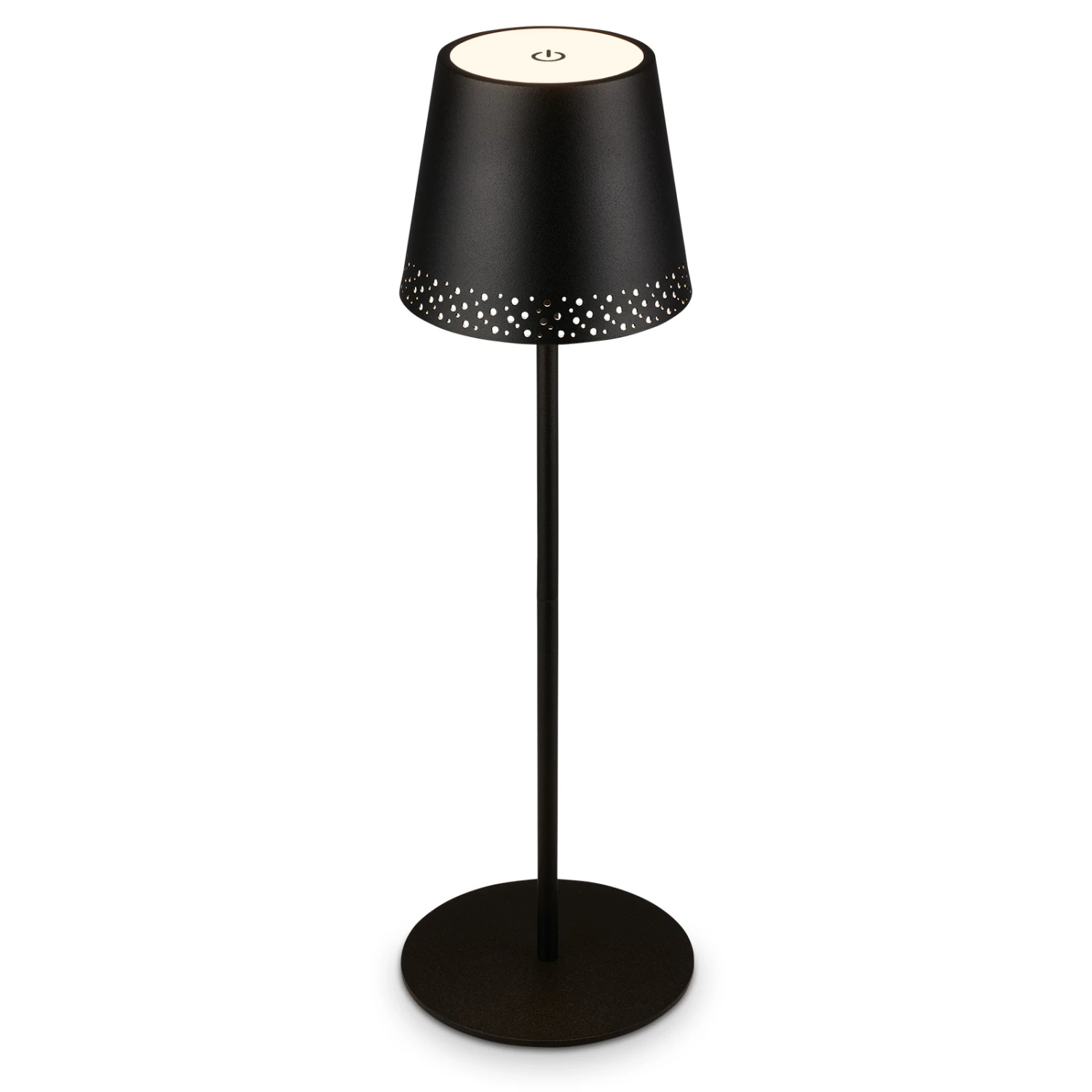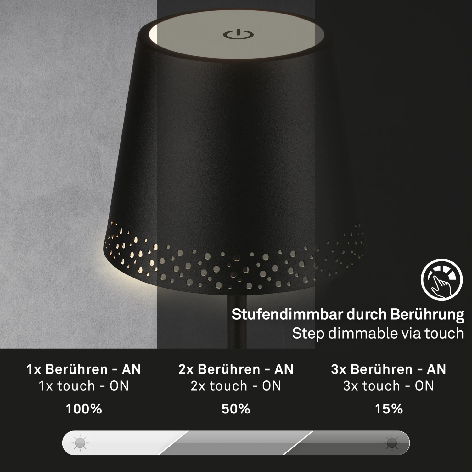 Da die Tischleuchte mit Akku betrieben wird, können Sie sie als tragbare Leuchte überall im Haus einsetzen. Im Flur, Schlafzimmer, Büro, Arbeitszimmer, Esstisch, Wohnzimmer, Kinderzimmer und als Deko auf dem Küchentisch, Esstisch, Schrank und Regal. Die Stange der LED Tischlampe ist zweiteilig und kann durch eine einfache Drehbewegung getrennt werden. Legen Sie die untere Stange beiseite und drehen Sie die obere Stange mit Lampenschirm einfach auf den Sockel. Schon haben Sie eine kompakte Akkulampe und die Höhe von 38 cm auf 22 cm reduziert. Die LED Akku Tischleuchte kann als Schlafzimmerlampe, Schreibtischlampe, Leselampe oder dekorative Lampe verwendet werden. Sie kann durch Berührung in drei Stufen gedimmt werden. Das warmweiße Licht, mit einer Temperatur von 3000 Kelvin, ist ein schöner Akzent bei romantischen und gemütlichen Abenden beim Grillen mit Freunden oder einem Dinner zu zweit. Die kabellose Tischlampe mit Batterie ist durch die Schutzart IP44 vor Spritzwasser geschützt, falls es beim Camping, im Freien, auf der Terrasse oder auf dem Balkon nass wird. Das mitgelieferte USB-C Kabel dient zum Aufladen der LED Lampe. Bei vollständig geladenem Akku kann die LED Akkulampe bei sanftem Licht bis zu 24 Stunden leuchten. Die kabellose Lampe hat einen perforierten Metallschirm und ist 380×120 mm (HxD) groß. Die Farbe ist Schwarz. Lieferumfang: Verlängerungsstück, USB-C-Kabel, Bedienungsanleitung