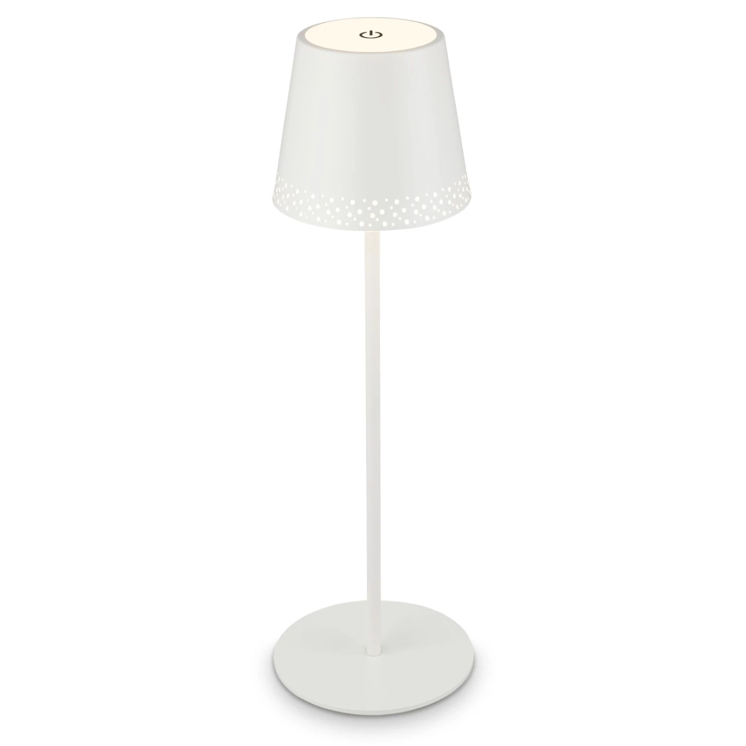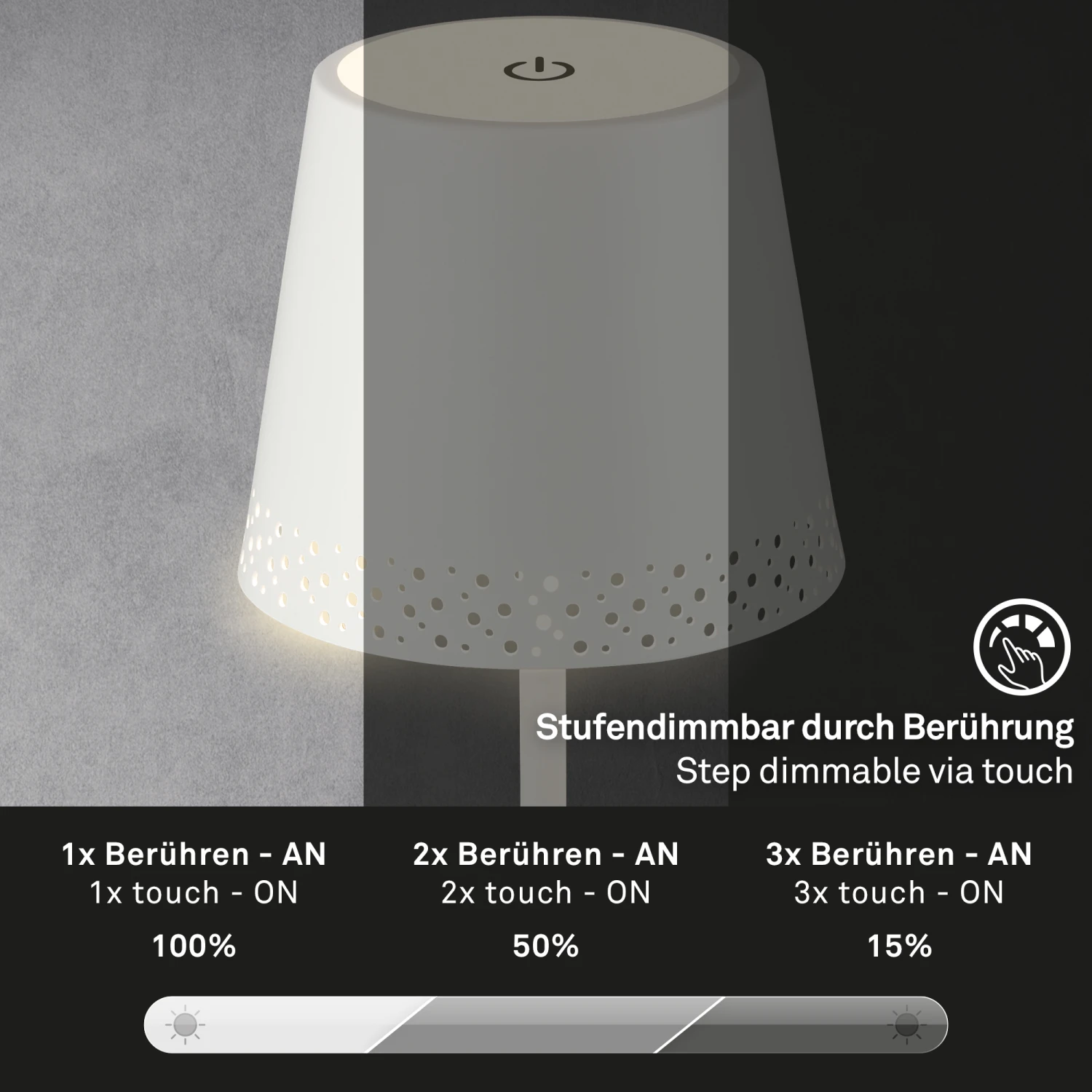 Da die Tischleuchte mit Akku betrieben wird, können Sie sie als tragbare Leuchte überall im Haus einsetzen. Im Flur, Schlafzimmer, Büro, Arbeitszimmer, Esstisch, Wohnzimmer, Kinderzimmer und als Deko auf dem Küchentisch, Esstisch, Schrank und Regal. Die Stange der LED Tischlampe ist zweiteilig und kann durch eine einfache Drehbewegung getrennt werden. Legen Sie die untere Stange beiseite und drehen Sie die obere Stange mit Lampenschirm einfach auf den Sockel. Schon haben Sie eine kompakte Akkulampe und die Höhe von 38 cm auf 22 cm reduziert. Die LED Akku Tischleuchte kann als Schlafzimmerlampe, Schreibtischlampe, Leselampe oder dekorative Lampe verwendet werden. Sie kann durch Berührung in drei Stufen gedimmt werden. Das warmweiße Licht, mit einer Temperatur von 3000 Kelvin, ist ein schöner Akzent bei romantischen und gemütlichen Abenden beim Grillen mit Freunden oder einem Dinner zu zweit. Die kabellose Tischlampe mit Batterie ist durch die Schutzart IP44 vor Spritzwasser geschützt, falls es beim Camping, im Freien, auf der Terrasse oder auf dem Balkon nass wird. Das mitgelieferte USB-C Kabel dient zum Aufladen der LED Lampe. Bei vollständig geladenem Akku kann die LED Akkulampe bei sanftem Licht bis zu 24 Stunden leuchten. Die kabellose Lampe hat einen perforierten Metallschirm und ist 380×120 mm (HxD) groß. Die Farbe ist Weiß. Lieferumfang: Verlängerungsstück, USB-C-Kabel, Bedienungsanleitung