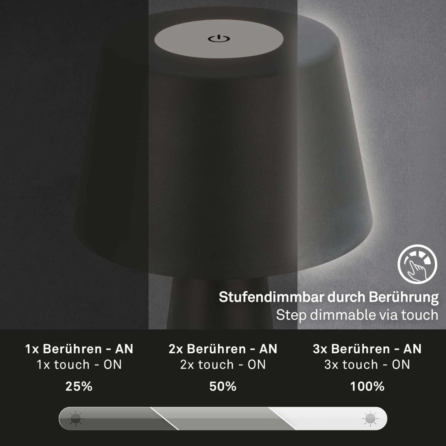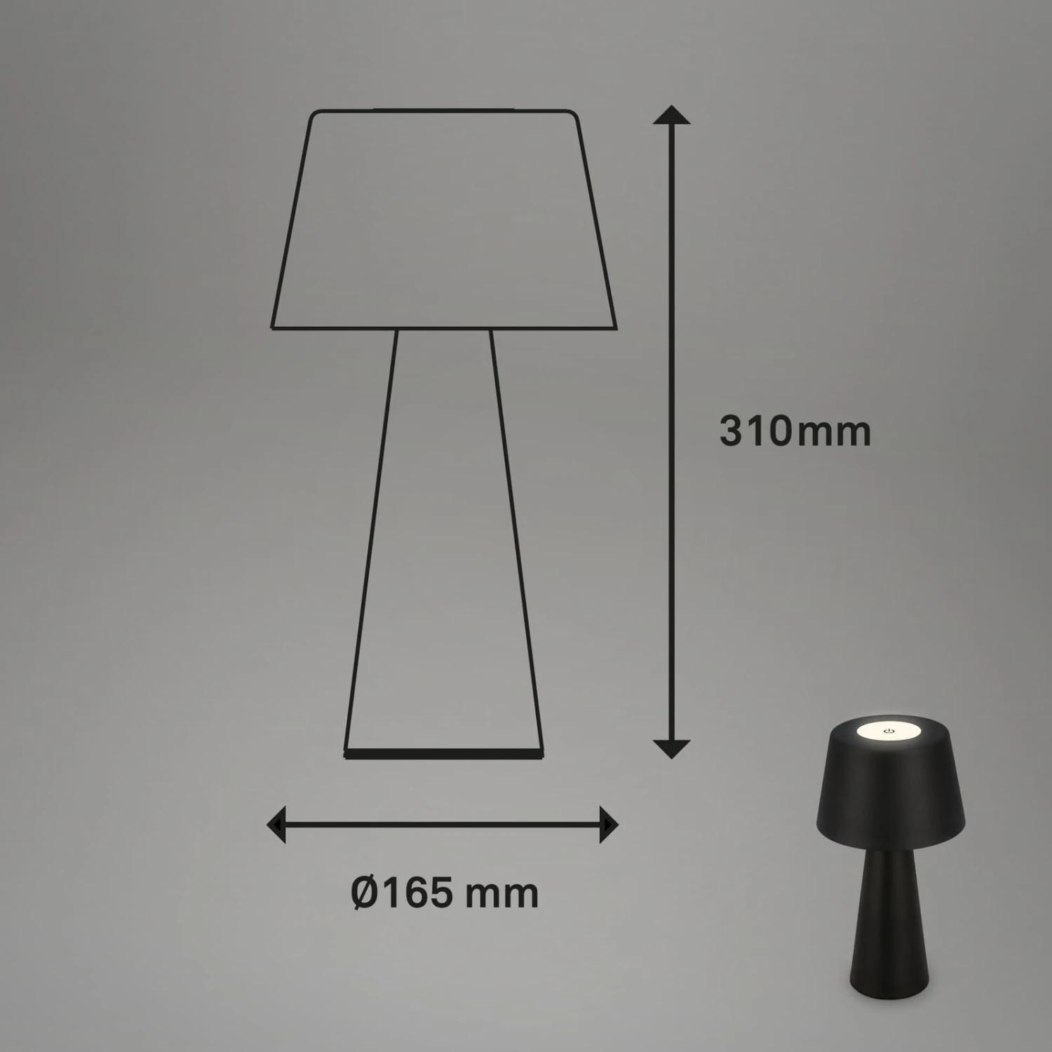 Da die Tischleuchte mit Akku betrieben wird, können Sie sie als tragbare Leuchte überall im Haus einsetzen. Im Flur, Schlafzimmer, Büro, Arbeitszimmer, Esstisch, Wohnzimmer, Kinderzimmer und als Deko auf dem Küchentisch, Esstisch, Schrank und Regal. Die LED Akku Tischleuchte kann als Schlafzimmerlampe, Schreibtischlampe, Leselampe oder dekorative Lampe verwendet werden. Sie kann durch Berührung in drei Stufen gedimmt werden. Das warmweiße Licht, mit einer Temperatur von 3000 Kelvin, ist ein schöner Akzent bei romantischen und gemütlichen Abenden beim Grillen mit Freunden oder einem Dinner zu zweit. Die kabellose Tischlampe mit Batterie ist durch die Schutzart IP44 vor Spritzwasser geschützt, falls es beim Camping, im Freien, auf der Terrasse oder auf dem Balkon nass wird. Das mitgelieferte USB-C Kabel dient zum Aufladen der LED Lampe. Der eingebaute Akku hat im voll aufgeladenen Zustand und sanft eingestellter Helligkeit eine Laufzeit von bis zu 18 Stunden. Die kabellose Lampe hat einen konischen Leuchtenschirm und ist 302×165 mm (HxD) groß. Die Farbe ist Schwarz.