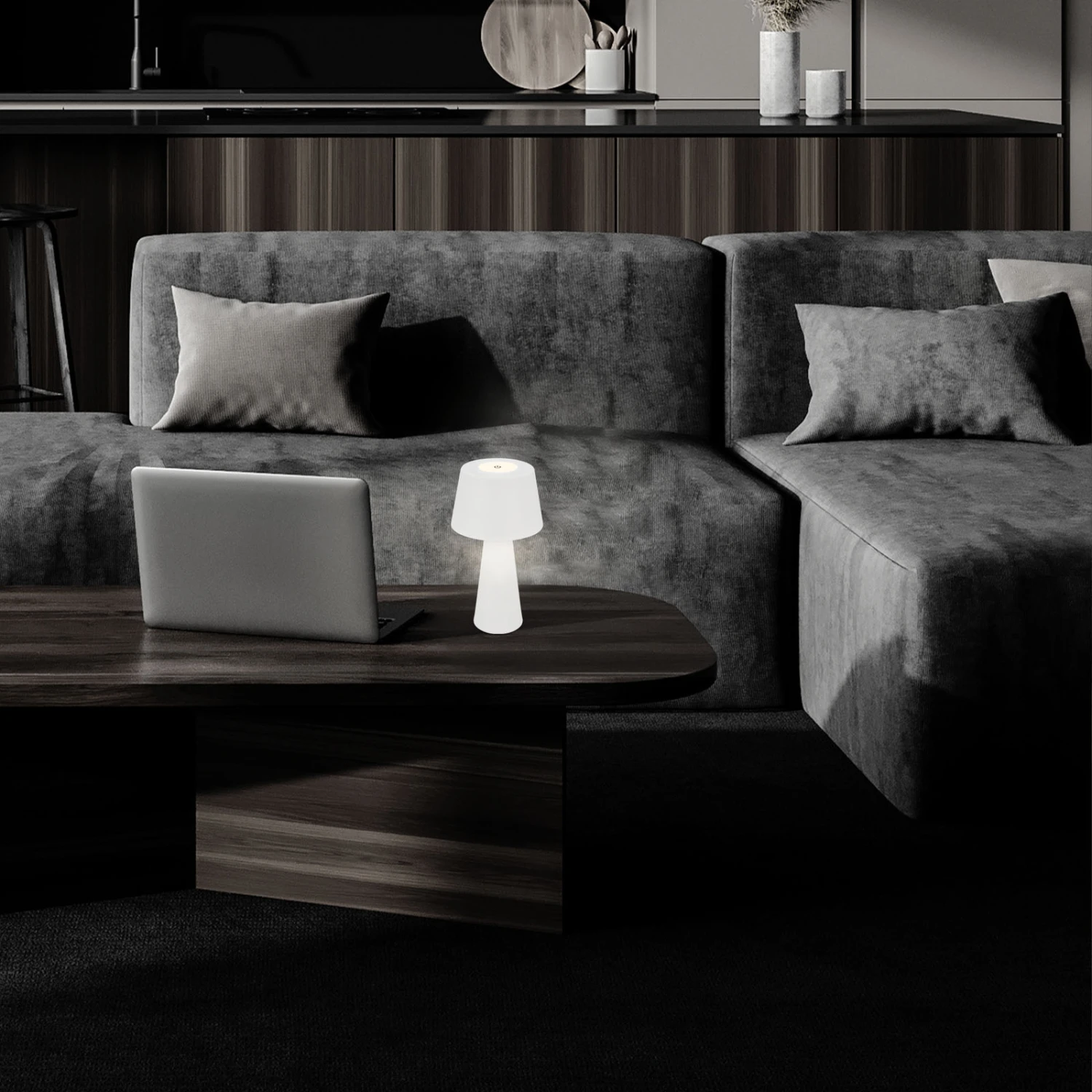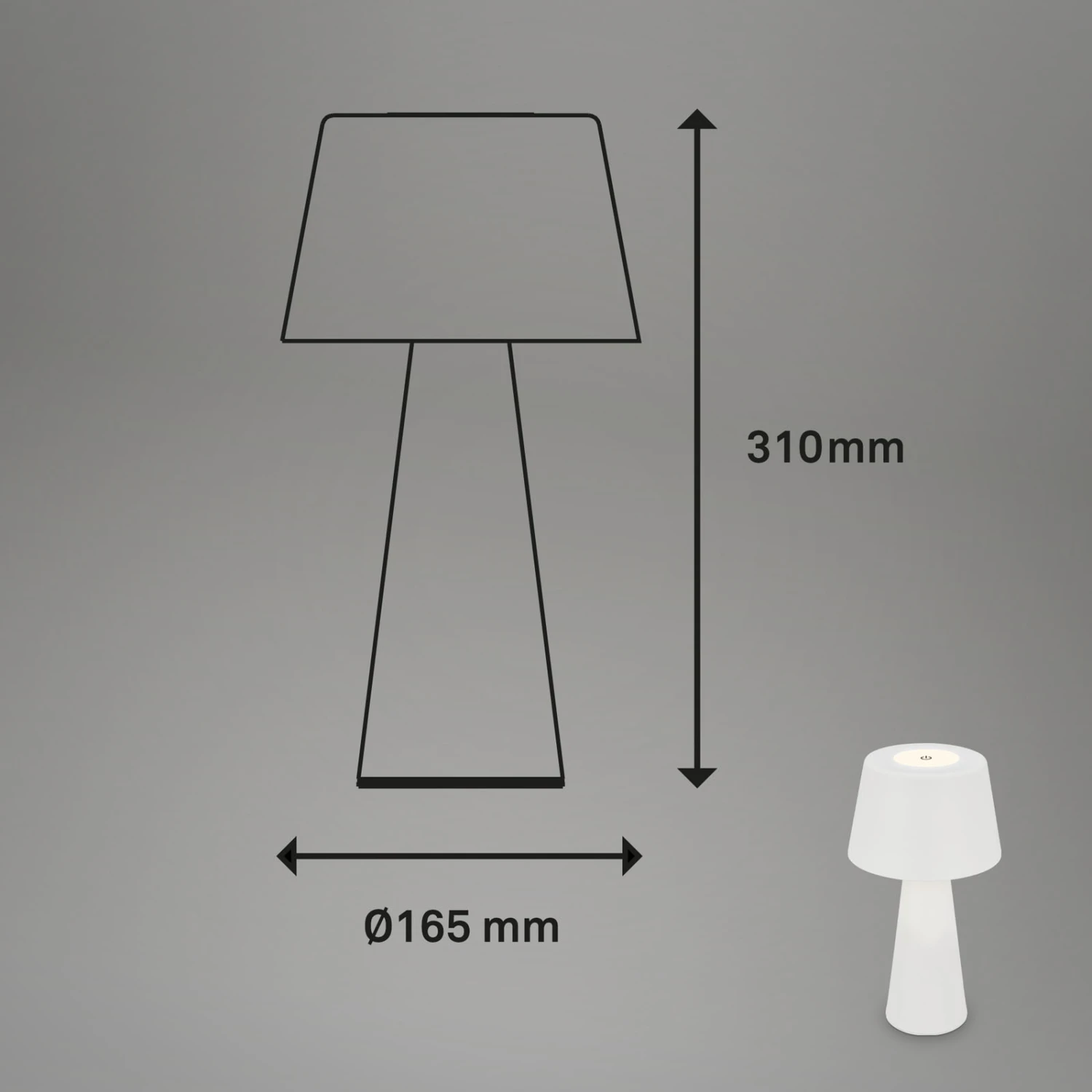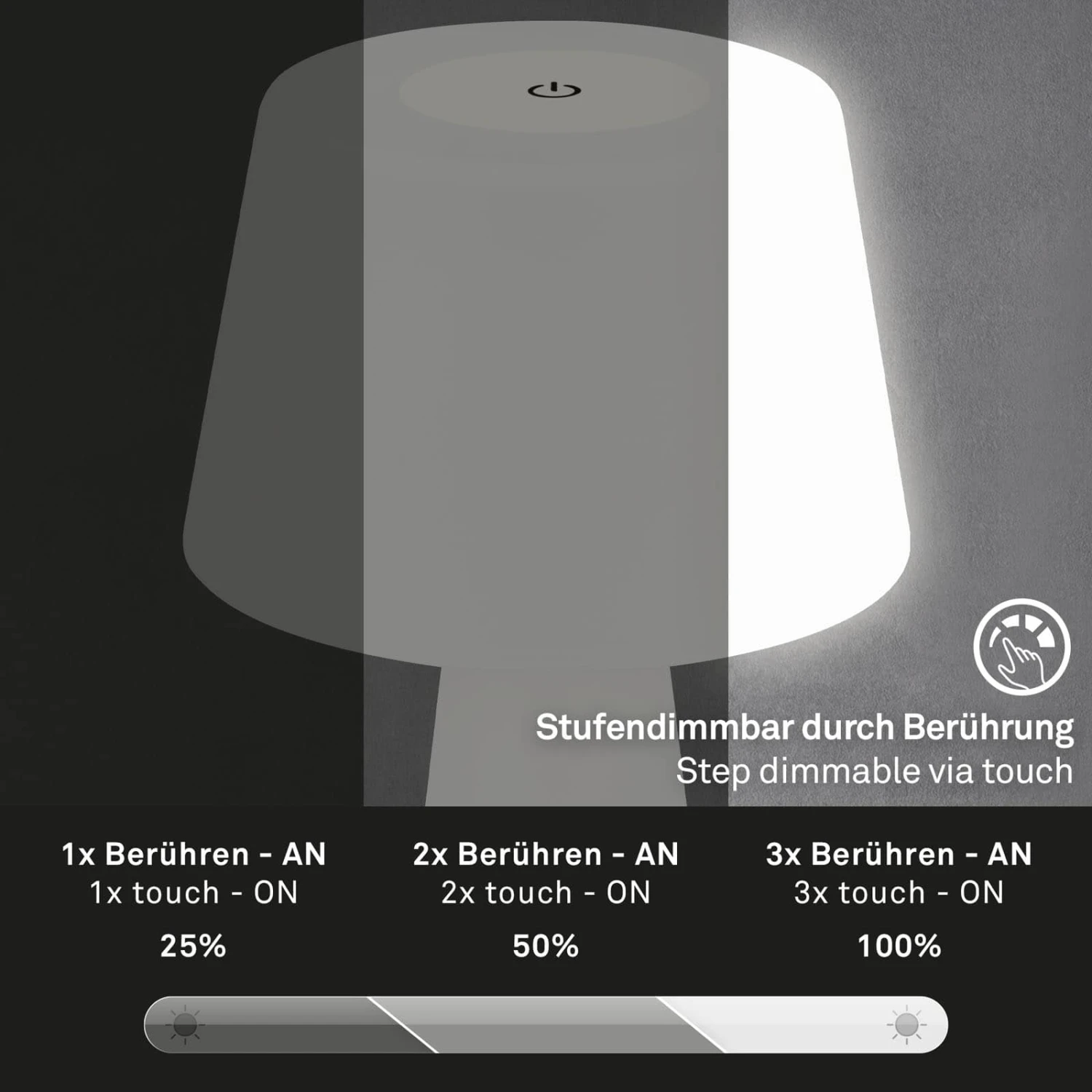 Da die Tischleuchte mit Akku betrieben wird, können Sie sie als tragbare Leuchte überall im Haus einsetzen. Im Flur, Schlafzimmer, Büro, Arbeitszimmer, Esstisch, Wohnzimmer, Kinderzimmer und als Deko auf dem Küchentisch, Esstisch, Schrank und Regal. Die LED Akku Tischleuchte kann als Schlafzimmerlampe, Schreibtischlampe, Leselampe oder dekorative Lampe verwendet werden. Sie kann durch Berührung in drei Stufen gedimmt werden. Das warmweiße Licht, mit einer Temperatur von 3000 Kelvin, ist ein schöner Akzent bei romantischen und gemütlichen Abenden beim Grillen mit Freunden oder einem Dinner zu zweit. Die kabellose Tischlampe mit Batterie ist durch die Schutzart IP44 vor Spritzwasser geschützt, falls es beim Camping, im Freien, auf der Terrasse oder auf dem Balkon nass wird. Das mitgelieferte USB-C Kabel dient zum Aufladen der LED Lampe. Der eingebaute Akku hat im voll aufgeladenen Zustand und sanft eingestellter Helligkeit eine Laufzeit von bis zu 18 Stunden. Die kabellose Lampe hat einen konischen Leuchtenschirm und ist 310×165 mm (HxD) groß. Die Farbe ist Weiß.