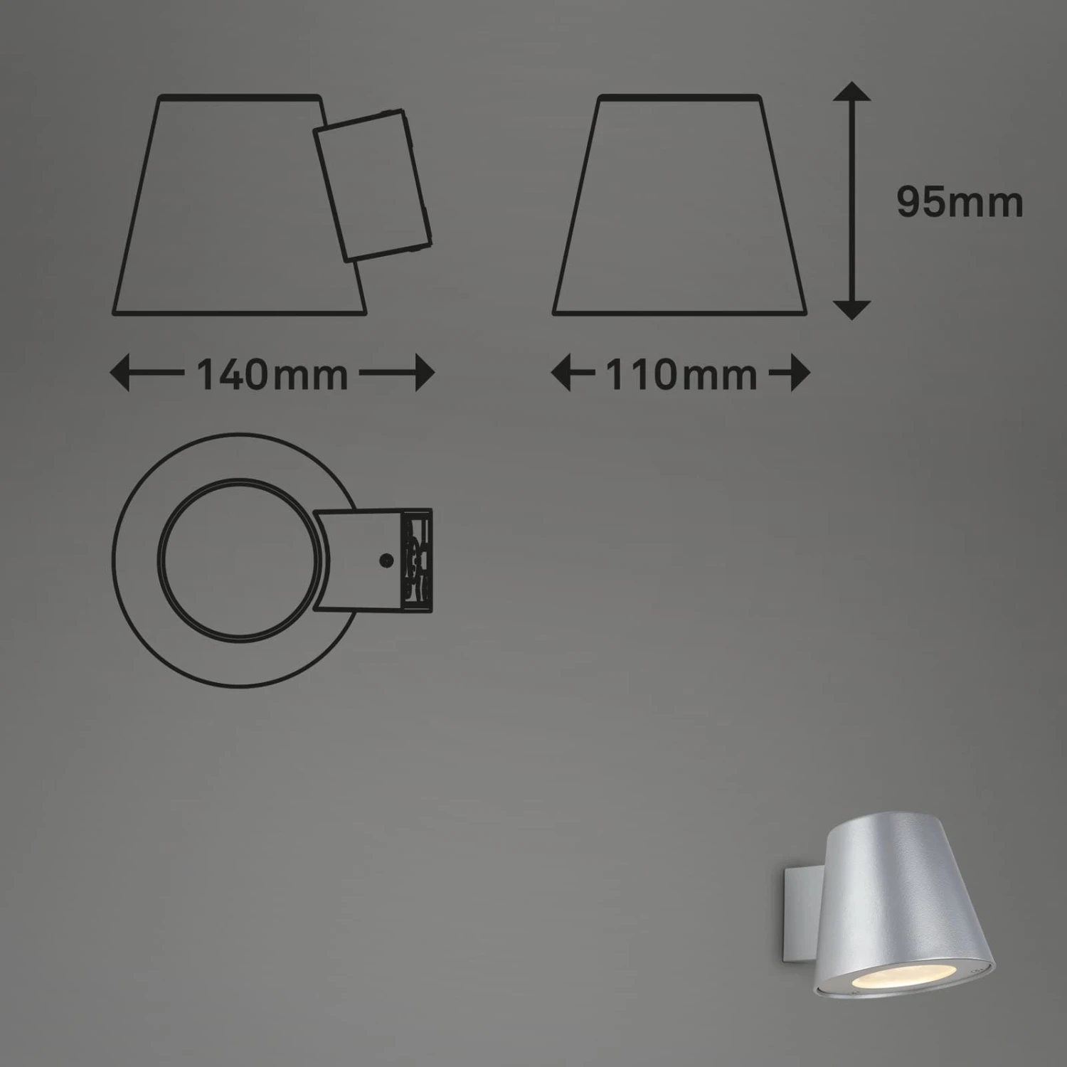 – und Downlight verwendet werden. Die Außenleuchte ist mit der Schutzart IP44 ausgestattet und ist folglich Spritzwassergeschützt. Das kompakte Design ergibt sich durch die Produktmaße 95x110x140 mm (LxBxH)