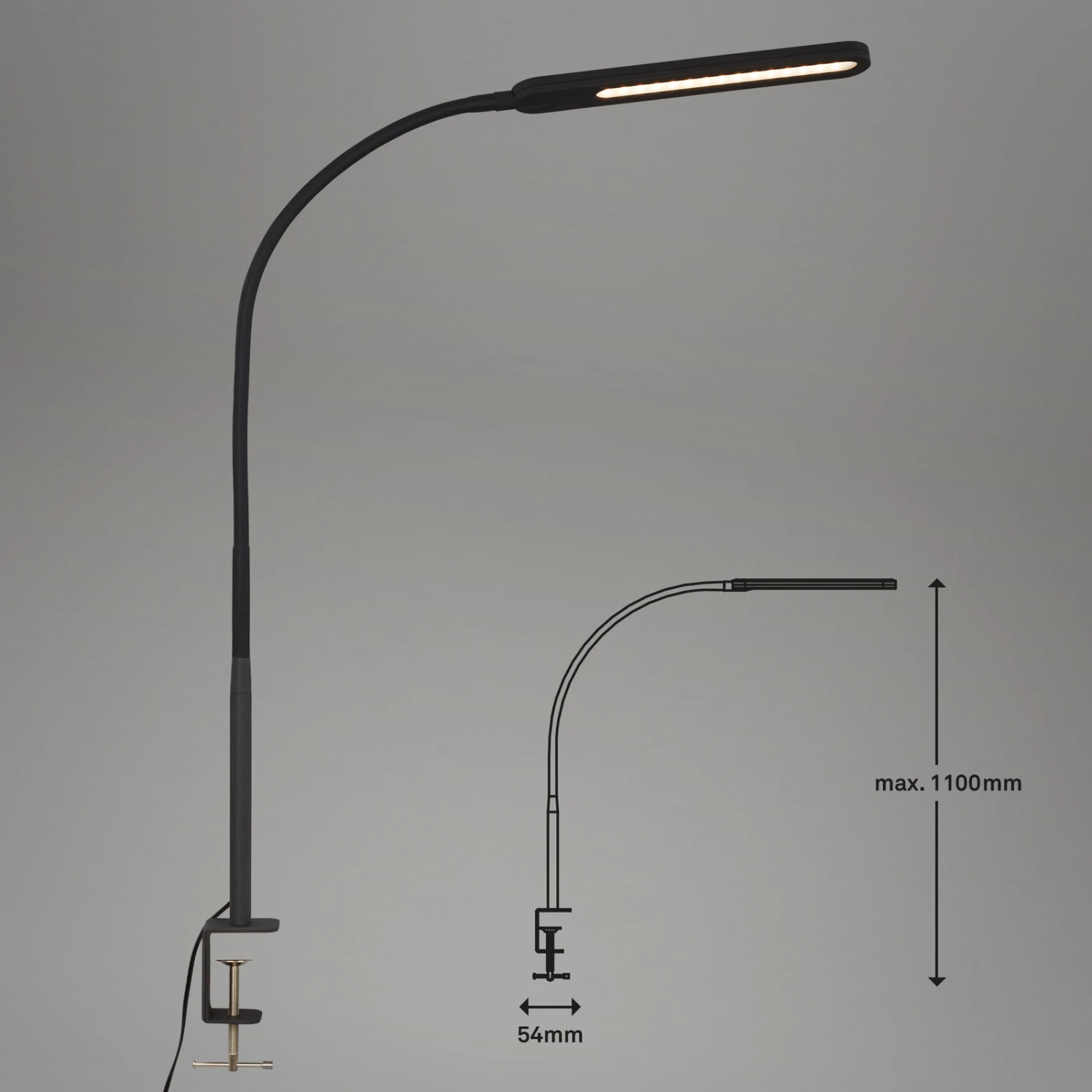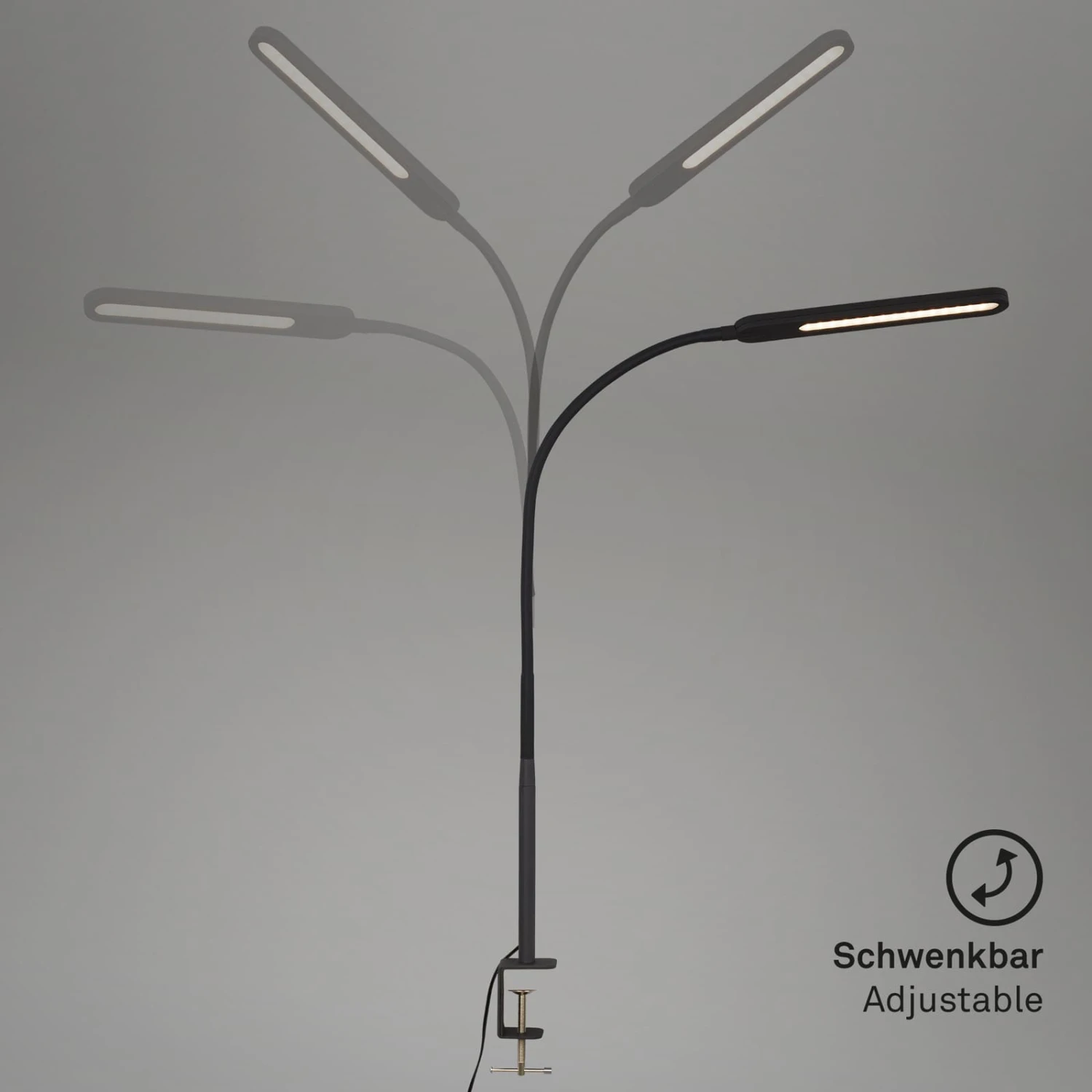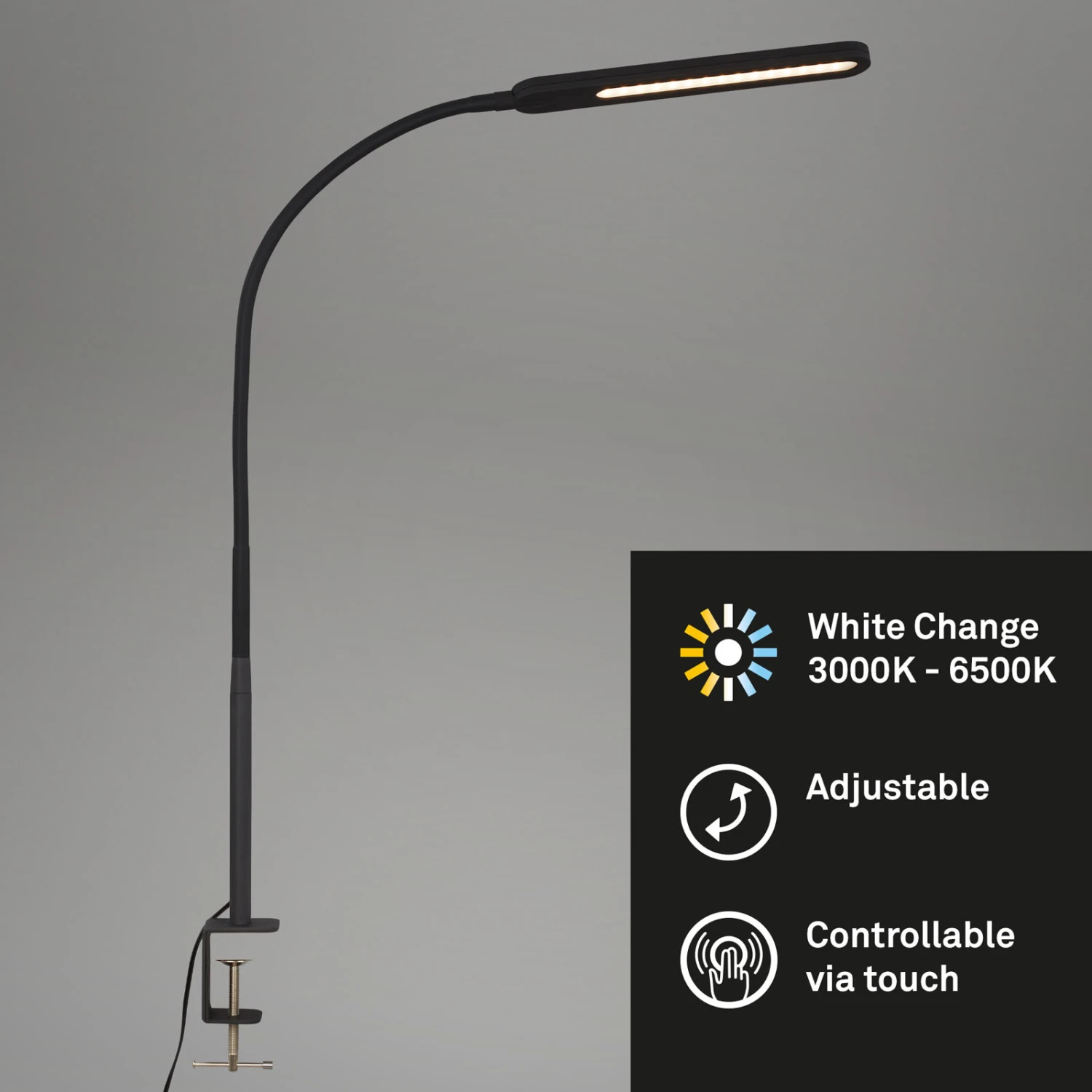 Die LED Klemmleuchte in schwarz bringt gemütliches Licht in Ihr Wohnzimmer oder auf den Schreibtisch und begeistert dabei mit ihrem modernen Design und ihren praktischen Funktionen. Die Farbtemperatur der LED Platine lässt sich in drei Stufen (warmweiß/neutralweiß/tageslichtweiß) einstellen. Auch die Helligkeit des Leuchtmittels kann in Stufen via Touchschalter gedimmt werden