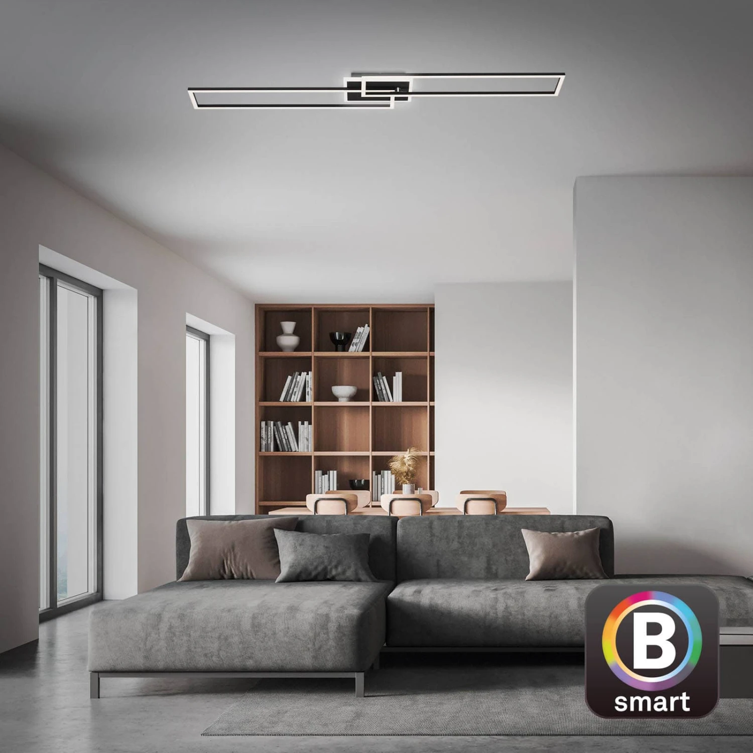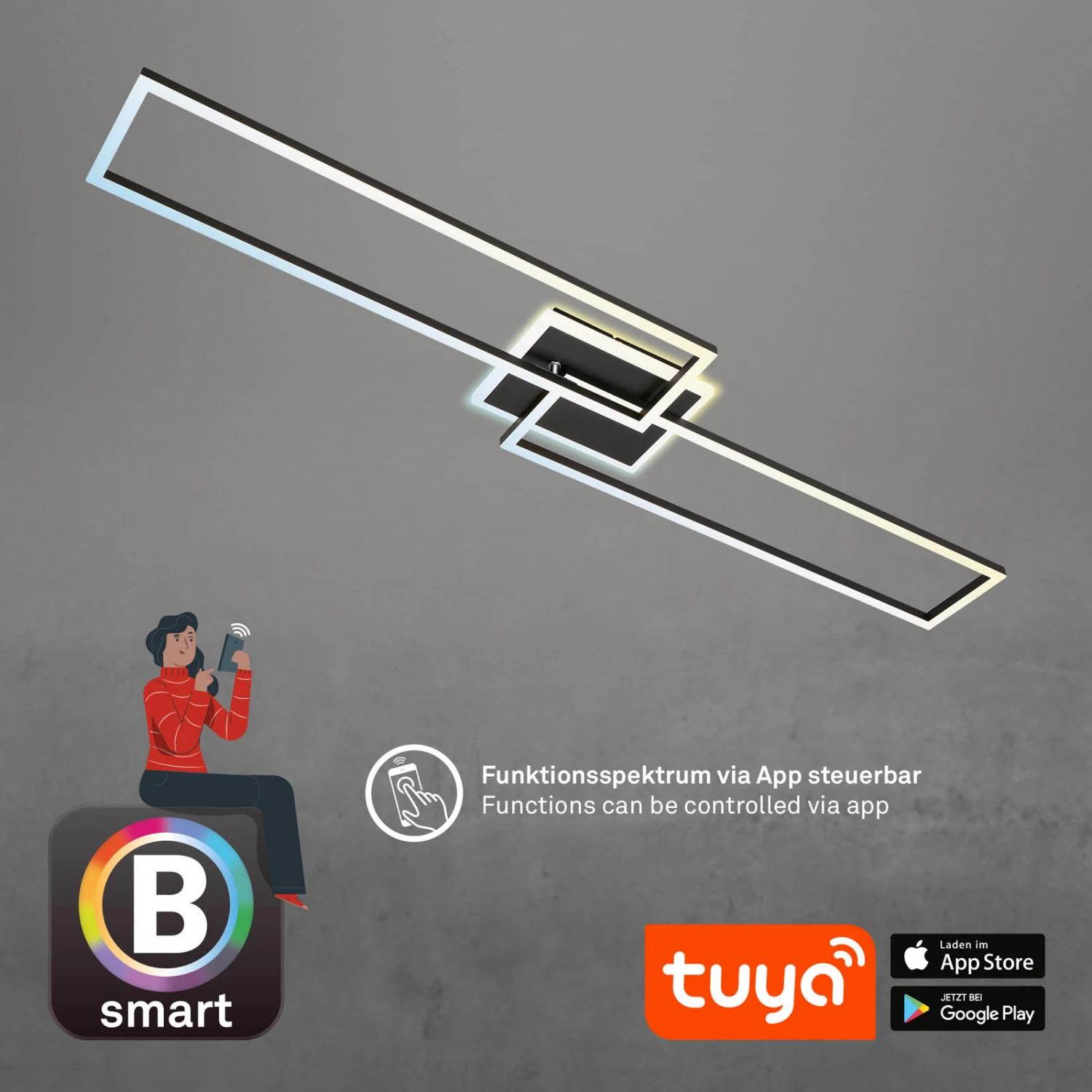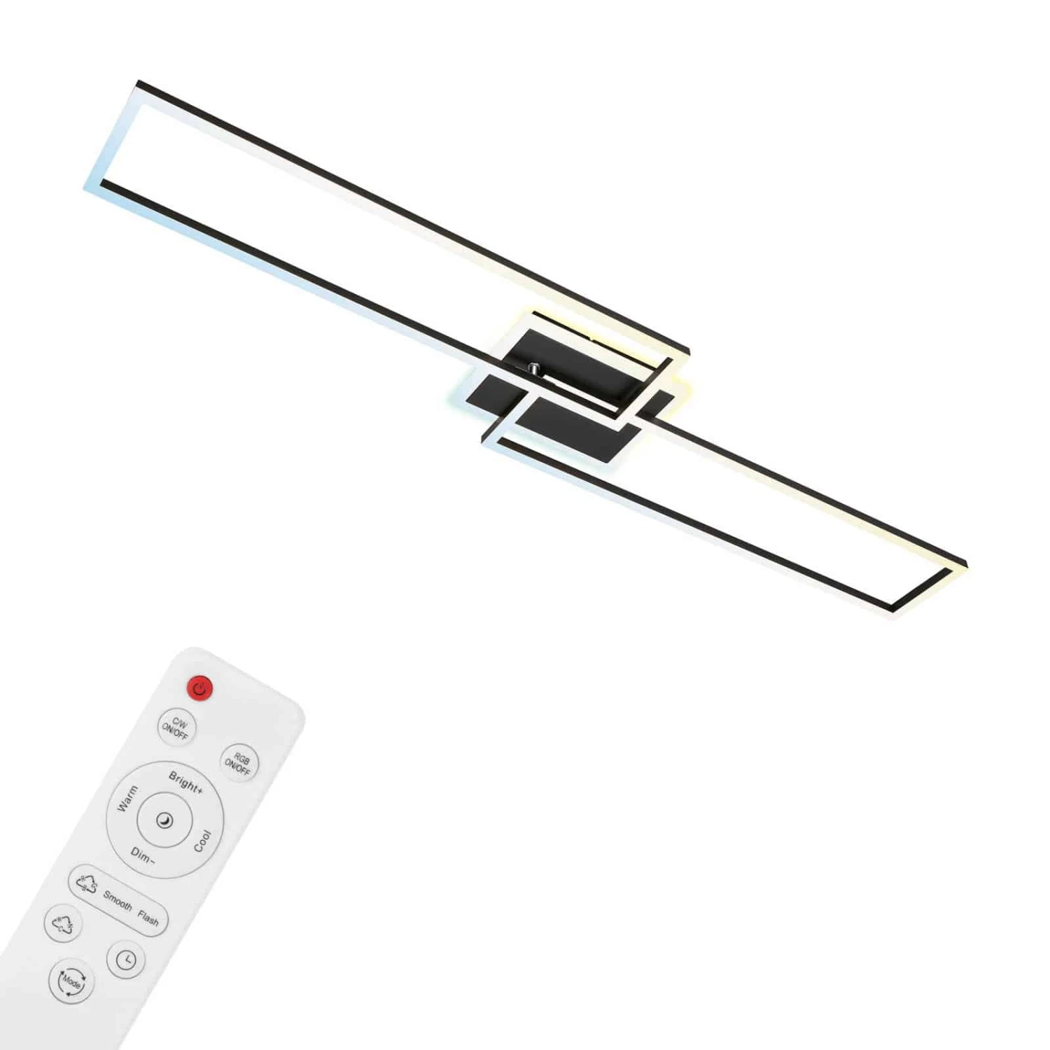 Bei dieser modernen LED Deckenlampe sind ein von zwei LED Modulen drehbar. Sie ist vielseitig einsetzbar z.B. als Wohnzimmerlampe oder Schlafzimmerleuchte. Per mitgelieferter Fernbedienung ist die Leuchte bequem vom Sofa aus anzusteuern. Besonders die Sprachsteuerung über Ihren Sprachassistenten, sowie die smarte Steuerung per App über Ihr Smartphone macht diese Leuchte besonders. Wählen Sie beispielweise Ihre liebste Farbtemperatur aus und passen Sie so die Lichtverhältnisse individuell an Ihre Bedürfnisse an (2700K Â? 6500K). Die ausgewählte Farbtemperatur wird durch die sogenannte Memoryfunktion automatisch abgespeichert. Die Wohnzimmerlampe hat die Schutzart IP20. Produktabmessungen: 1100x248x78 mm (LxBxH).
