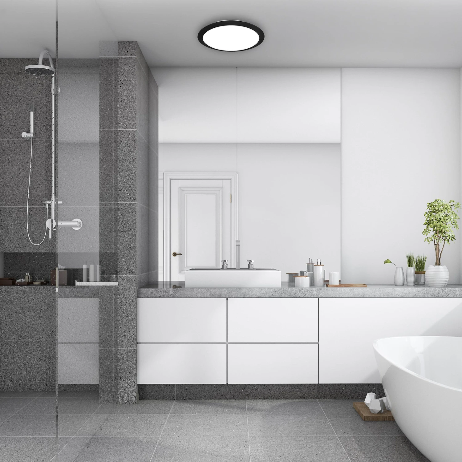 Entdecken Sie unsere vielseitige LED Badezimmerlampe in elegantem Schwarz, die sich perfekt für eine breite Palette von Räumen eignet und eine helle und einladende Atmosphäre mit ihren 1250 Lumen bei lediglich 12W schafft. Gestalten Sie Ihr Raumambiente ganz nach Ihren Wünschen und Anforderungen. Mit einer klaren Farbtemperatur von 4.000K (neutralweiß) erzeugt diese Deckenleuchte ein helles, tageslichtähnliches Licht, das sich ideal für Badezimmer, Flure oder Hauswirtschaftsräume eignet. Die IP44 Zertifizierung macht dieses Design besonders badezimmerfreundlich. Sie vereint stilvolles Design mit Sicherheit, selbst in feuchten Umgebungen, sodass Sie sich bedenkenlos überall im Haus auf stilvolle Beleuchtung verlassen können. Mit ihren kompakten Abmessungen von 310x65mm (DxH) fügt sich diese Deckenlampe nahtlos in verschiedene Räume ein und beansprucht dabei nur wenig Platz. Ob im Bad, Flur, Büro, Balkon, Wohnzimmer, Schlafzimmer, Küche oder Esszimmer
