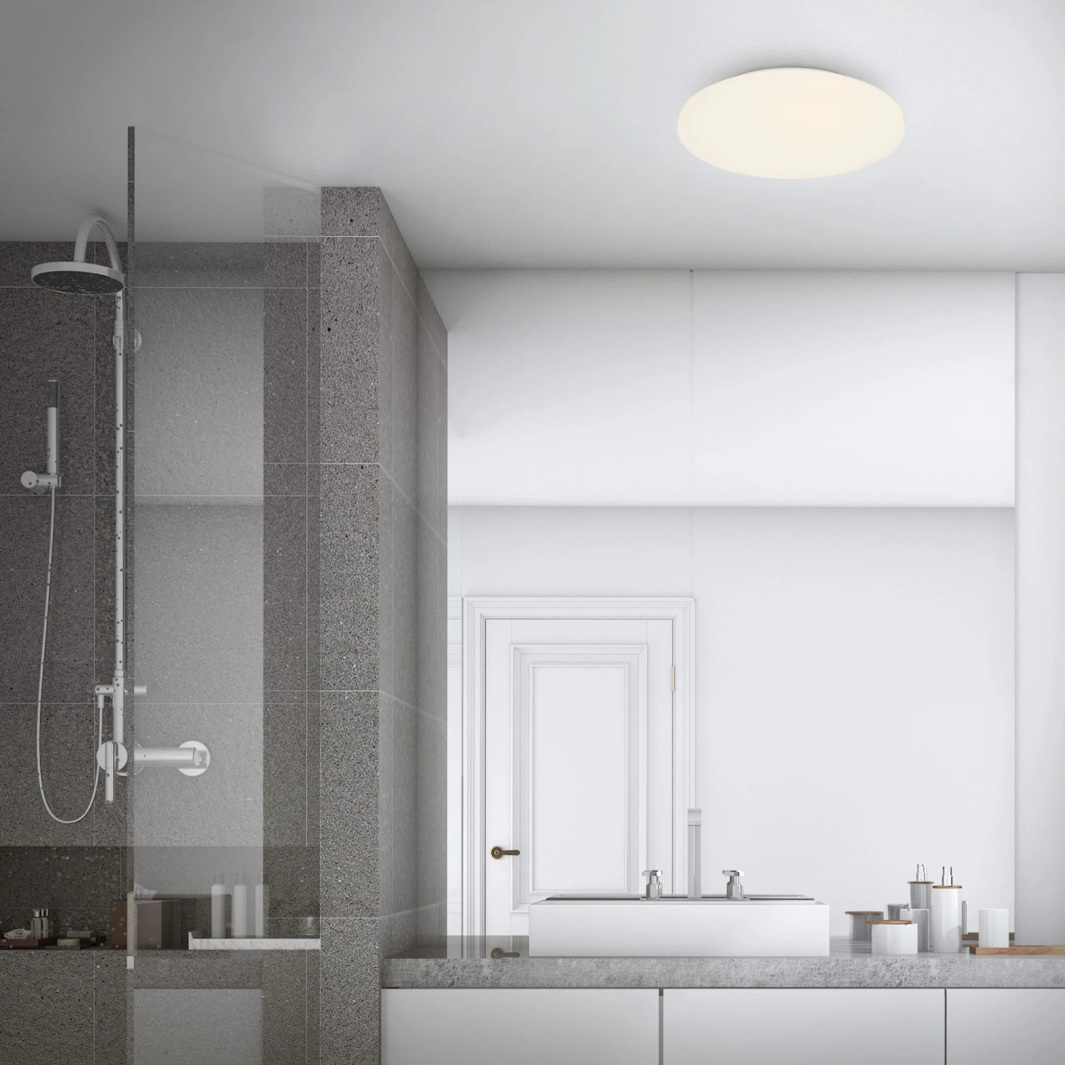 Die LED Deckenleuchte in Kunststoff / weiß ist eine klasse Ergänzung für jedes moderne Zuhause. Mit einer LED-Platine von 24W Leistung und 2600 Lumen Helligkeit liefert die LED Lampe ein helles und klares Licht, das eine romantische Atmosphäre schafft. 3.000 Kelvin erzeugen eine warmweiße Farbtemperatur Â? perfekt zum Entspannen. Diese LED Deckenlampe verfügt über eine lange Lebensdauer von 25.000 Stunden. Die LED Leuchte bietet dafür eine IP44-Schutzart, die vor Feuchtigkeit und Spritzwasser schützt und eine sichere Verwendung im Badezimmer oder anderen Feuchträumen ermöglicht. Mit den Abmessungen von 400×63 mm (DxH) ist die LED Badezimmerlampe eine stilvolle und kompakte Wahl für jede moderne Wohnung oder jedes Haus. Die warmweiße Lichtfarbe der LED Schlafzimmerlampe erzeugt eine einladende Atmosphäre und ist auch ideal für den Wohnbereich, das Schlafzimmer oder Feuchträume geeignet, in dem Sie eine angenehme und entspannte Stimmung schaffen möchten.