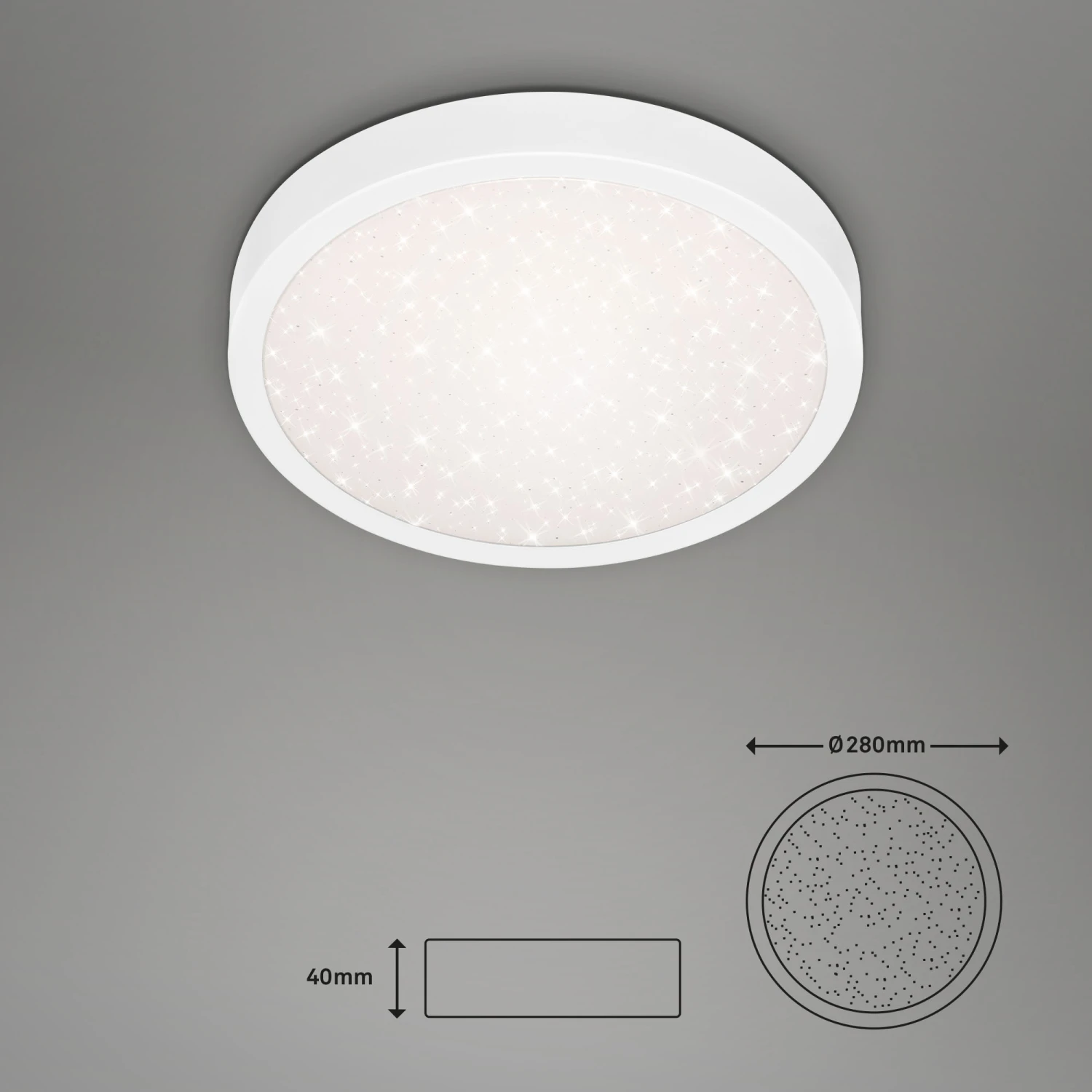 Das Highlight dieser weißen LED Deckenlampe mit weißem Metallrahmen ist das Sternendekor, welches für einen gemütlichen Lichteffekt sorgt und eine ideale Wohlfühlatmosphäre erschafft. Mit einer neutralweißen Farbtemperatur sorgt die Lampe für eine ideale Beleuchtung in Büro, Küche und Flur. Mit 18 Watt und 2000 Lumen wird für viel Helligkeit gesorgt. Die durchschnittliche Lebensdauer liegt bei ca. 25.000 Stunden. Die Schutzart der Leuchte ist IP20. Produktabmessungen: 280×40 mm (DxH)
