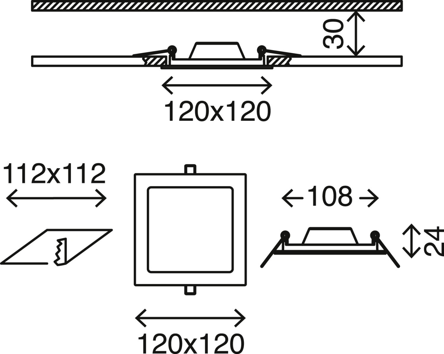 FLAT-IN LED Einbauleuchte Kunststoff / matt-nickel inkl. 1 x LED-Platine 7W 600lm 4.000K Lebensdauer 25.000h, Ra>=80 nicht dimmbar IP44 120x120mm (LxB) Einbaumaß: 112x112x30mm (LxBxH)