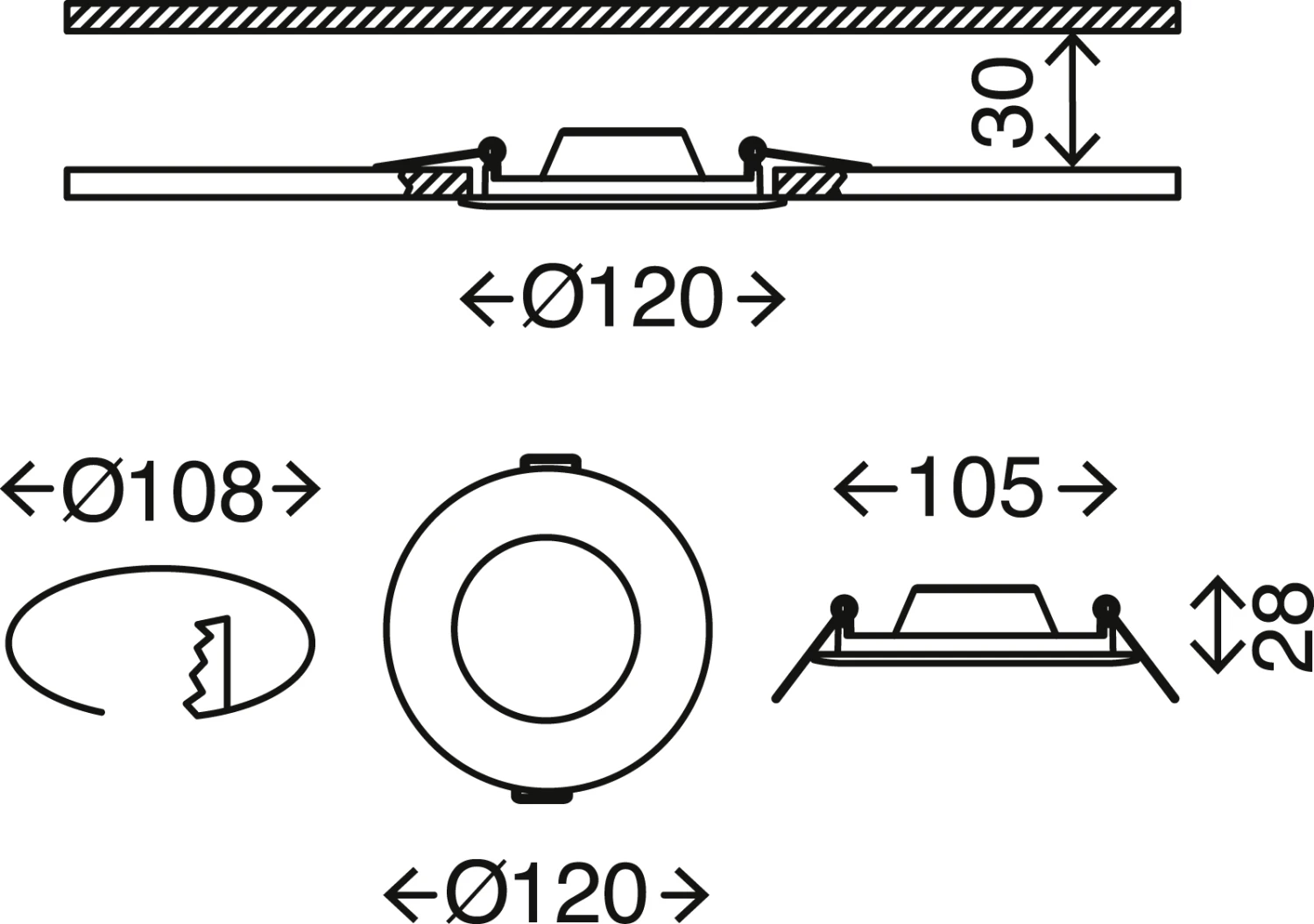 – dimmbar Kunststoff / matt-nickel inkl. 1 x LED-Platine 7W 600lm 4.000K Lebensdauer 25.000h, Ra>=80 in Stufen dimmbar IP44 120mm (D), Einbaumaß: 108x30mm (DxH)
