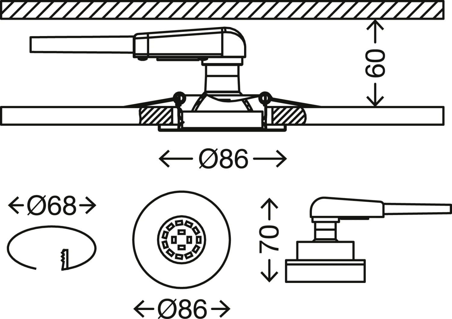 LED Einbauleuchten 1-flammig Metall / chrom inkl. 1 x LED/GU10 5W 400lm 3.000K Lebensdauer 20.000 h, Ra>=80, nicht dimmbar, schwenkbar IP23 / Schutzklasse II 86x70mm (DxH) Einbaumaß 68mm (D)