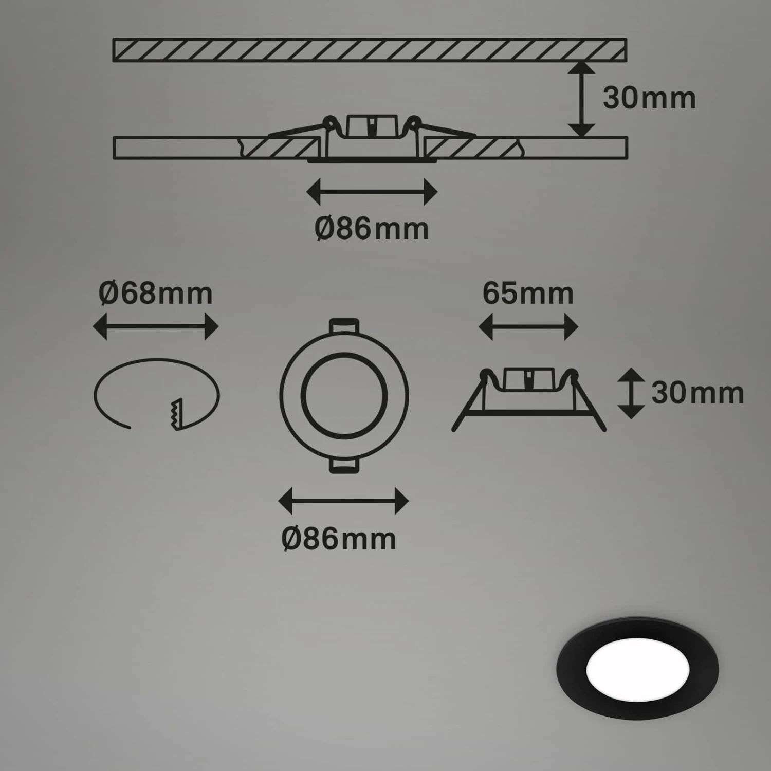 – und Werkstattleuchten eingesetzt werden. Mit je 3 Watt und je 350 Lumen Lichtleistung überzeugen die LED-Module auf ganzer Linie. Mit einer Farbtemperatur von 4.000 Kelvin wird ein neutralweißer Lichtton erzeugt. Die durchschnittliche Lebensdauer beträgt etwa 20.000 Stunden. Die LED-Spots sind ultraflach, mit Produktabmessungen von 86×30 mm (DxH), und Einbaumaßen von 68×30 mm (DxH). Die Produktfarbe ist Schwarz.