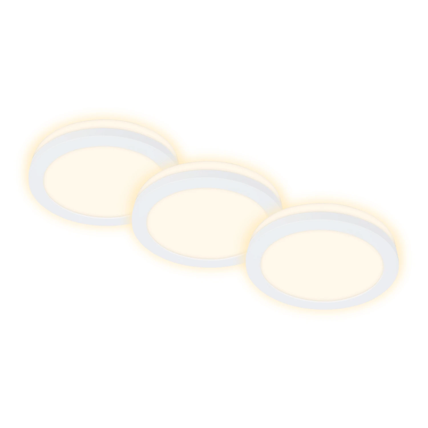 Der hochwertige, weiße Rahmen und ein dezenter Backlighteffekt, der für eine leichte, indirekte Beleuchtung sorgt, sind die beiden USPs dieser modernen LED-Einbauleuchte im 3er Set. Der hinterschnittene Rahmen schafft einen Abstand zwischen den LED-Spots und der Wohnzimmerdecke. Hierdurch liegen die LED Spots nichts bündig an, was sie von herkömmlichen LED Einbauleuchten unterscheidet. Es wird ein sanftes indirektes Licht abgegeben, das die Decke indirekt anleuchtet. Die LED-Einbaulampen sind spritzwassergeschützt und können dank ihrer IP44-Schutzzertifizierung auch als Badezimmerleuchten eingesetzt werden. Mit 3 Watt und 350 Lumen Helligkeit überzeugen die LED-Module auf ganzer Linie. Mit einer Farbtemperatur von 3.000 Kelvin wird ein warmweißer Lichtton erzeugt. Die Produktabmessungen der LED-Deckeneinbaustrahler lauten wie folgt: 84×36,5 mm (DxH) bei einem Einbaumaß von 60x 30 mm (DxH). Die Produktfarbe ist Weiß.