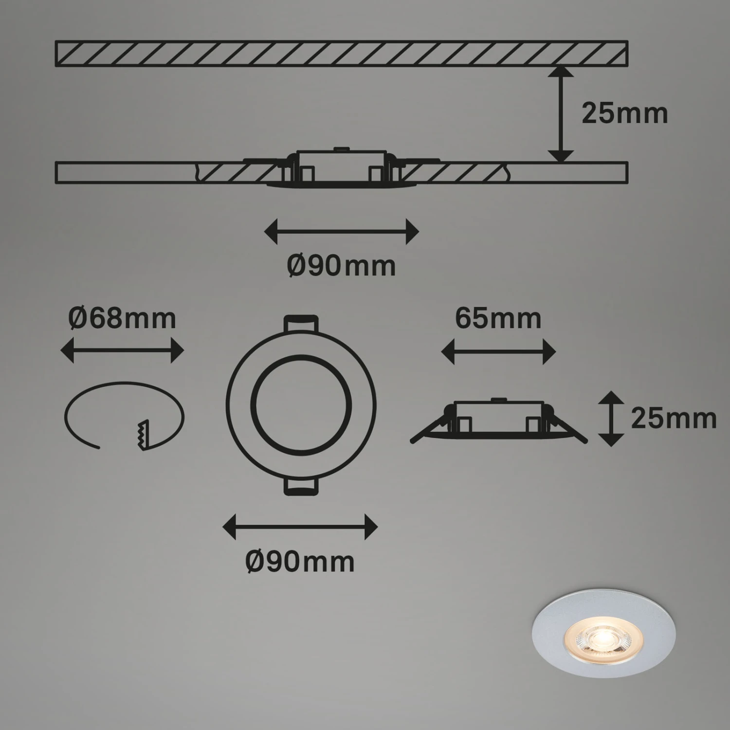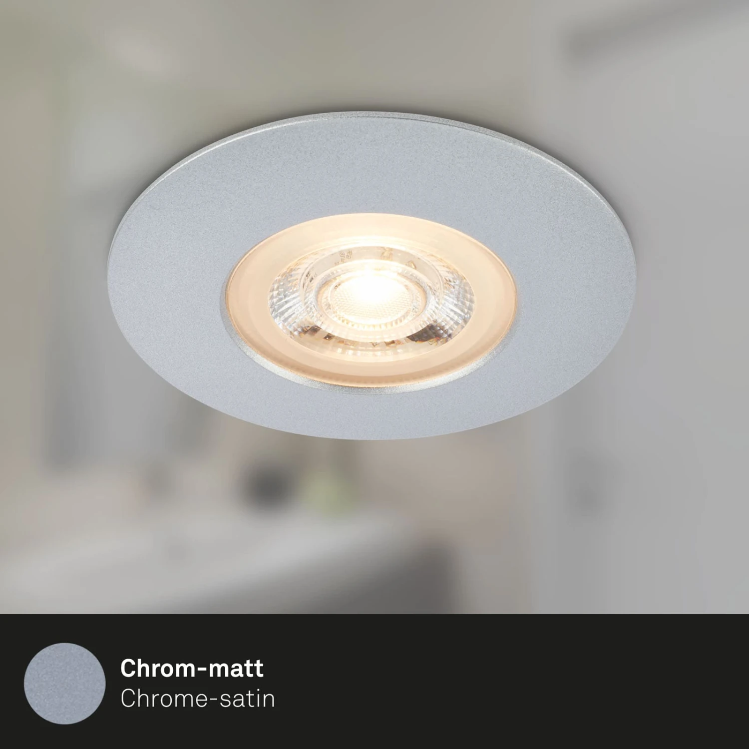 – und Werkstattleuchten eingesetzt werden. Mit je 5 Watt und je 480 Lumen Lichtleistung überzeugen die LED-Module auf ganzer Linie. Mit einer Farbtemperatur von 3.000 Kelvin wird ein warmweißer Lichtton erzeugt. Die durchschnittliche Lebensdauer beträgt etwa 25.000 Stunden. Die LED-Spots sind ultraflach, mit Produktabmessungen von 90×25 mm (DxH), und Einbaumaßen von 68×30 mm (DxH). Die Produktfarbe ist Chrom-Matt.