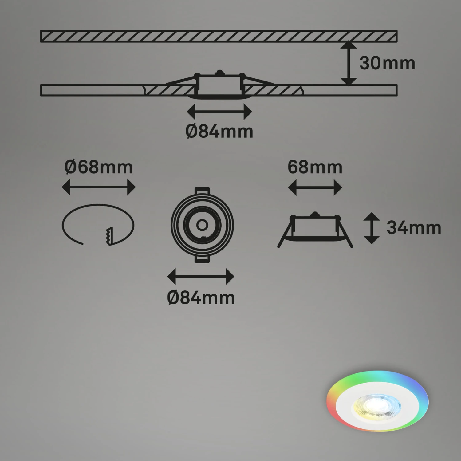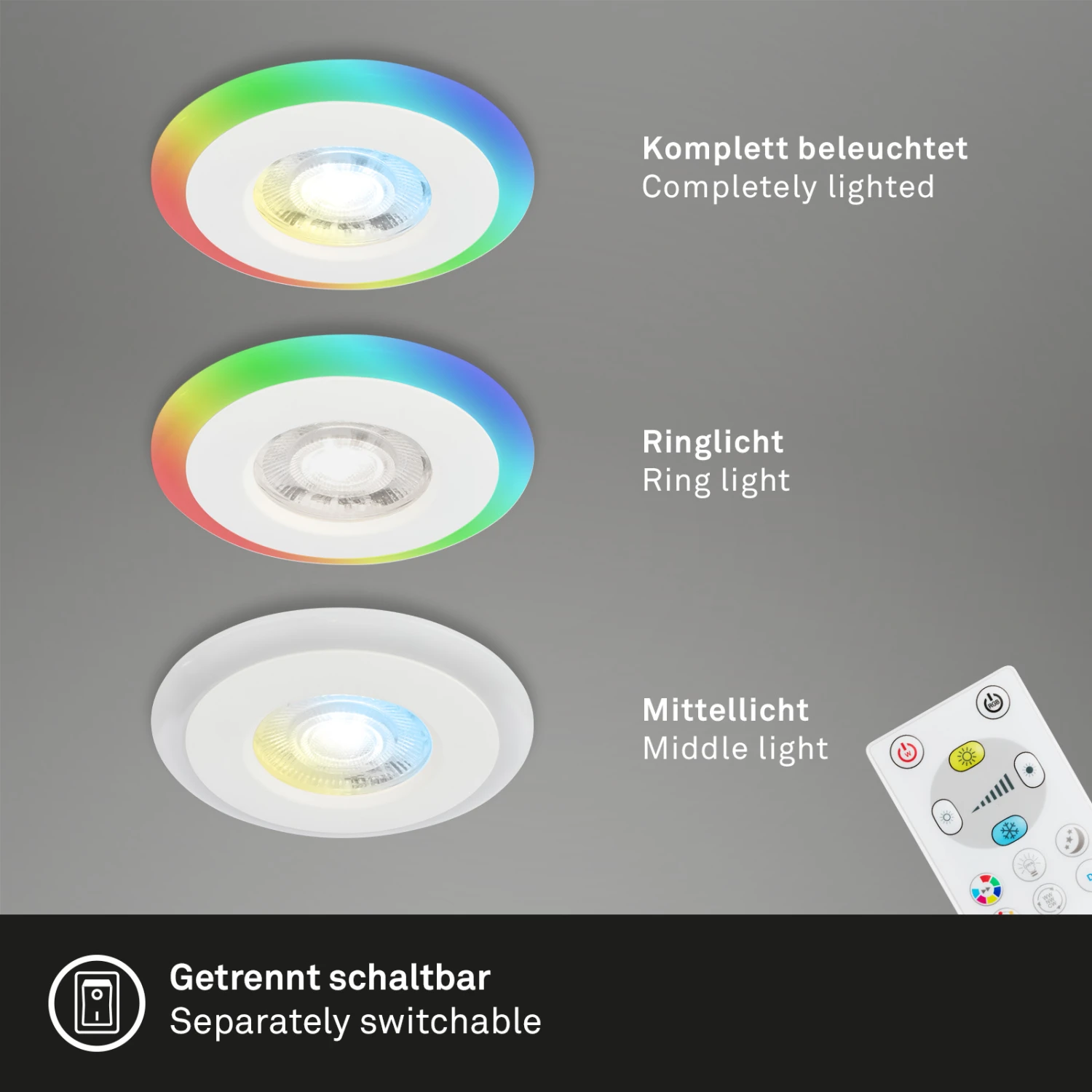 Die Funktionalität dieses Sets aus drei Deckeneinbauleuchten steht im Mittelpunkt. Sie sind für den Einsatz im Badezimmer geeignet und verfügen über eine 3-stufig regelbare Lichtoption in bunten Farben und verschiedenen Farbtemperaturen sowie über eine Zeitschaltuhr und eine Nachtlichtfunktion. Mit der mitgelieferten Fernbedienung können Sie den äußeren Lichtring in RGB-Farben selbstständig einschalten. Auch die innere Lichtquelle lässt sich in verschiedenen Weißtönen verändern und dimmen, von Warmweiß bis Kaltweiß (3000-6500K). Schließlich können sowohl die äußere als auch die innere Lichtquelle gleichzeitig eingeschaltet werden. Die RGB-Farben können aus einer Reihe von 7 voreingestellten Farben ausgewählt werden oder in einem dynamischen Farbverlauf durchlaufen werden. Die Timerfunktion ermöglicht das selbstständige Ausschalten der Einbauleuchten nach 30 Minuten. Die angegebene Nachtlichtfunktion reguliert das Licht auf warmweiße 3000 Kelvin bei einer sehr niedrigen Dimmstufe. Die LED-Spots sind durch die Schutzart IP44 vor Spritzwasser geschützt. Damit sind sie für den Einsatz in Ihrem Bad geeignet. Die Deckeneinbauleuchten für das Badezimmer haben eine Größe von 84×34 mm, bei einem Einbaumaß von 68×30 mm. Damit sind die LED-Leuchten extrem flach. Mit je 5 Watt bei je 460 Lumen bieten die LED Einbaulampen viel Helligkeit. Die Produktfarbe ist Weiß.